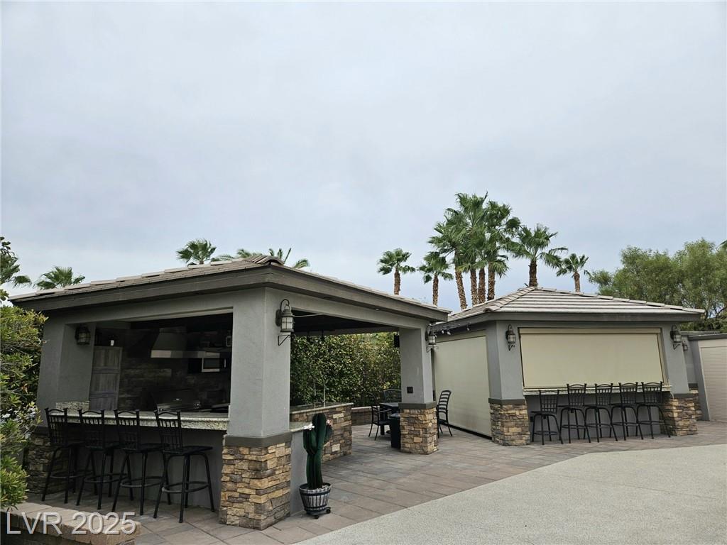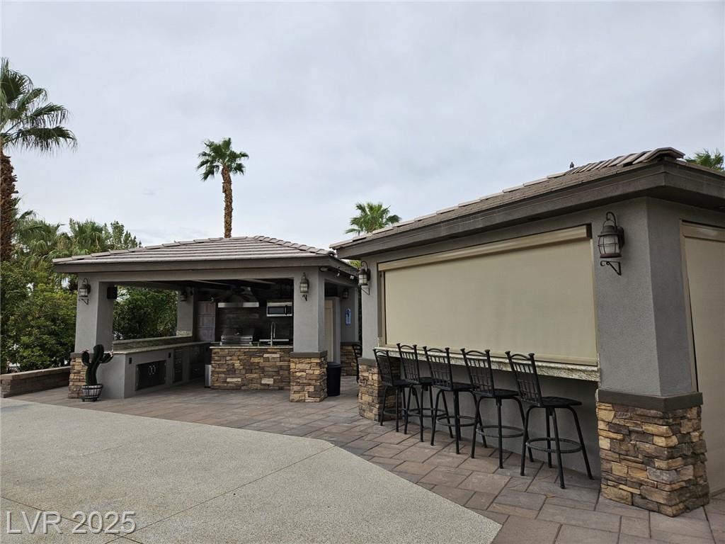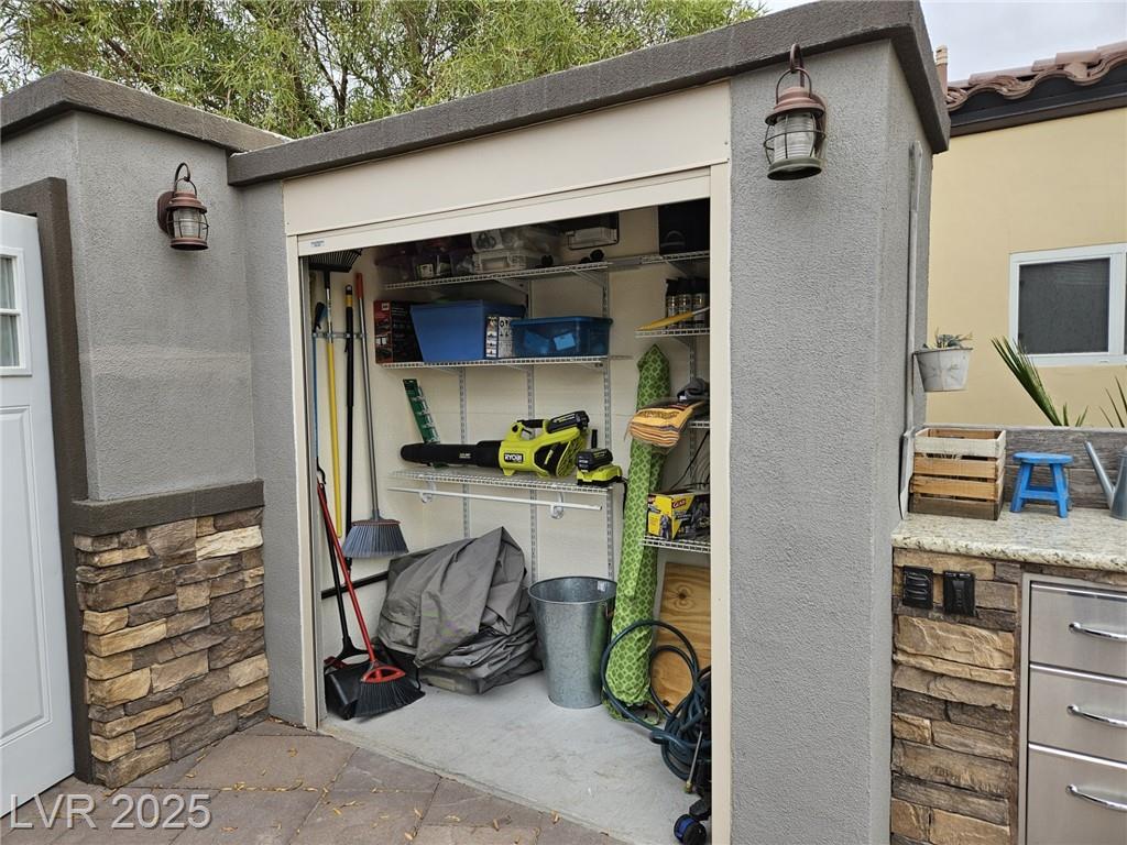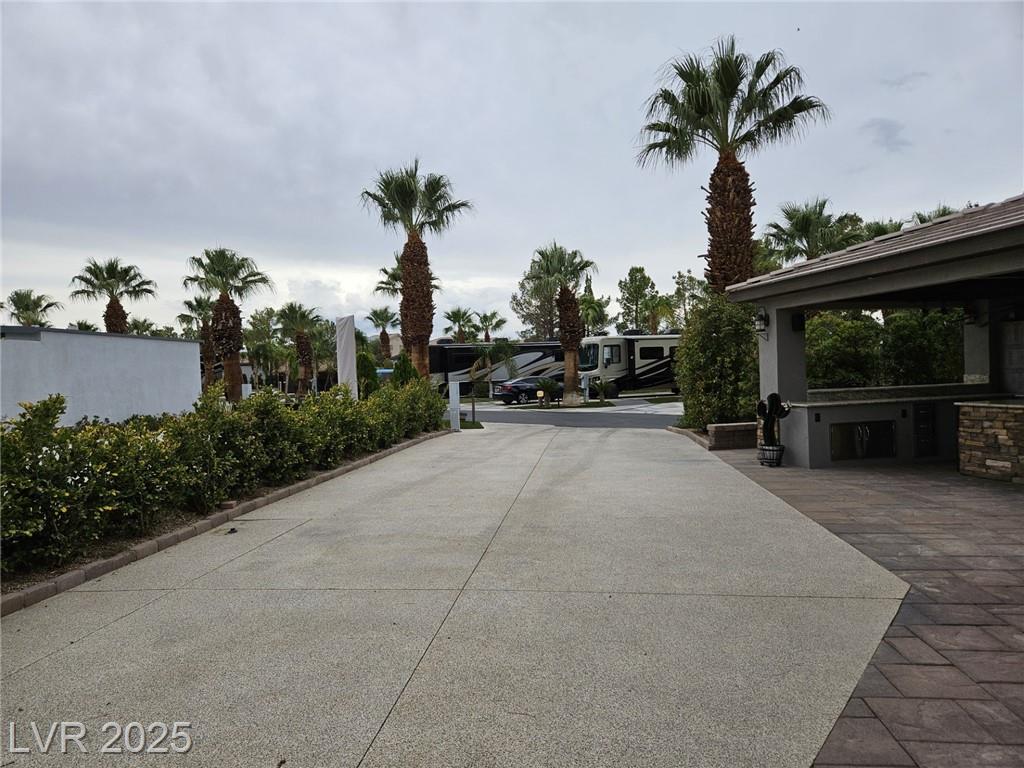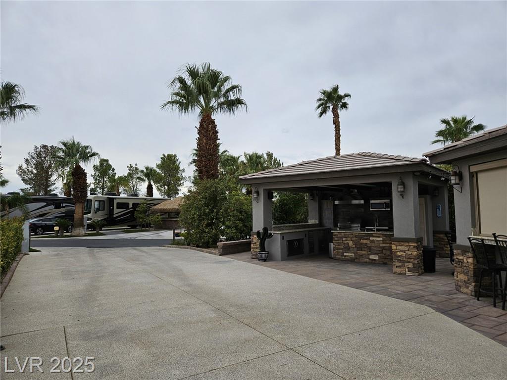 Located in the guard gated Las Vegas Motor Coach Resort, this stunning site is total perfection! This super large and private corner site around the corner from the clubhouse has it all including mature and lush landscaping for plenty of privacy! No expense was spared when designing this hard roof structure buildout featuring a chef’s gourmet kitchen, range hood, full size fridge, dishwasher, sink, bar seating, and granite counters. The living room area includes privacy shades, a ceiling heater, huge TV niche, Polk audio sound system, built-in fire pit, and custom lighting. The rear of the site features a comfort station, two storage sheds with washer/dryer, water softener, and laundry sink. You will NOT be disappointed! OWNER WILL CARRY!