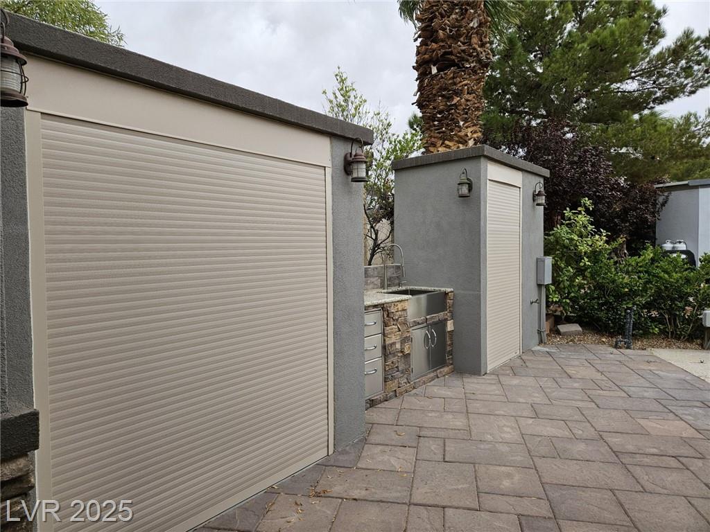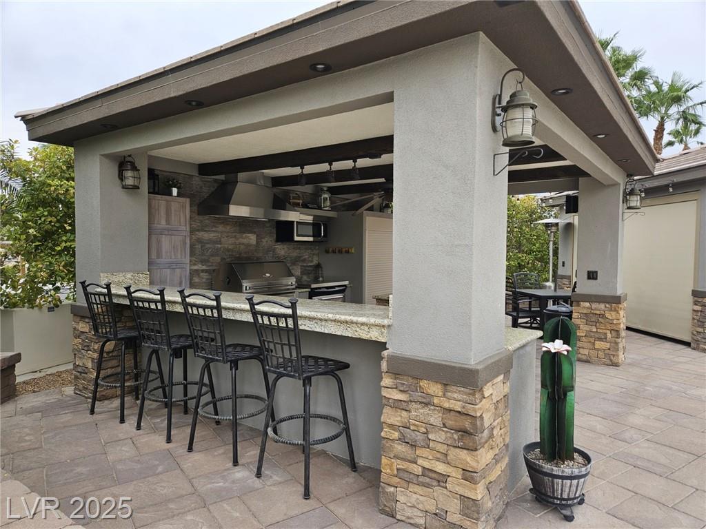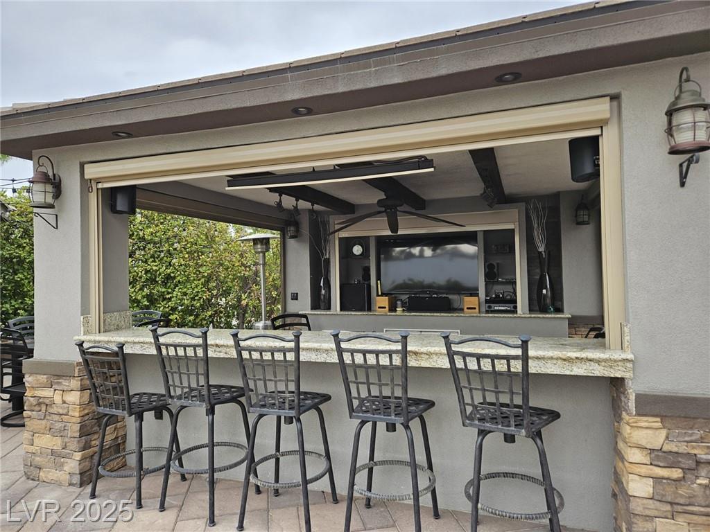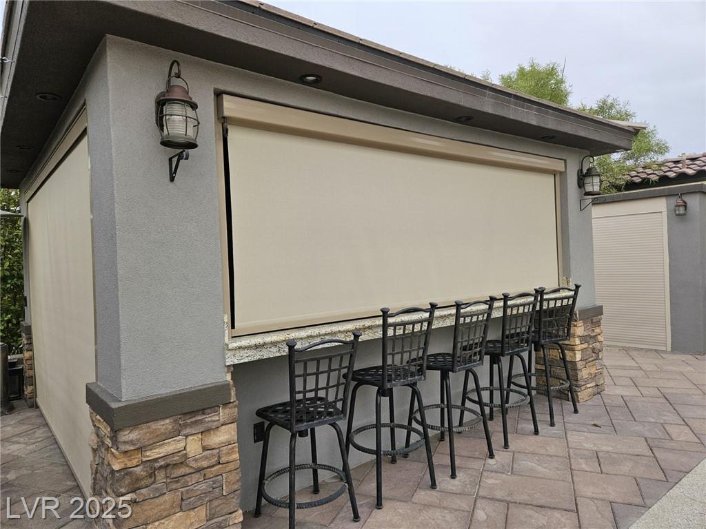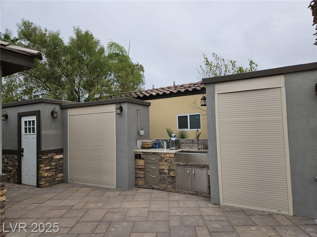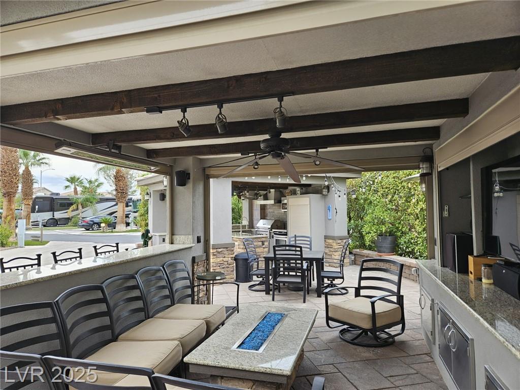 Located in the guard gated Las Vegas Motor Coach Resort, this stunning site is total perfection! This super large and private corner site around the corner from the clubhouse has it all including mature and lush landscaping for plenty of privacy! No expense was spared when designing this hard roof structure buildout featuring a chef’s gourmet kitchen, range hood, full size fridge, dishwasher, sink, bar seating, and granite counters. The living room area includes privacy shades, a ceiling heater, huge TV niche, Polk audio sound system, built-in fire pit, and custom lighting. The rear of the site features a comfort station, two storage sheds with washer/dryer, water softener, and laundry sink. You will NOT be disappointed! OWNER WILL CARRY!