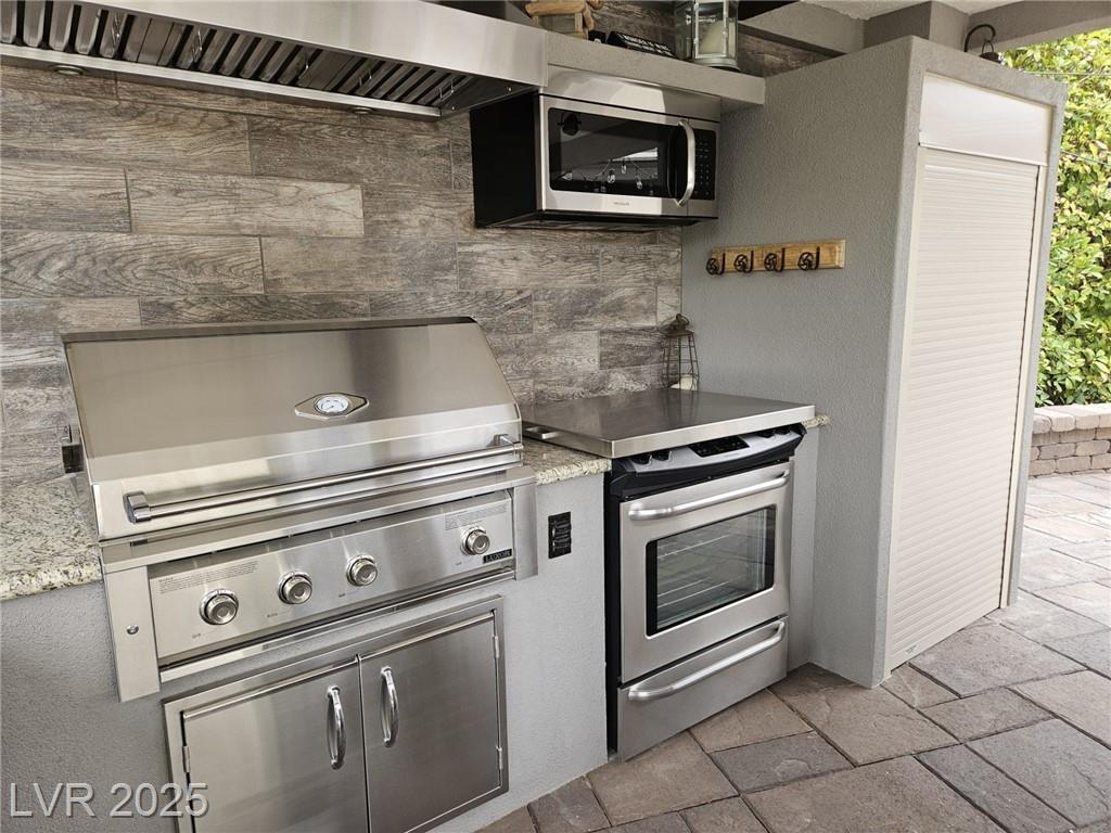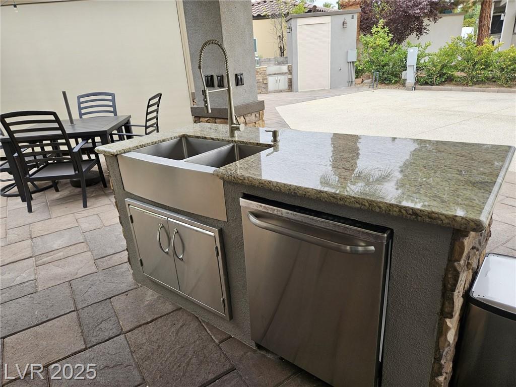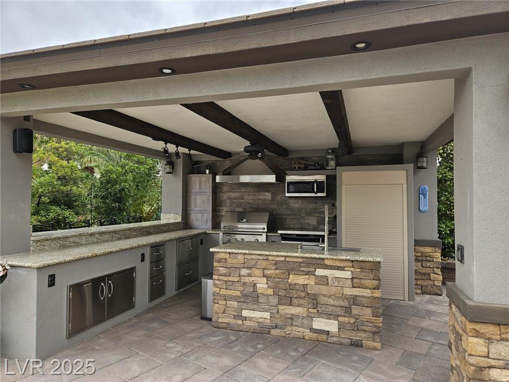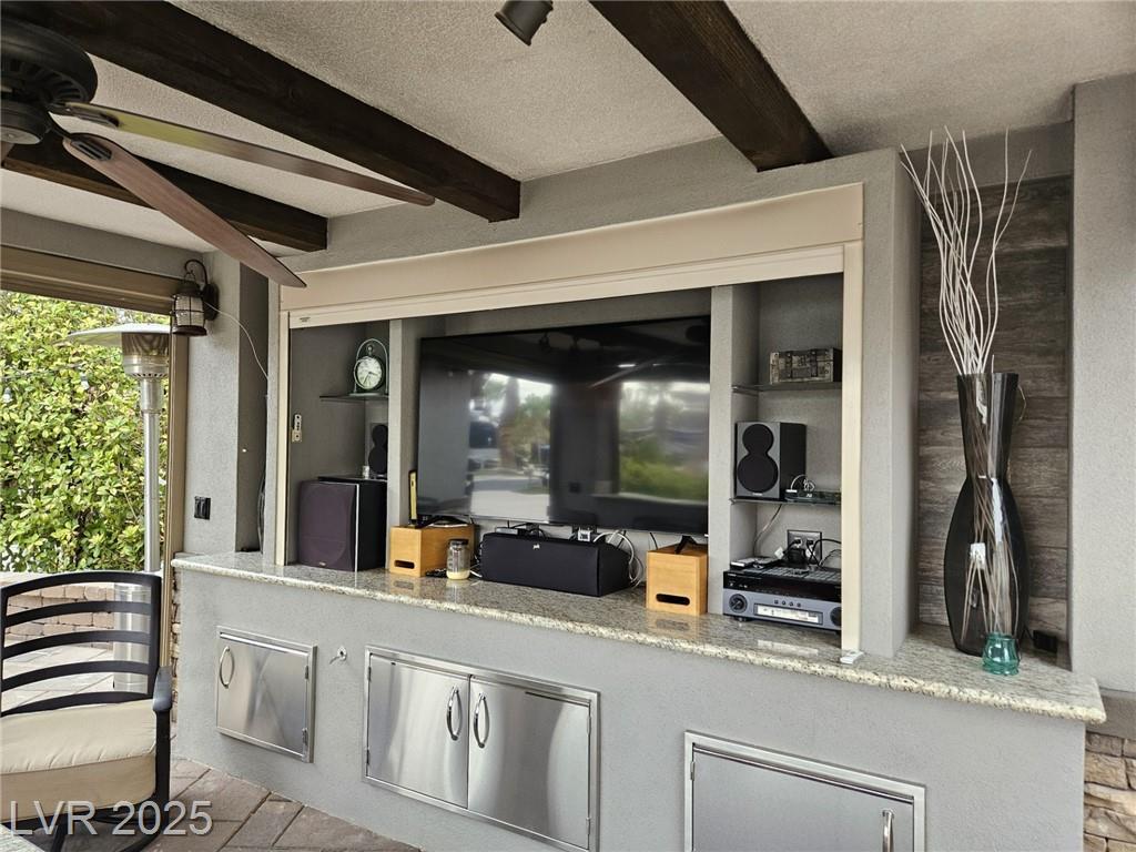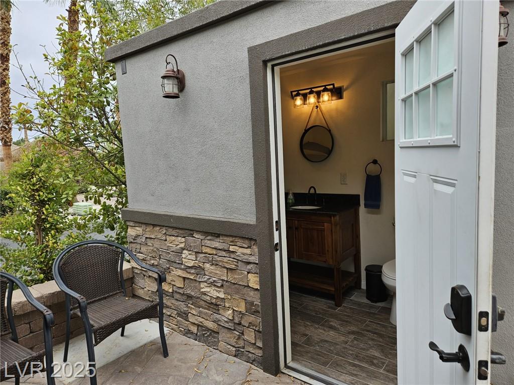 Located in the guard gated Las Vegas Motor Coach Resort, this stunning site is total perfection! This super large and private corner site around the corner from the clubhouse has it all including mature and lush landscaping for plenty of privacy! No expense was spared when designing this hard roof structure buildout featuring a chef’s gourmet kitchen, range hood, full size fridge, dishwasher, sink, bar seating, and granite counters. The living room area includes privacy shades, a ceiling heater, huge TV niche, Polk audio sound system, built-in fire pit, and custom lighting. The rear of the site features a comfort station, two storage sheds with washer/dryer, water softener, and laundry sink. You will NOT be disappointed! OWNER WILL CARRY!