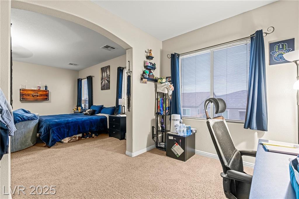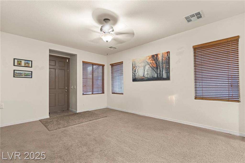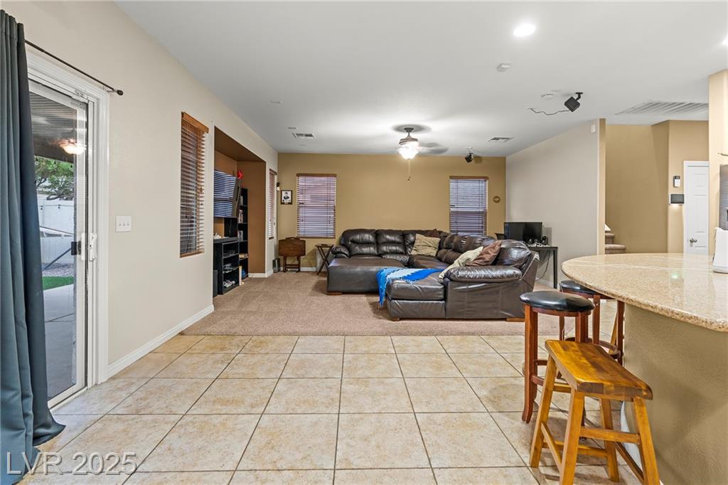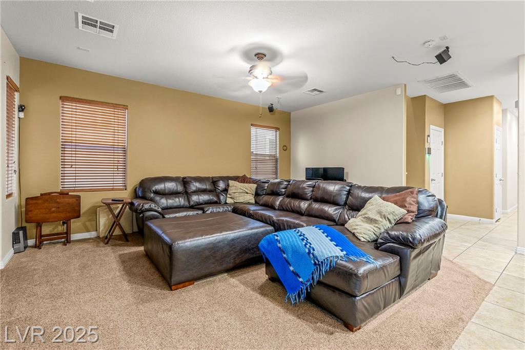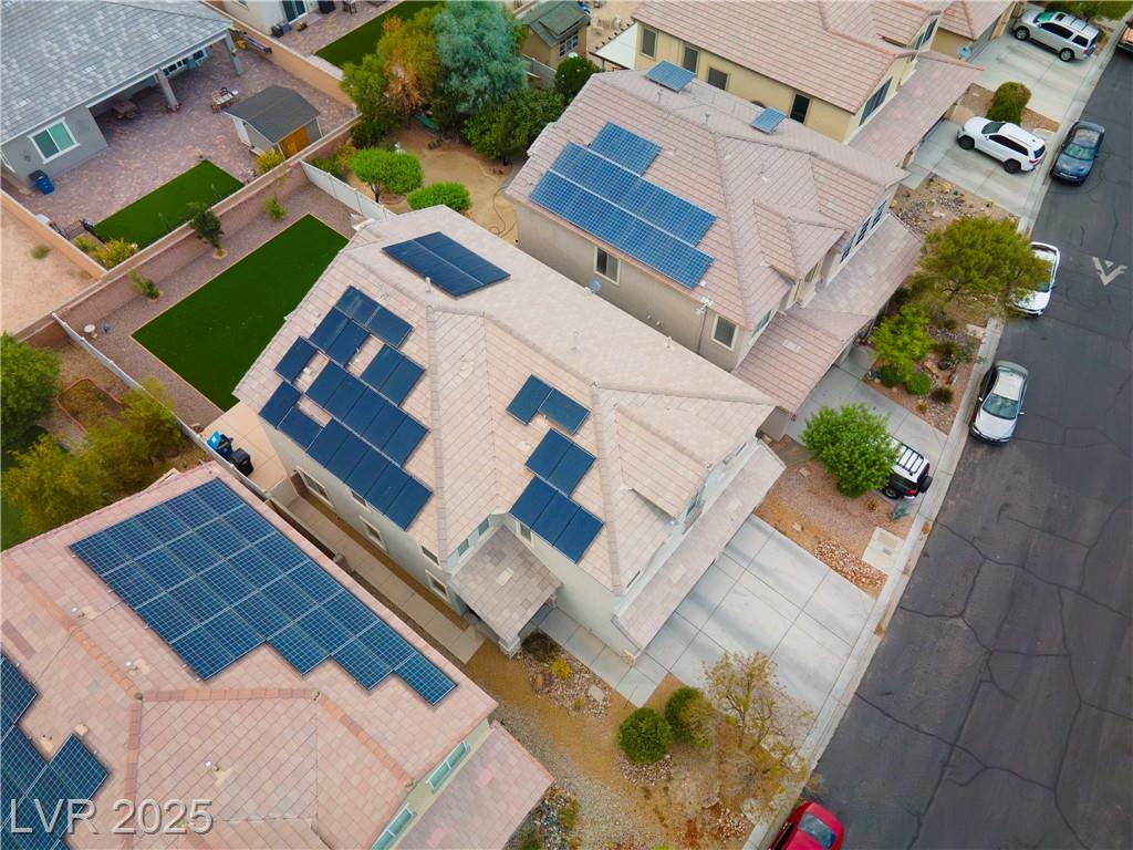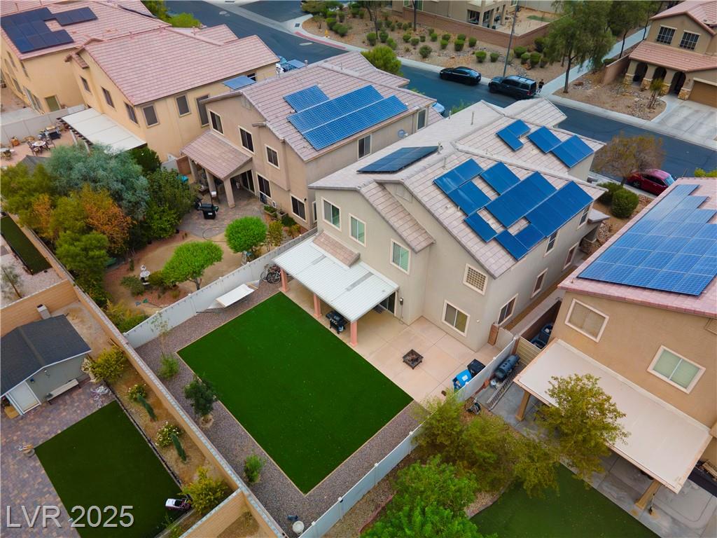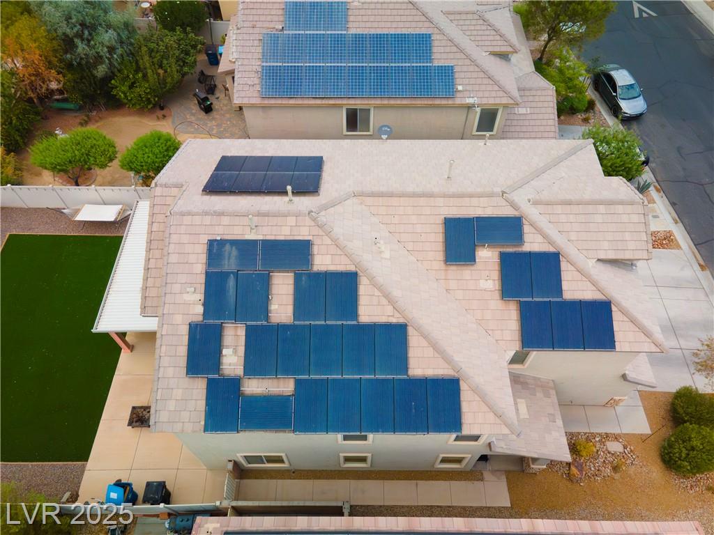 Spacious 6-Bedroom Home with 3-Car Garage & Solar! This beautifully maintained home features 6 bedrooms, 3 bathrooms, a 3-car garage, and energy-saving solar panels for reduced utility costs and sustainable living. Captured with a gorgeous sunset backdrop, this property showcases it's inviting exterior and prime location in a well-kept neighborhood. The gourmet kitchen includes stainless steel appliances, granite countertops, a large island, pantry, and tile flooring. Enjoy a large media space and an oversized primary suite with a versatile attached room—ideal for an office, nursery, or gym. The backyard offers a covered patio, low-maintenance landscaping, and lush artificial turf. Conveniently located near the 215, shopping, dining, schools, and just 12 minutes from Nellis AFB!