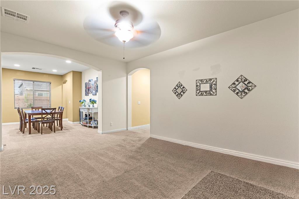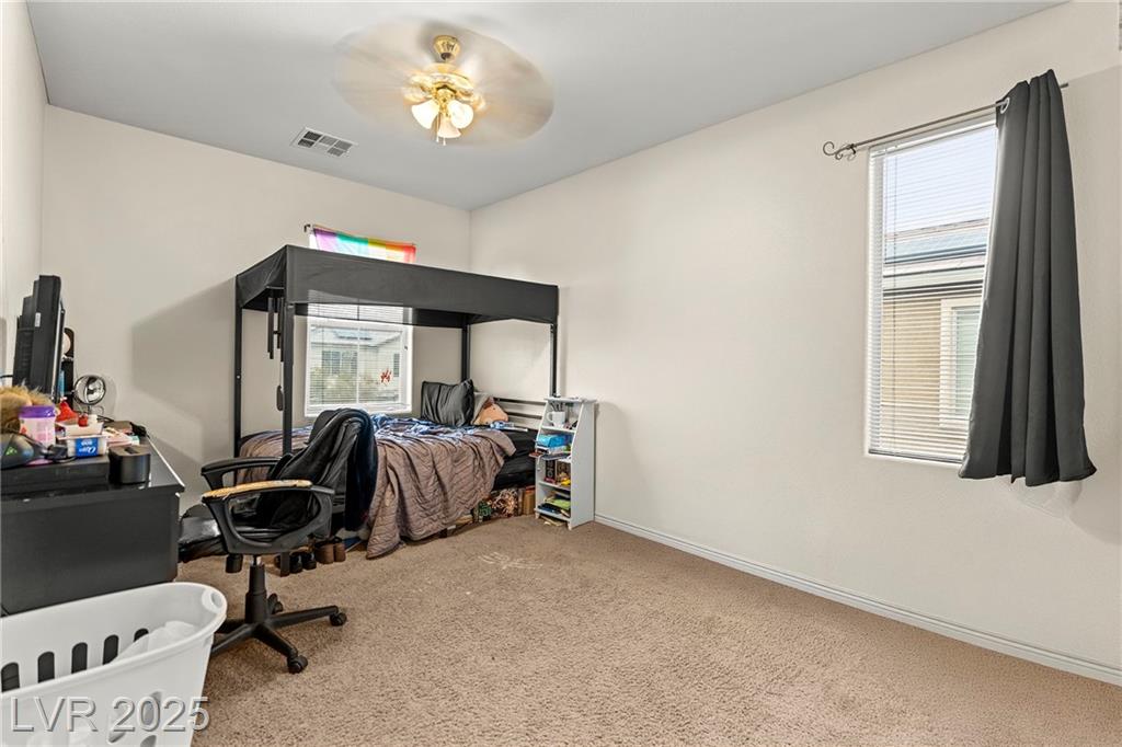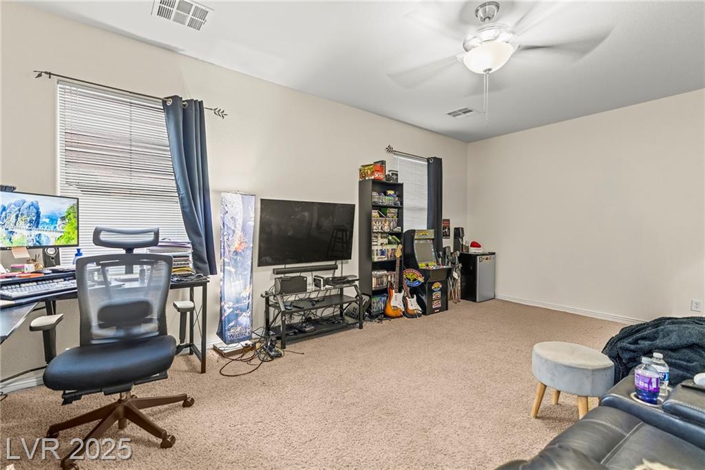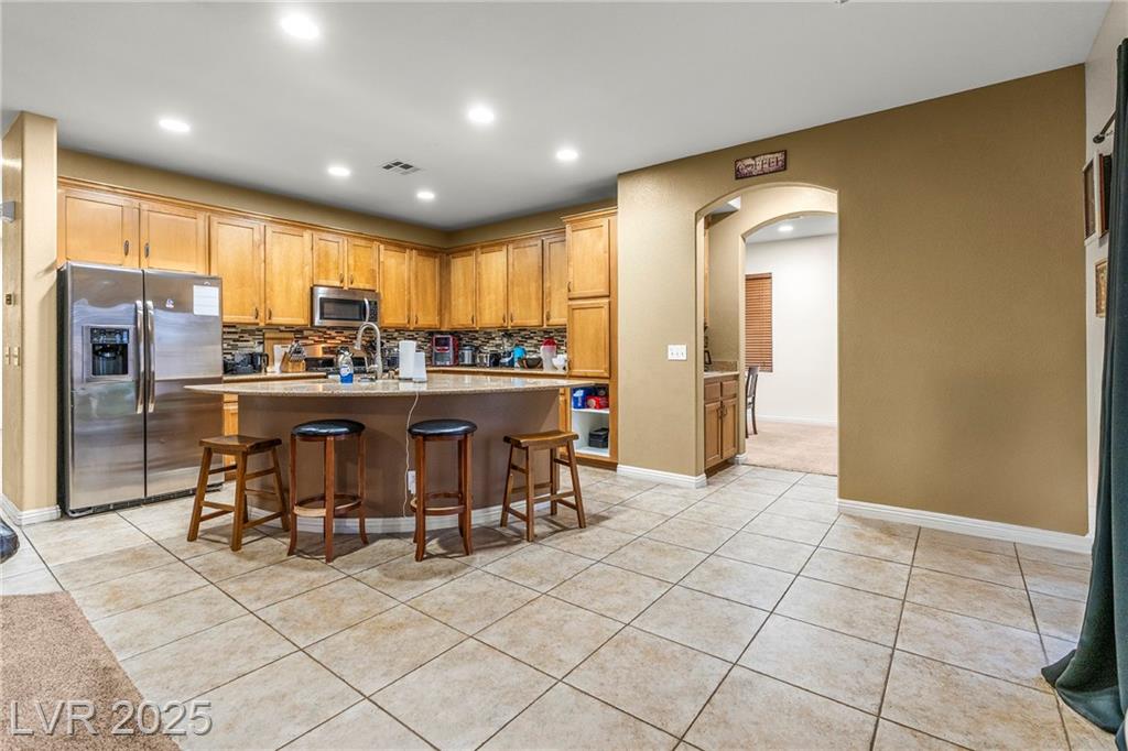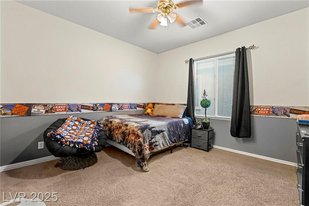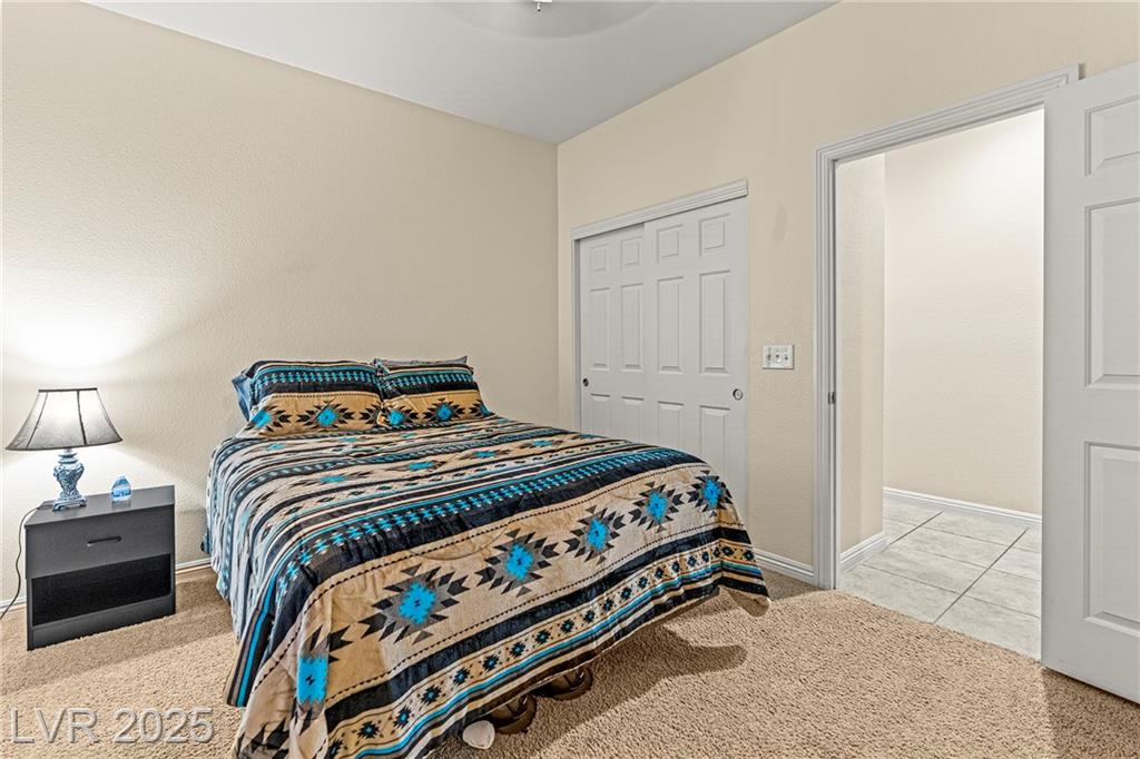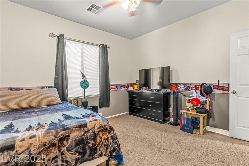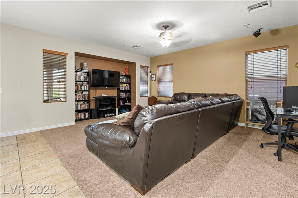 Spacious 6-Bedroom Home with 3-Car Garage & Solar! This beautifully maintained home features 6 bedrooms, 3 bathrooms, a 3-car garage, and energy-saving solar panels for reduced utility costs and sustainable living. Captured with a gorgeous sunset backdrop, this property showcases it's inviting exterior and prime location in a well-kept neighborhood. The gourmet kitchen includes stainless steel appliances, granite countertops, a large island, pantry, and tile flooring. Enjoy a large media space and an oversized primary suite with a versatile attached room—ideal for an office, nursery, or gym. The backyard offers a covered patio, low-maintenance landscaping, and lush artificial turf. Conveniently located near the 215, shopping, dining, schools, and just 12 minutes from Nellis AFB!