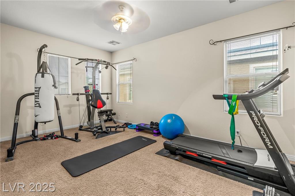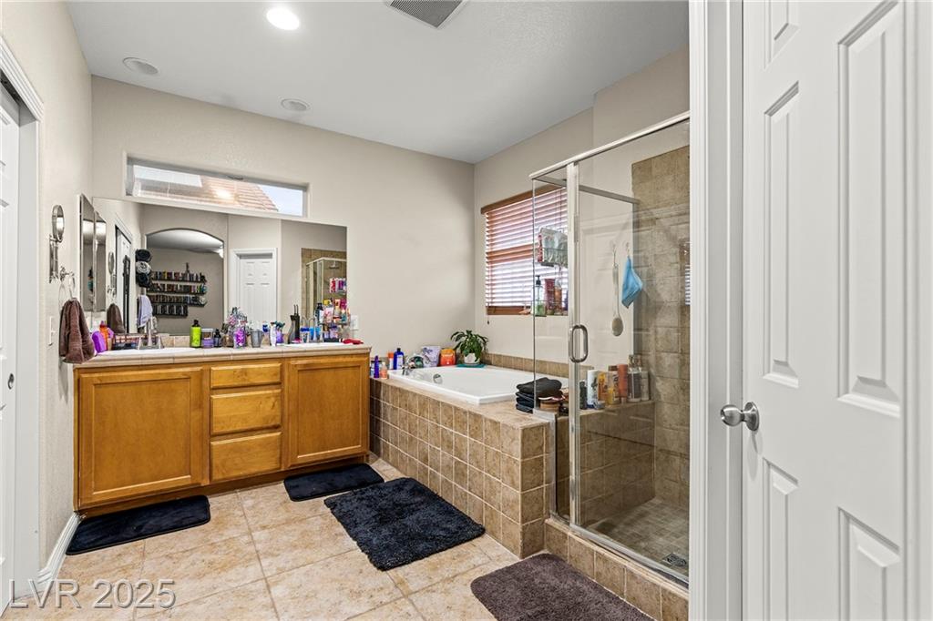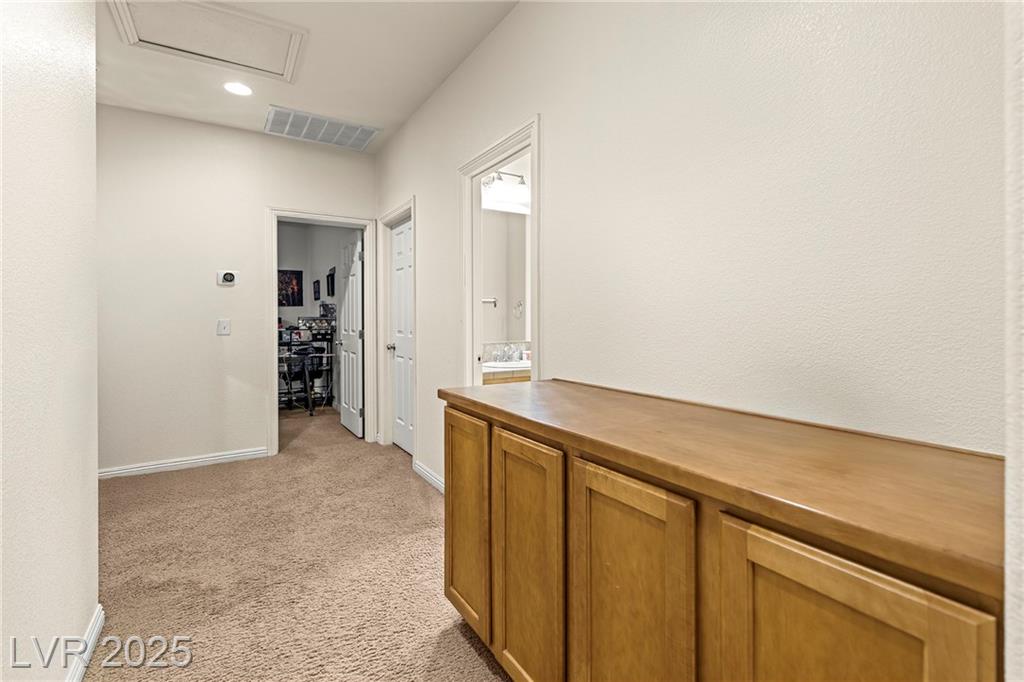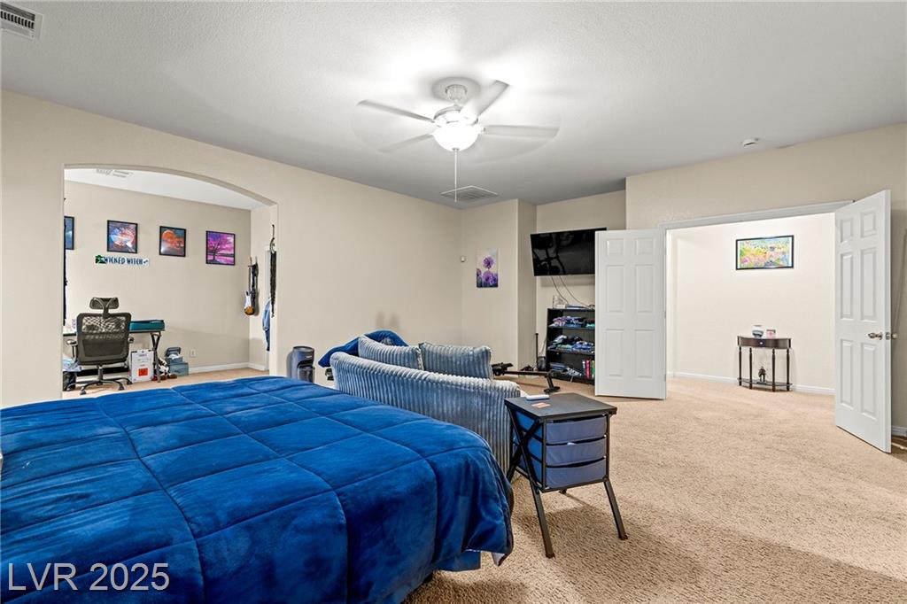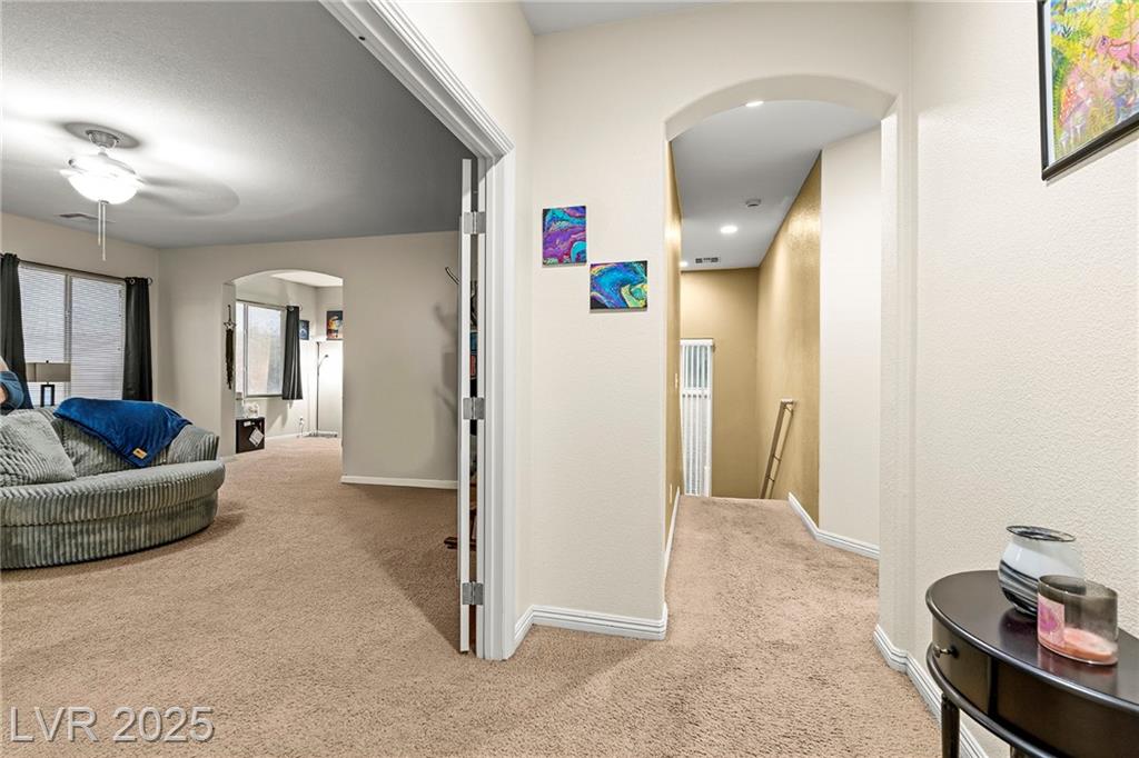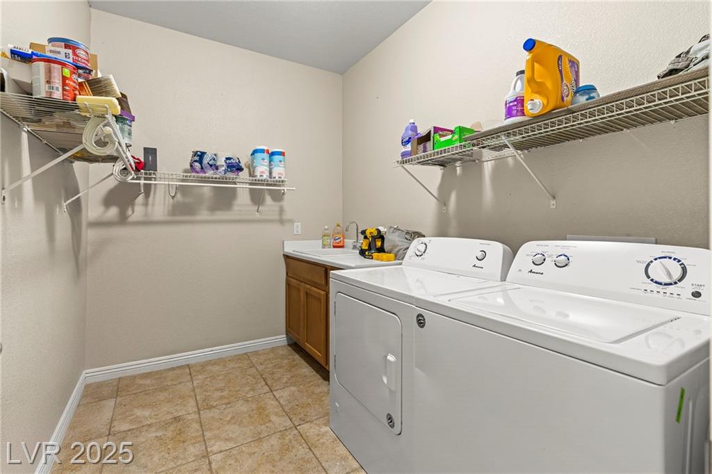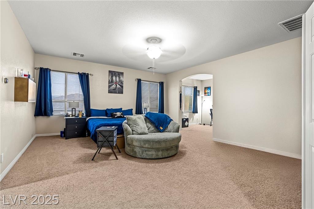 Spacious 6-Bedroom Home with 3-Car Garage & Solar! This beautifully maintained home features 6 bedrooms, 3 bathrooms, a 3-car garage, and energy-saving solar panels for reduced utility costs and sustainable living. Captured with a gorgeous sunset backdrop, this property showcases it's inviting exterior and prime location in a well-kept neighborhood. The gourmet kitchen includes stainless steel appliances, granite countertops, a large island, pantry, and tile flooring. Enjoy a large media space and an oversized primary suite with a versatile attached room—ideal for an office, nursery, or gym. The backyard offers a covered patio, low-maintenance landscaping, and lush artificial turf. Conveniently located near the 215, shopping, dining, schools, and just 12 minutes from Nellis AFB!