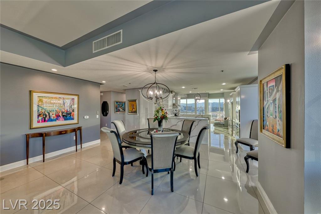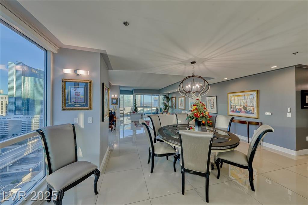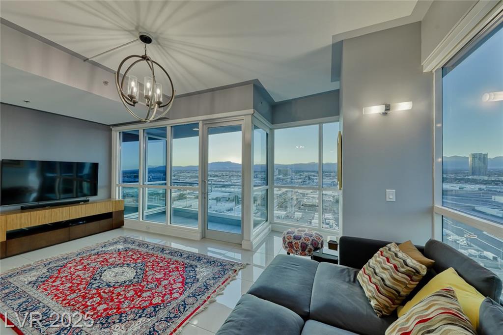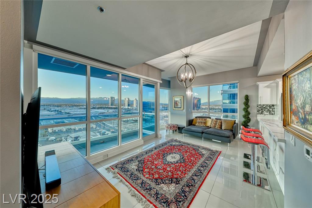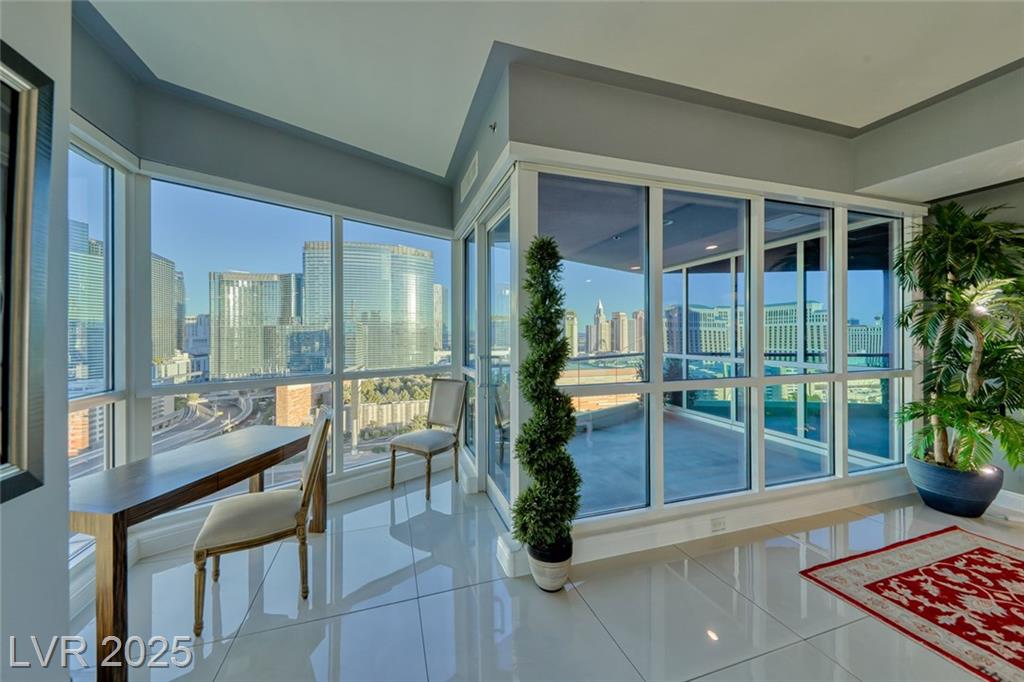 WOW! Executive turn-key furnished residence features a tasteful and substantial offering of artwork and furnishings, while being surrounded with views of The Strip and the City. Attention to detail is evident with the large format porcelain tile flooring and extensive trim and stonework in the kitchen. This stunning residence will continue to amaze you and your guests day to day and corner to corner. This endcap unit is complete with double balconies, and well flowing living areas. Panorama is a true luxury building in a prime location near The Strip and the new pro sports arenas featuring a full array of amenities to suit your active lifestyle. Includes limo service, concierge, valet, fitness center, yoga classes, racquetball, indoor spa, pool deck with cabanas, barbecue area, business center, dog park, theater/game room, 24/7 security, controlled entry, restaurant, dry cleaning, the list goes on!