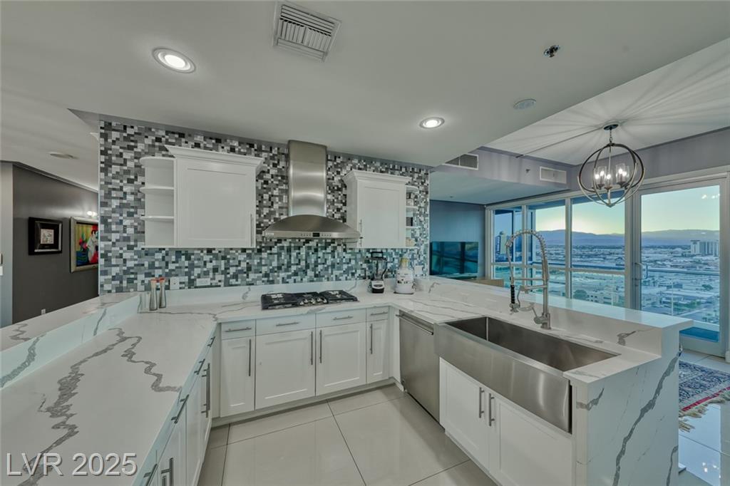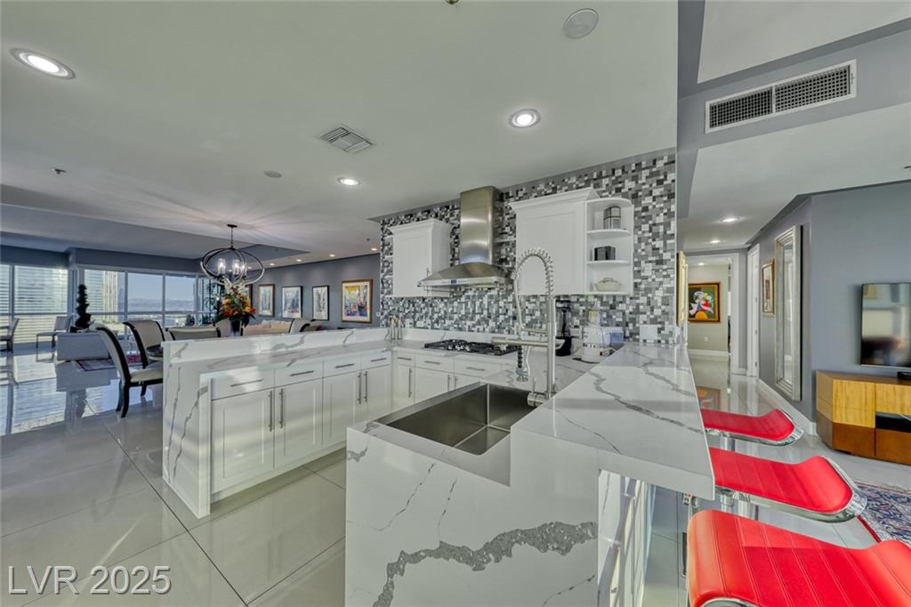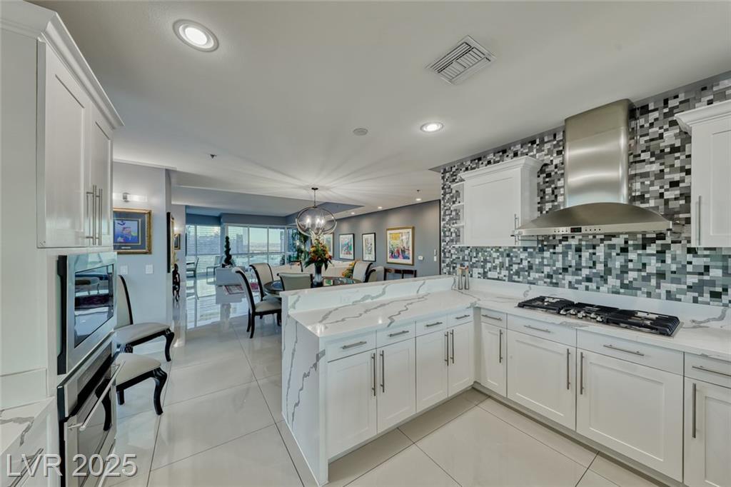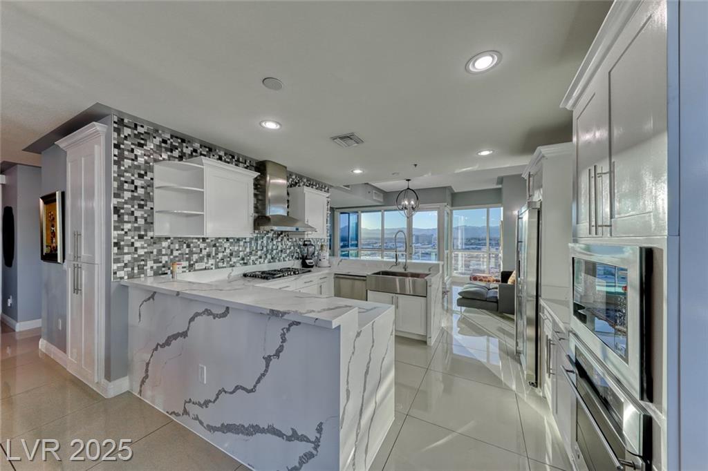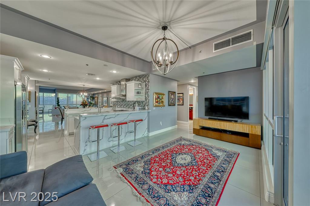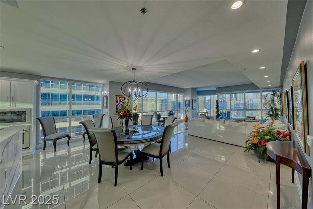 WOW! Executive turn-key furnished residence features a tasteful and substantial offering of artwork and furnishings, while being surrounded with views of The Strip and the City. Attention to detail is evident with the large format porcelain tile flooring and extensive trim and stonework in the kitchen. This stunning residence will continue to amaze you and your guests day to day and corner to corner. This endcap unit is complete with double balconies, and well flowing living areas. Panorama is a true luxury building in a prime location near The Strip and the new pro sports arenas featuring a full array of amenities to suit your active lifestyle. Includes limo service, concierge, valet, fitness center, yoga classes, racquetball, indoor spa, pool deck with cabanas, barbecue area, business center, dog park, theater/game room, 24/7 security, controlled entry, restaurant, dry cleaning, the list goes on!