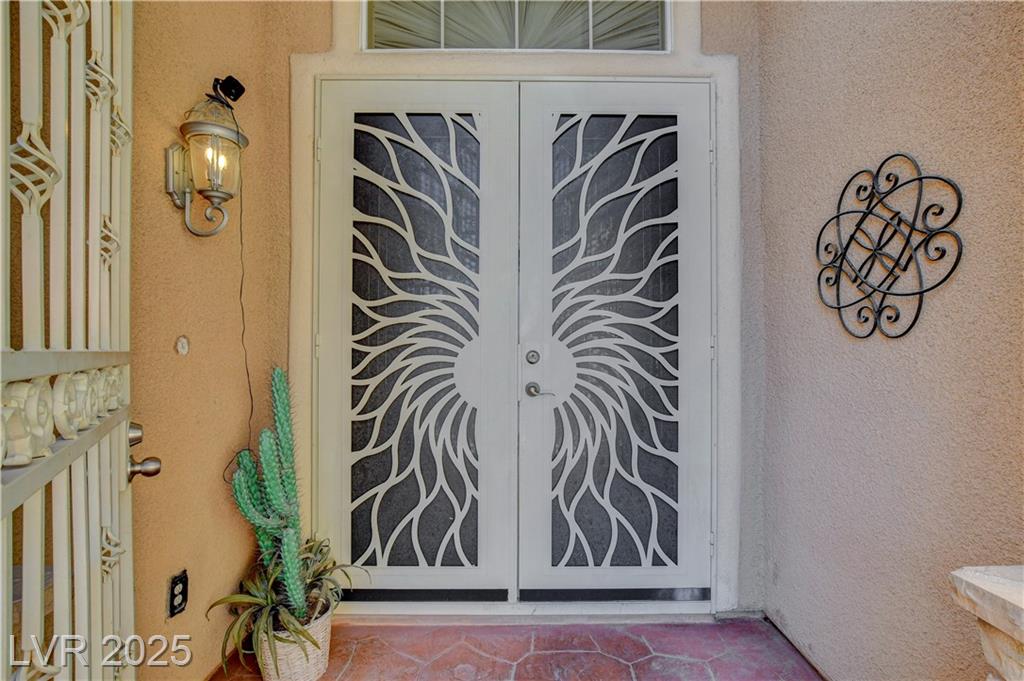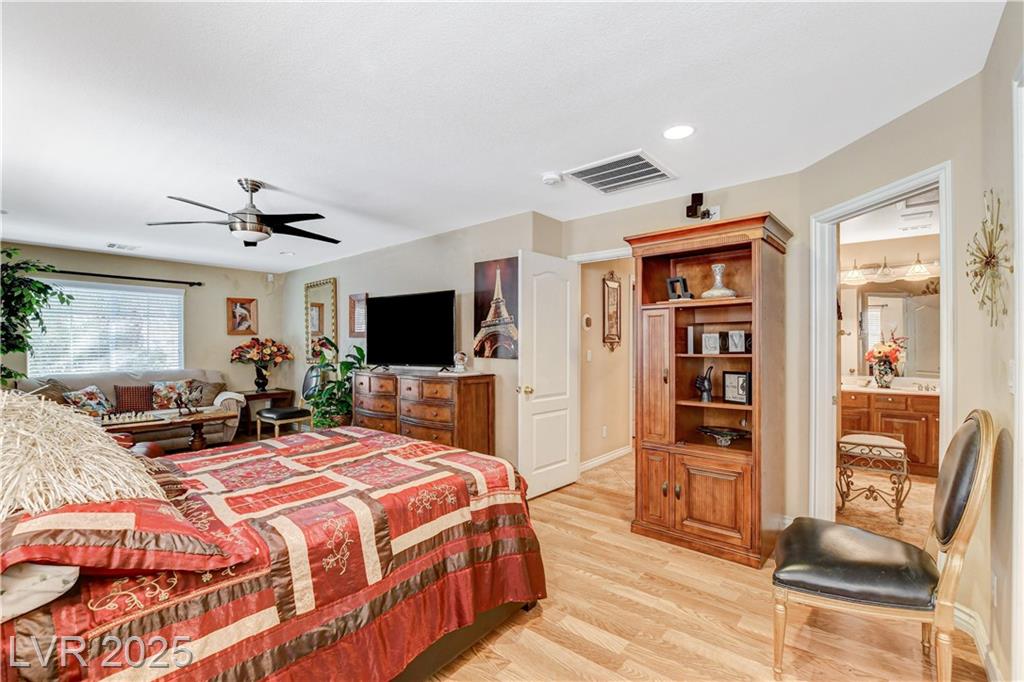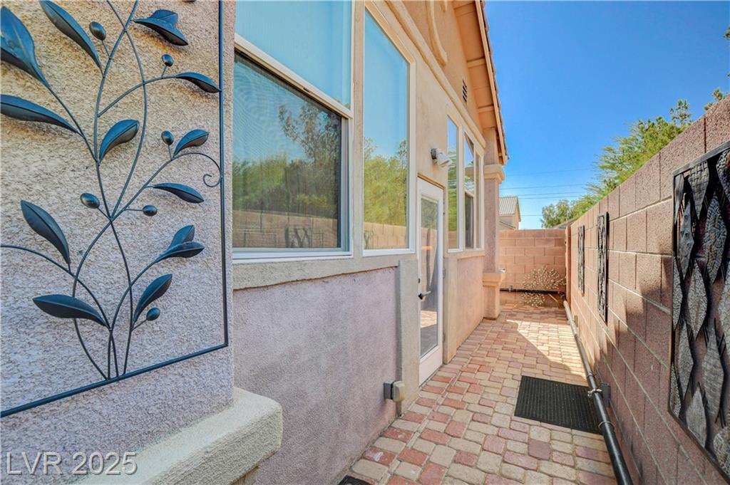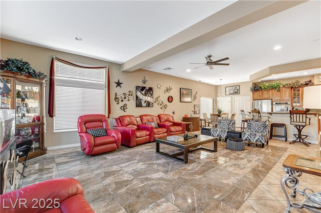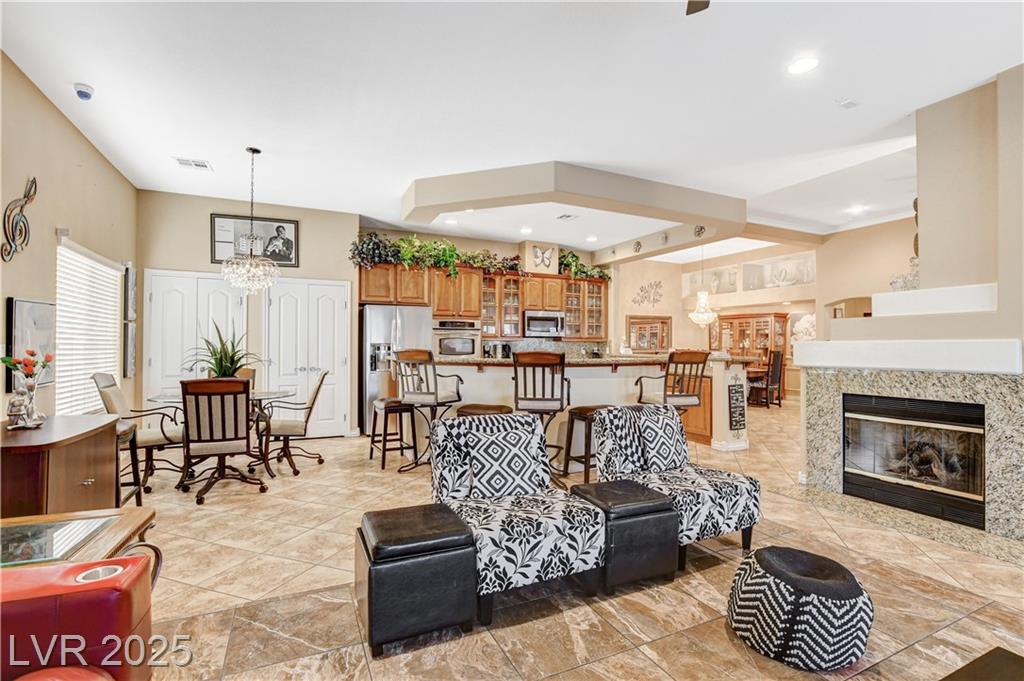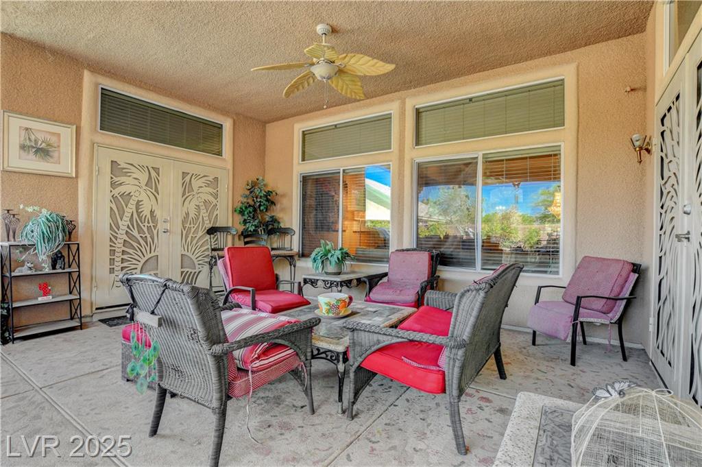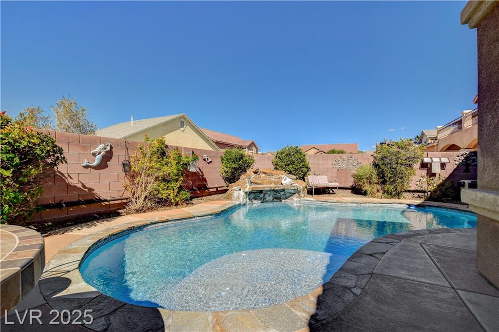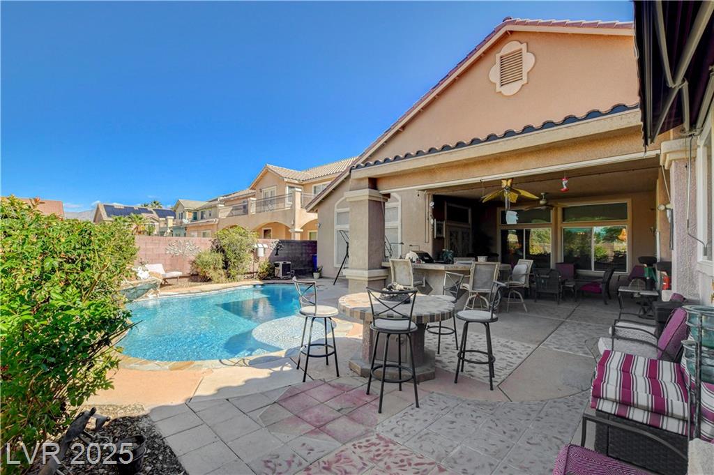 POTENIALLY a 5 bedroom home! Exquisite 3,050sq ft single story home in a gated community: Open floor plan, high ceilings, chandeliers, fireplace + cozy kitchen with granite countertops. Excessively HUGE primary bedroom separated from 2 other bedrooms. Huge resort style entertainer's backyard with a pool & spa, water fountain, built-in Bar/BBQ & nice fire pit table. Huge covered patio with roll down shades. Why 5 bedrooms? 2 big & permitted exercise rooms (567 sq ft) were added in 2009 & could be used as 2 extra bedrooms OR office & storage (total = 3,617 SQ FT). INCLUDED: Big 12.75 KW Solar PV System, Solar pool system, premium surround sound system in all rooms & backyard. Home security system with 8 cameras. Additional wall mounted AC units in rooms + pool & patio furniture. Other furniture & items in home for sale. Located 1 minute away from the N. Jones & I-215 freeway & close to shopping centers, schools, dining options & parks. This home was just appraised, and is priced to sell