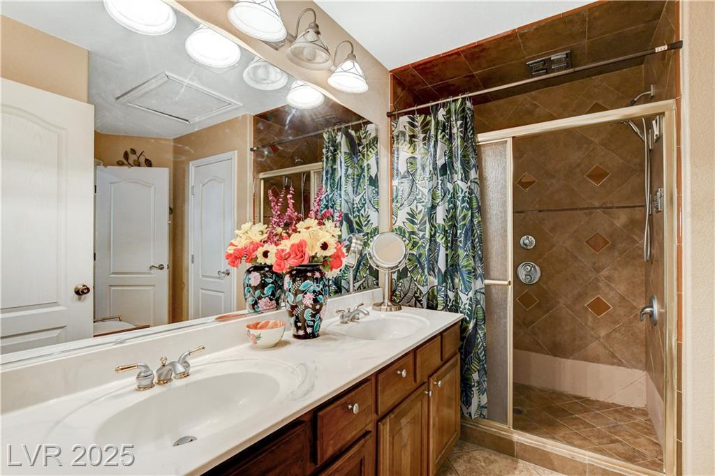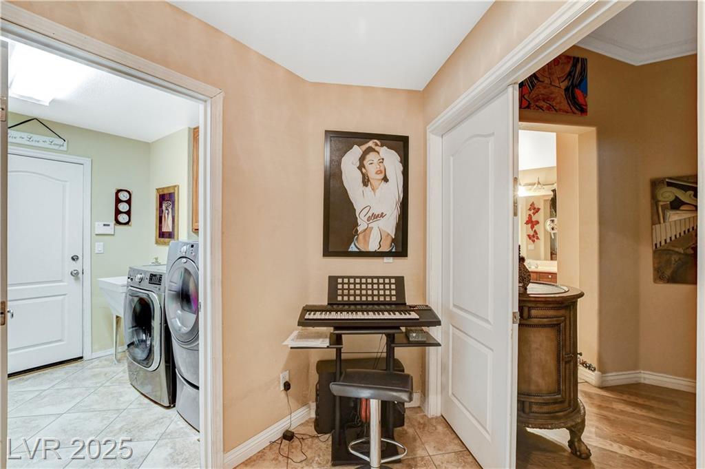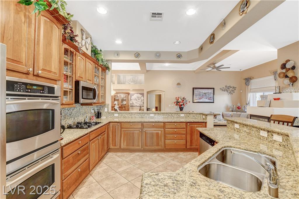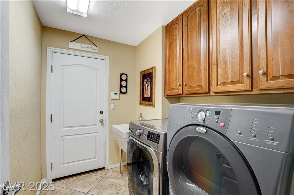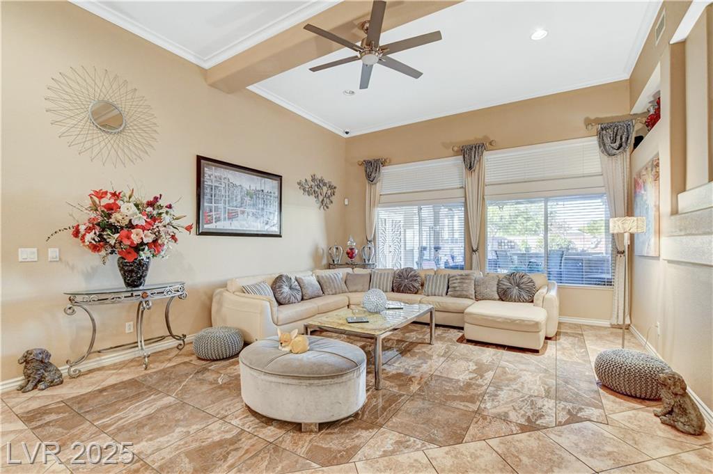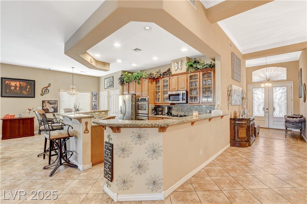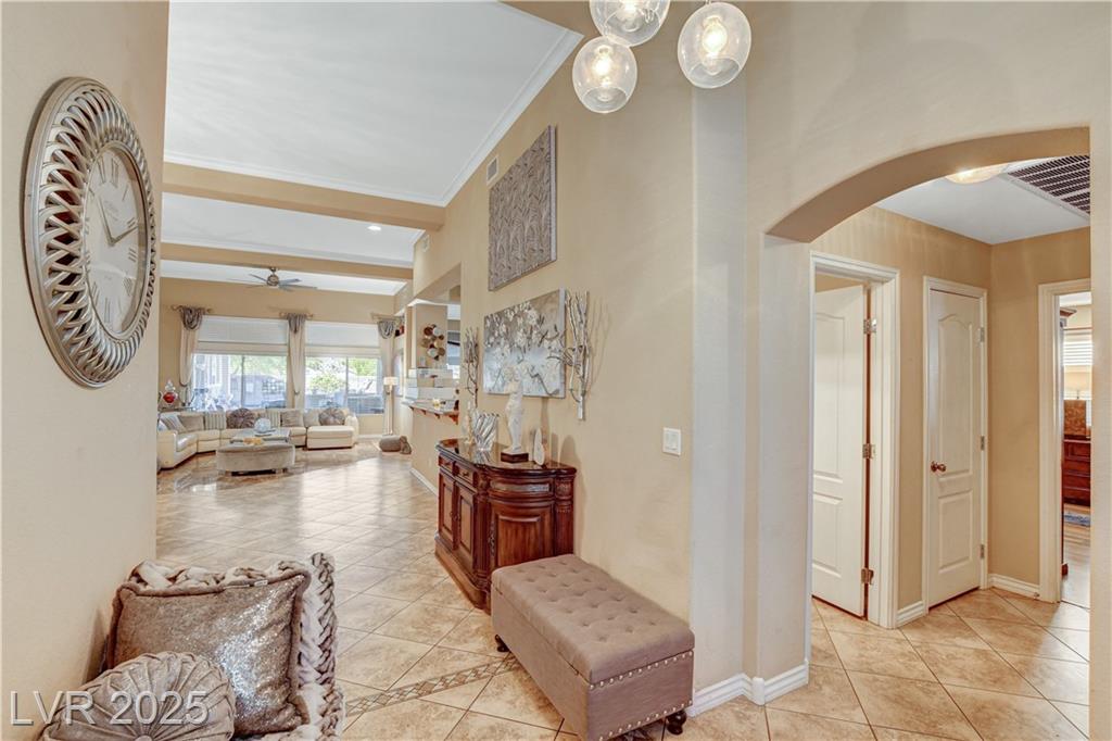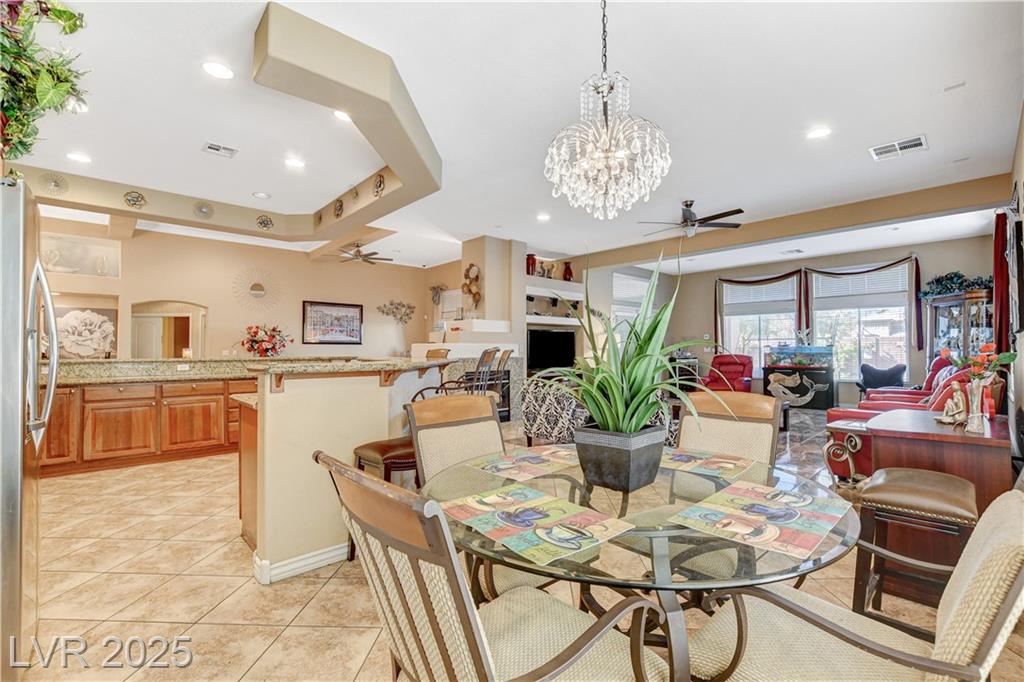 POTENIALLY a 5 bedroom home! Exquisite 3,050sq ft single story home in a gated community: Open floor plan, high ceilings, chandeliers, fireplace + cozy kitchen with granite countertops. Excessively HUGE primary bedroom separated from 2 other bedrooms. Huge resort style entertainer's backyard with a pool & spa, water fountain, built-in Bar/BBQ & nice fire pit table. Huge covered patio with roll down shades. Why 5 bedrooms? 2 big & permitted exercise rooms (567 sq ft) were added in 2009 & could be used as 2 extra bedrooms OR office & storage (total = 3,617 SQ FT). INCLUDED: Big 12.75 KW Solar PV System, Solar pool system, premium surround sound system in all rooms & backyard. Home security system with 8 cameras. Additional wall mounted AC units in rooms + pool & patio furniture. Other furniture & items in home for sale. Located 1 minute away from the N. Jones & I-215 freeway & close to shopping centers, schools, dining options & parks. This home was just appraised, and is priced to sell