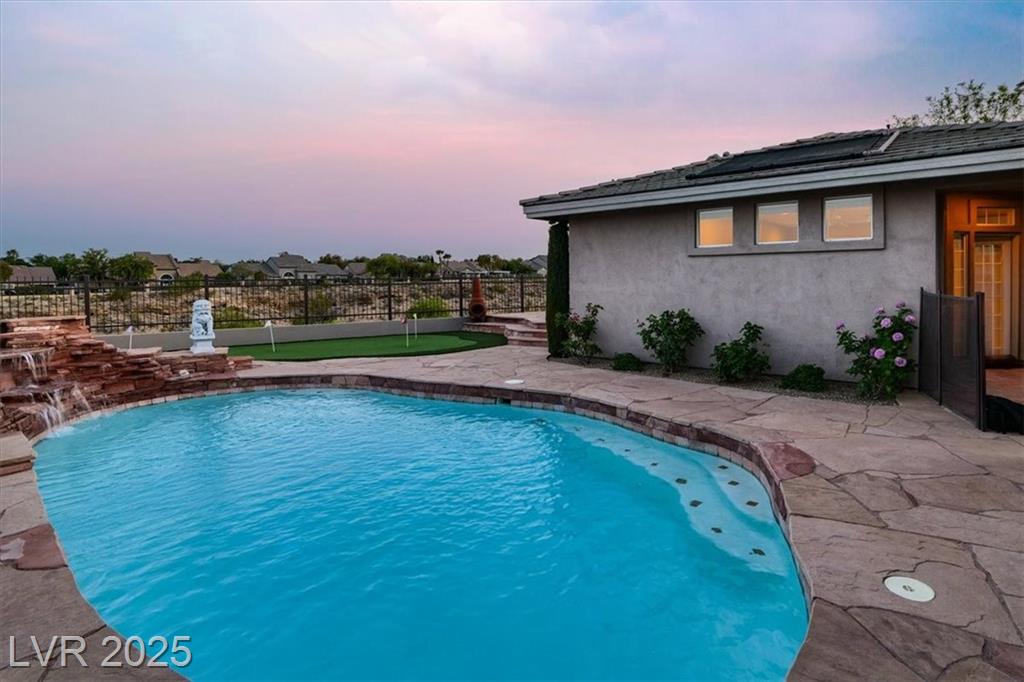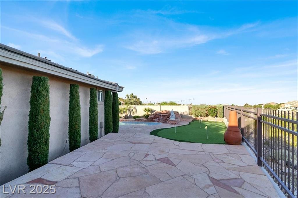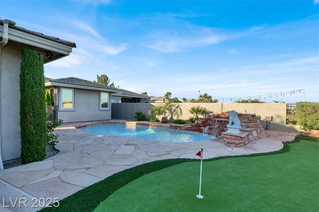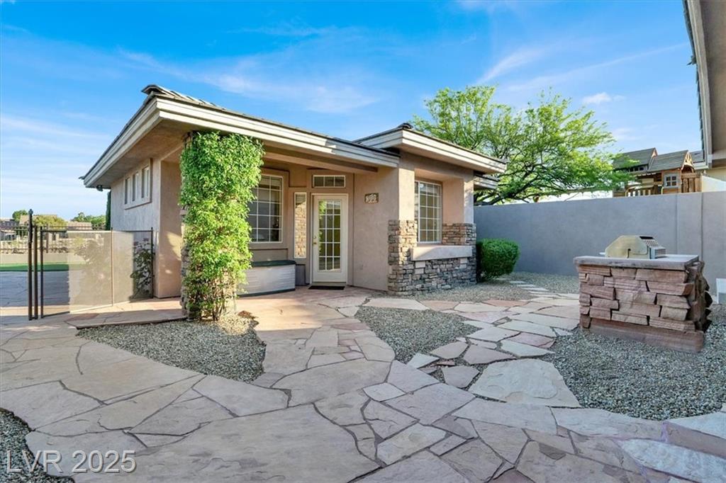 BEAUTIFULLY APPOINTED AND HIGHLY UPGRADED SINGLE-STORY 5-BEDROOM HOME WITH DEN/OFFICE AND DETACHED CASITA INCLUDING A PRIVATE POOL WITH SWEEPING MOUNTAIN VIEWS AND CHILD SFETY FENCE. CENTRALLY LOCATED IN THE HEART OF SUMMERLIN AND EASY ACCESS TO SCHOOLS, SHOPPING AT DOWNTOWN SUMMERLIN. OPEN FLOORPLAN WITH CUSTOM FLOORING AND PAINT SCHEMES THROUGHOUT. NEW WINDOWS IN MAIN HOUSE, REPLACED AC UNITS IN MAIN HOME. OVERSIZED FAMILY ROOM W/ CUSTOM REMODELED FIREPLACE W/CROWN MOULDING ADJACENT TO A CHEF’S DREAM GOURMET KITCHEN FEATURING LEVEL 3 GRANITE COUNTERTOPS, STAINLESS APPLIANCES, RAISED PANEL MAPLE CABINETS, AND PLENTY OF COUNTER SPACE TO ENTERTAIN FAMILY AND FRIENDS. LARGE PRIMARY BEDROOM WITH CUSTOM WALK-N CLOSETS AND SPA-LIKE BATH WITH DOUBLE STEP-IN SHOWER. OFFICE/DEN AREA AND 3 ADDITIONAL BEDROOMS IN MAIN HOUSE. PRIVATE REAR YARD, DID I MENTION VIEWS!! SWEEPING VALLEY VIEWS WITH COVERED PATIO AND DETACHED CASITA W/ FULL BED/BATH 5 HOLE SYNTHETIC PUTTING GREEN. CALL US TODAY!