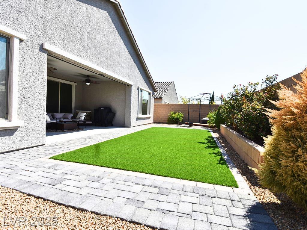 Nestled in the highly desirable Skye Canyon Community, this beautiful One-story home is conveniently located near shopping, dining, and freeway access. Built in 2022, this 3 bedroom, 2 bath home offers over 2,350 sqft of living space, a 3-car tandem garage. Huge backyard , Great for Family Gatherings or Festivities.