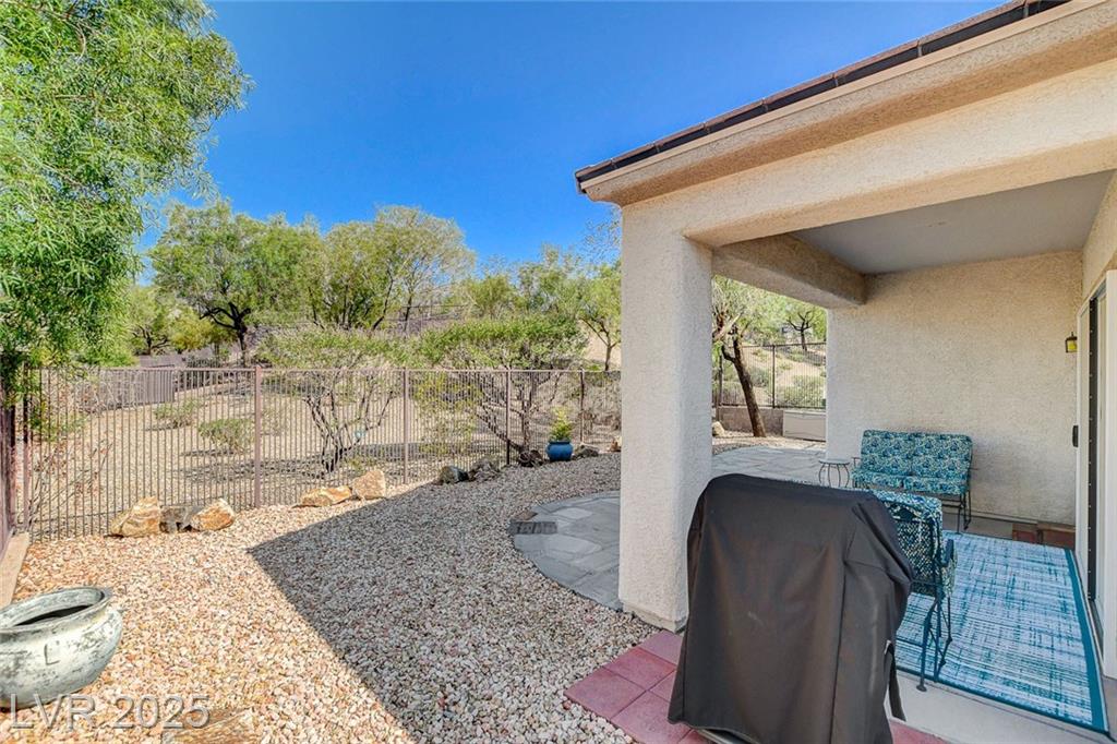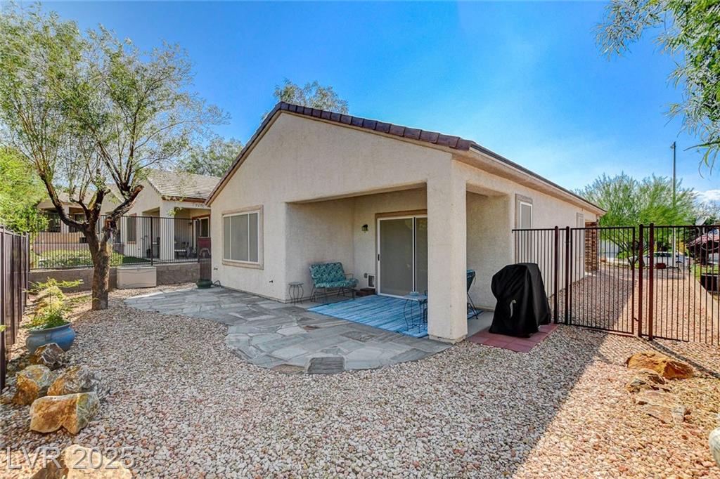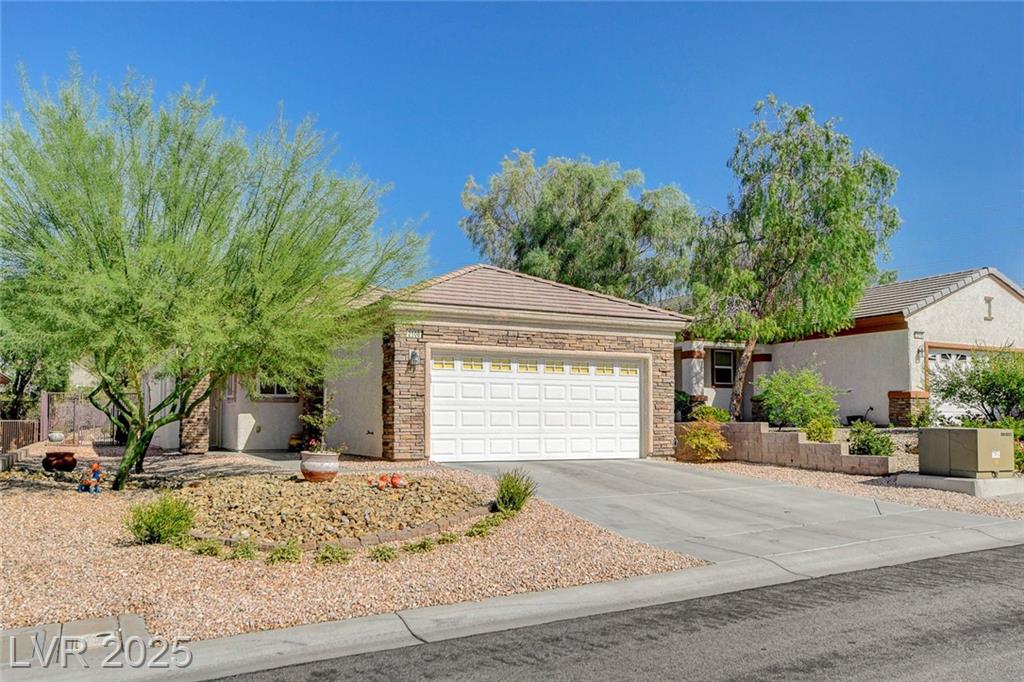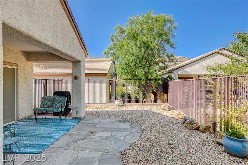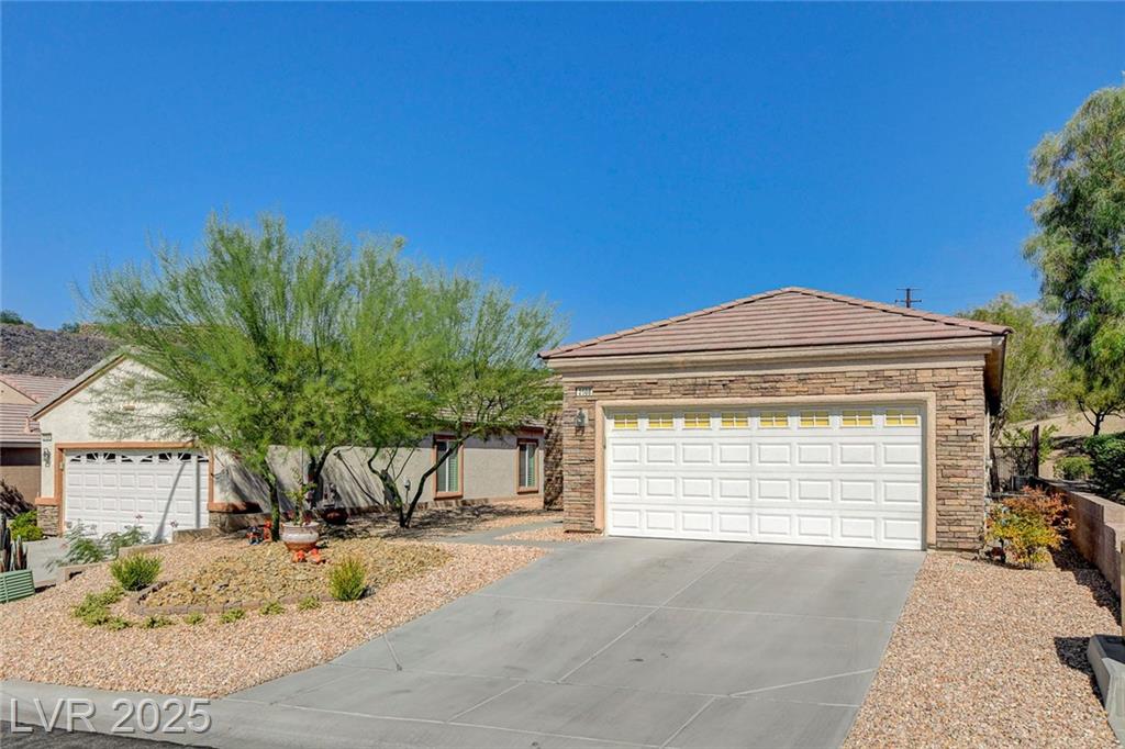 Welcome to the exquisite Lewis Model, featuring a stunning stacked stone entryway that immediately captures attention. This home boasts a sleek, open floor plan with two bedrooms and two bathrooms, all adorned with designer tile flooring—no carpet in sight. Step into the kitchen, where modern stainless steel appliances and elegant granite countertops await. Step outside to enjoy a fully fenced backyard, complete with a covered patio and a low-maintenance landscape. The spacious garage offers ample storage, and all appliances are included for your convenience. Enhance your peace of mind with Boss Security Screens installed throughout, a premium upgrade valued at over $10,000. This home is not only beautiful and immaculate but also move-in ready. For added security, a safe is conveniently located in the primary closet. Nestled in the charming Solera at Anthem, a premier 55+ community by Del Webb, this home offers proximity to shopping and dining options. This is a must see!!!