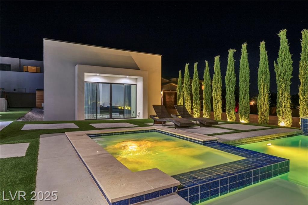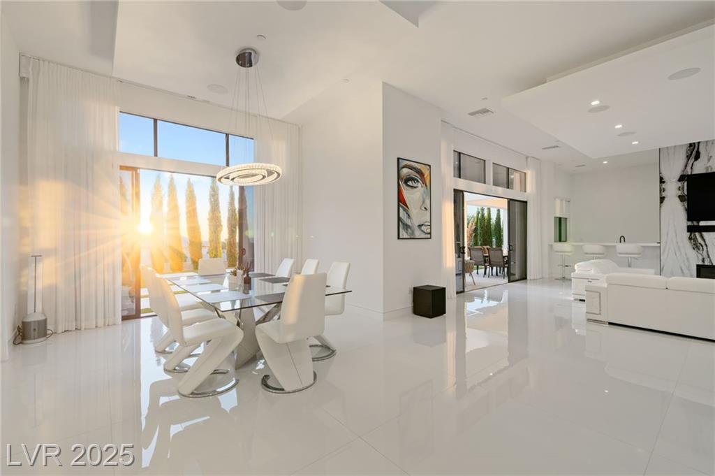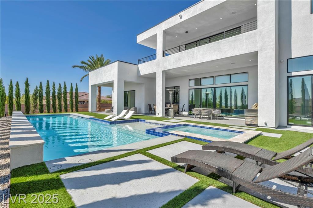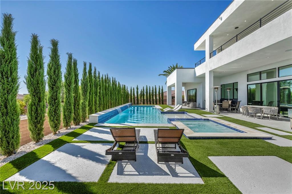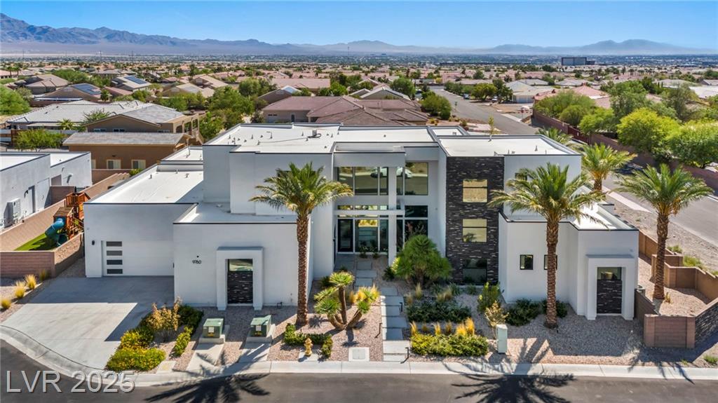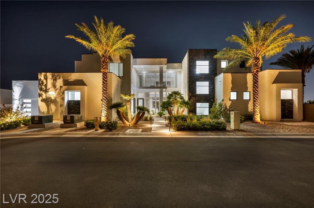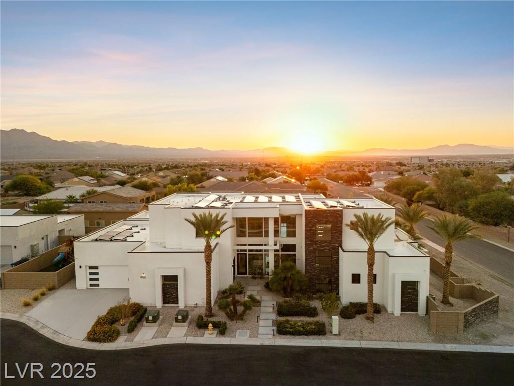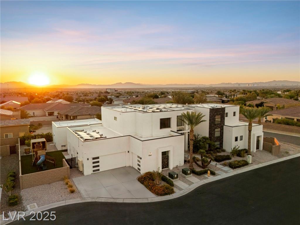 Discover a residence that redefines modern sophistication in Northwest Las Vegas. Designed with precision and intention, this architectural masterpiece blends clean contemporary lines with warm natural light, setting a new standard for refined desert living. The open-concept design flows effortlessly into multiple entertaining spaces, enhanced by sleek finishes and advanced smart-home technology. Gourmet kitchen has an expansive waterfall island, outfitted with professional-grade appliances and a hidden walk-in pantry. The primary suite features a private haven with a spa-inspired bath and 2 custom walk-in closets. Each additional bedroom is appointed with its own en-suite bath. Outdoors, the residence transforms into a resort setting. Meticulously landscaped grounds surround a heated pool and spa, complemented by a sauna and multiple lounging areas. From sunrise to sunset, every moment here is framed in luxury. This home—it's a statement of prestige, privacy, and modern elegance.