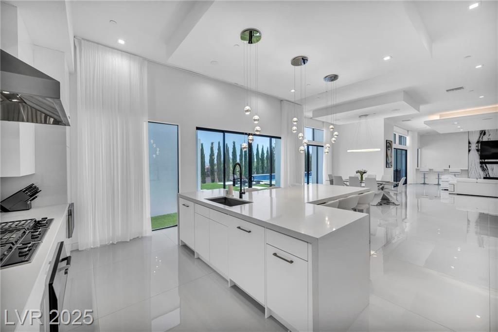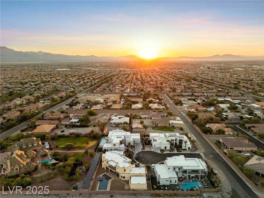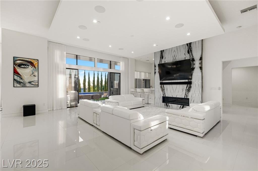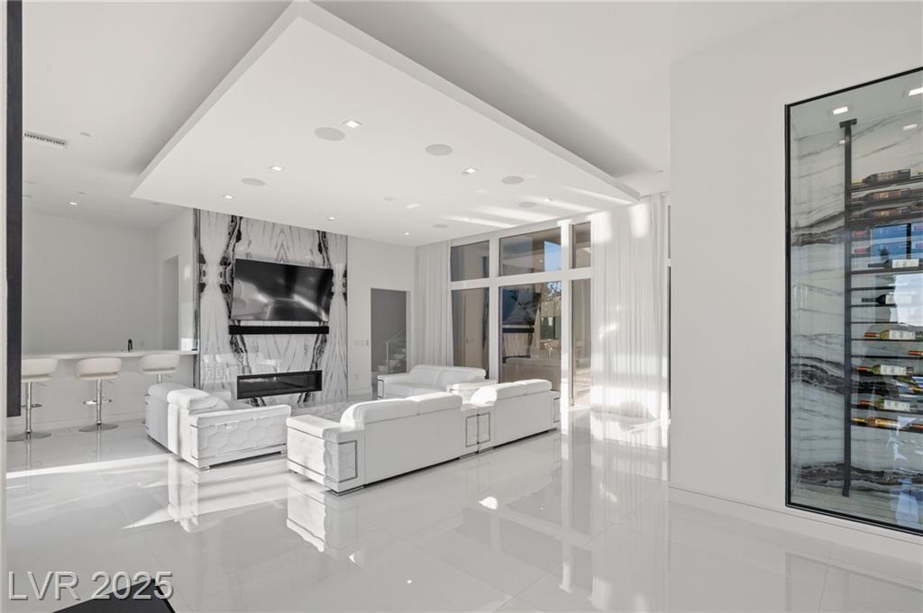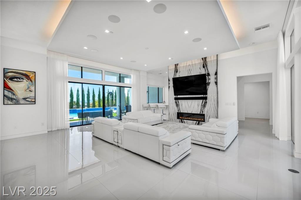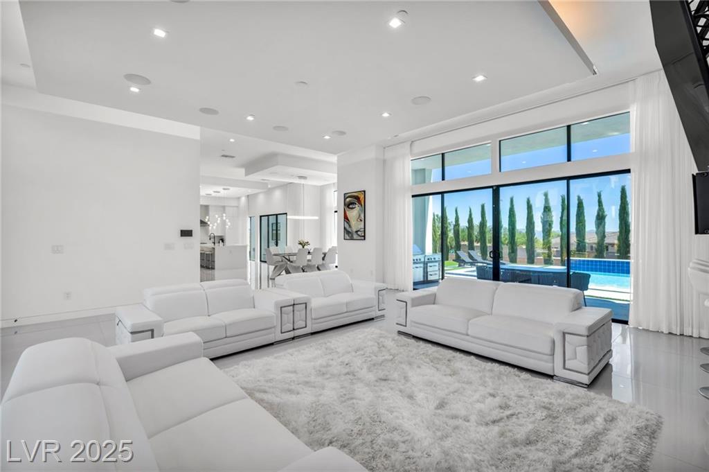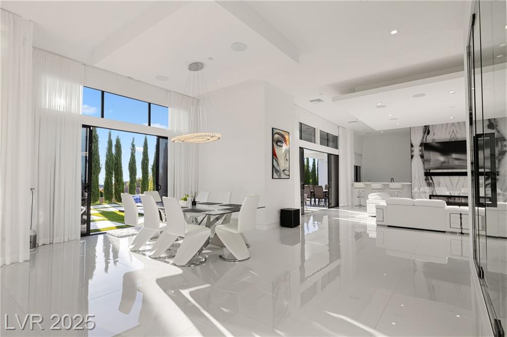 Discover a residence that redefines modern sophistication in Northwest Las Vegas. Designed with precision and intention, this architectural masterpiece blends clean contemporary lines with warm natural light, setting a new standard for refined desert living. The open-concept design flows effortlessly into multiple entertaining spaces, enhanced by sleek finishes and advanced smart-home technology. Gourmet kitchen has an expansive waterfall island, outfitted with professional-grade appliances and a hidden walk-in pantry. The primary suite features a private haven with a spa-inspired bath and 2 custom walk-in closets. Each additional bedroom is appointed with its own en-suite bath. Outdoors, the residence transforms into a resort setting. Meticulously landscaped grounds surround a heated pool and spa, complemented by a sauna and multiple lounging areas. From sunrise to sunset, every moment here is framed in luxury. This home—it's a statement of prestige, privacy, and modern elegance.