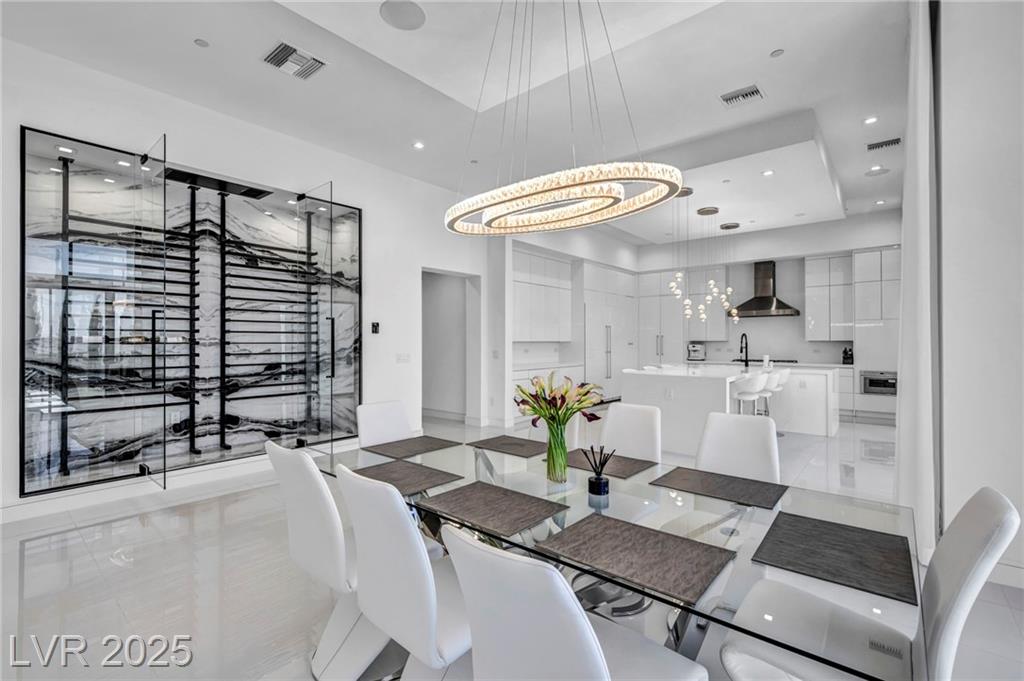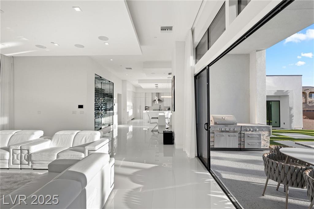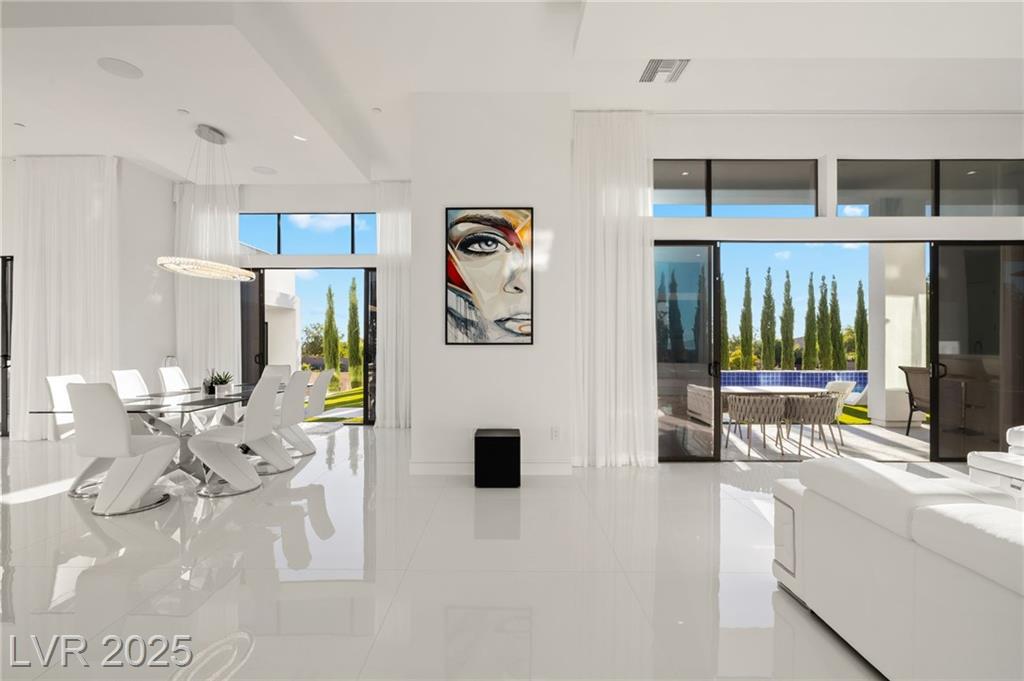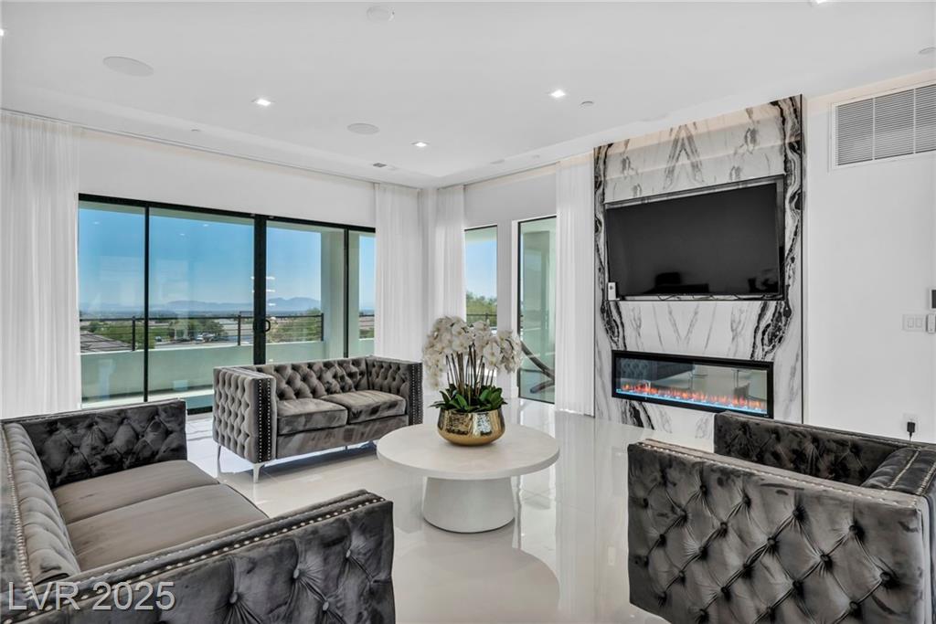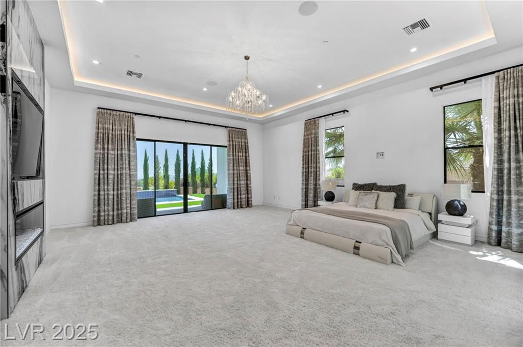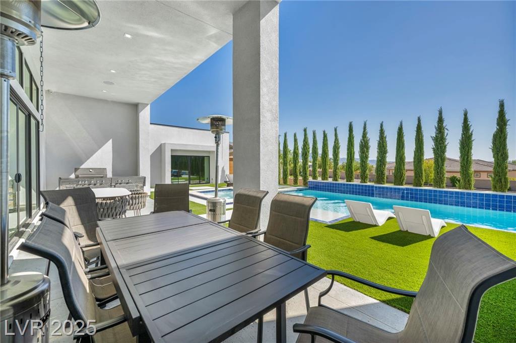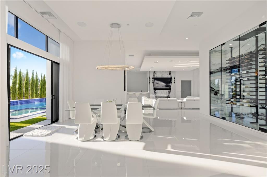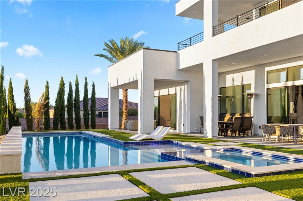 Discover a residence that redefines modern sophistication in Northwest Las Vegas. Designed with precision and intention, this architectural masterpiece blends clean contemporary lines with warm natural light, setting a new standard for refined desert living. The open-concept design flows effortlessly into multiple entertaining spaces, enhanced by sleek finishes and advanced smart-home technology. Gourmet kitchen has an expansive waterfall island, outfitted with professional-grade appliances and a hidden walk-in pantry. The primary suite features a private haven with a spa-inspired bath and 2 custom walk-in closets. Each additional bedroom is appointed with its own en-suite bath. Outdoors, the residence transforms into a resort setting. Meticulously landscaped grounds surround a heated pool and spa, complemented by a sauna and multiple lounging areas. From sunrise to sunset, every moment here is framed in luxury. This home—it's a statement of prestige, privacy, and modern elegance.