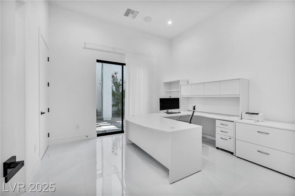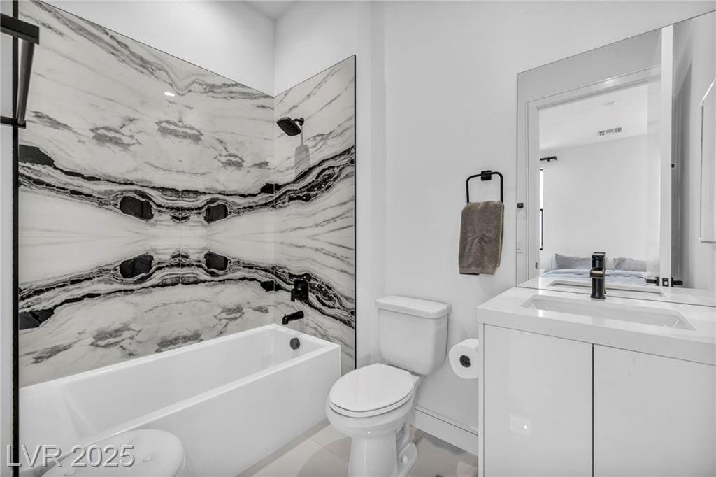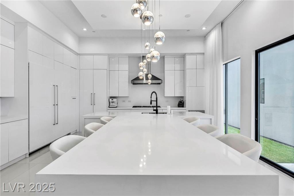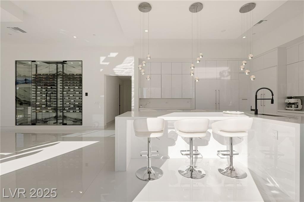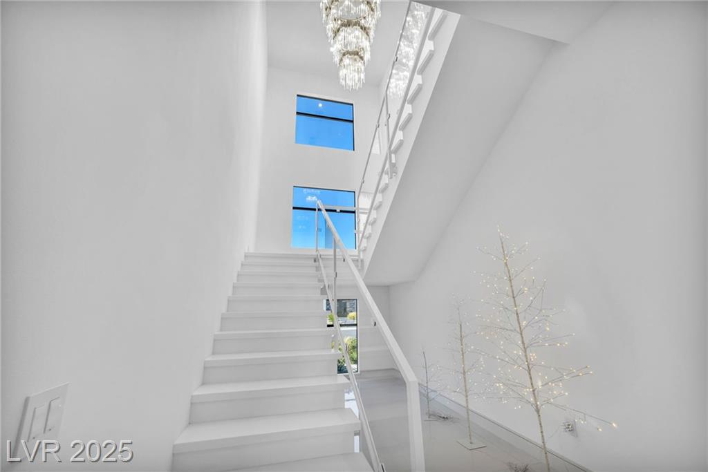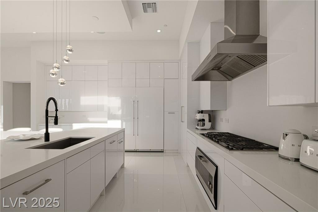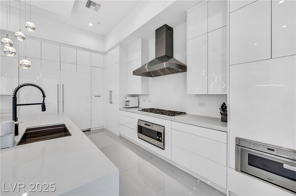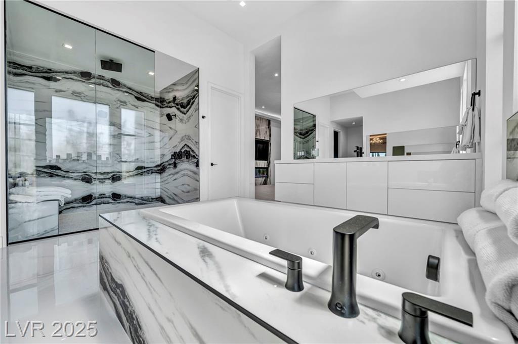 Discover a residence that redefines modern sophistication in Northwest Las Vegas. Designed with precision and intention, this architectural masterpiece blends clean contemporary lines with warm natural light, setting a new standard for refined desert living. The open-concept design flows effortlessly into multiple entertaining spaces, enhanced by sleek finishes and advanced smart-home technology. Gourmet kitchen has an expansive waterfall island, outfitted with professional-grade appliances and a hidden walk-in pantry. The primary suite features a private haven with a spa-inspired bath and 2 custom walk-in closets. Each additional bedroom is appointed with its own en-suite bath. Outdoors, the residence transforms into a resort setting. Meticulously landscaped grounds surround a heated pool and spa, complemented by a sauna and multiple lounging areas. From sunrise to sunset, every moment here is framed in luxury. This home—it's a statement of prestige, privacy, and modern elegance.