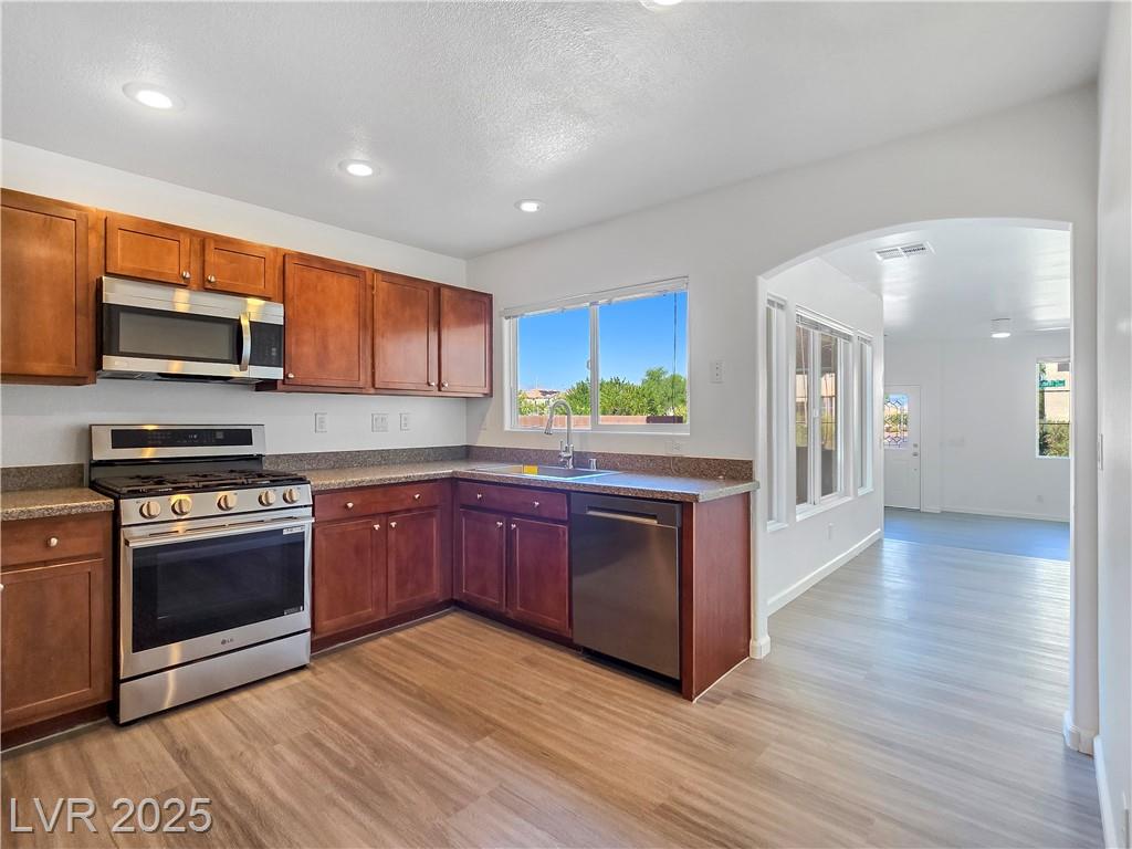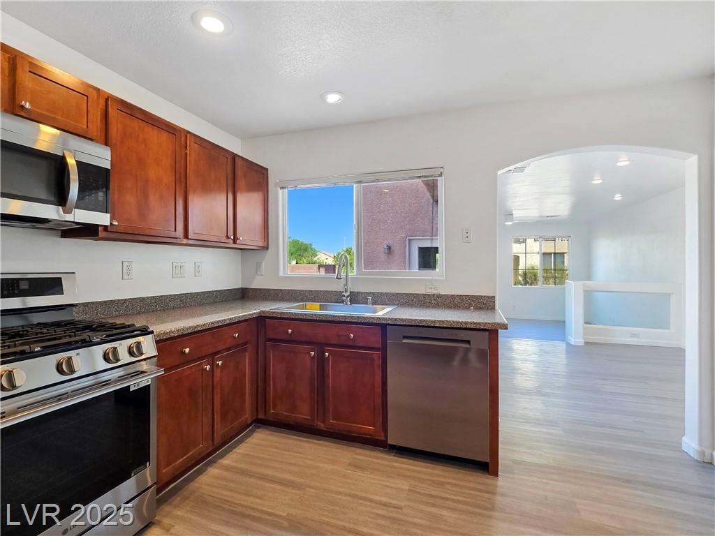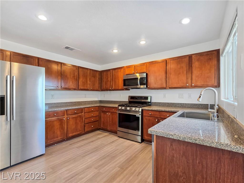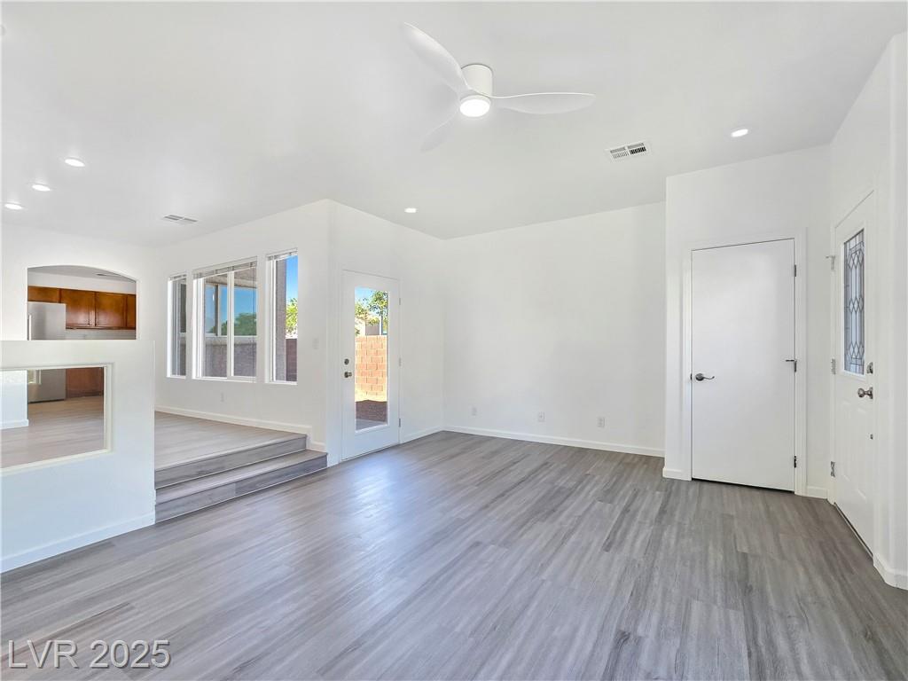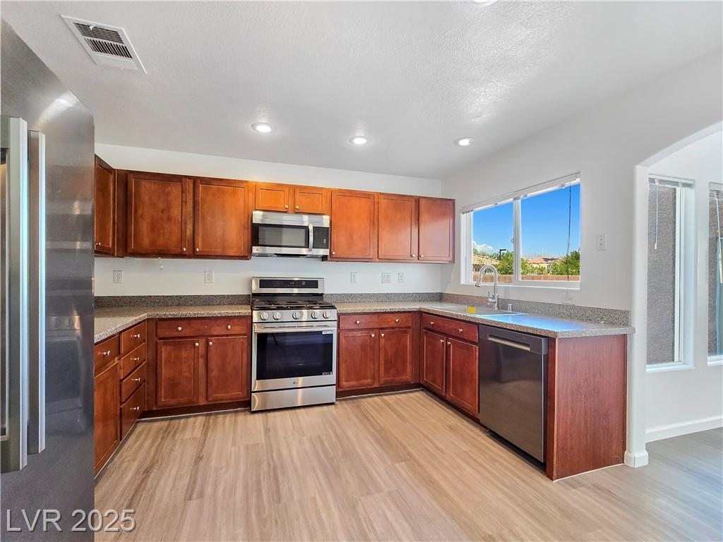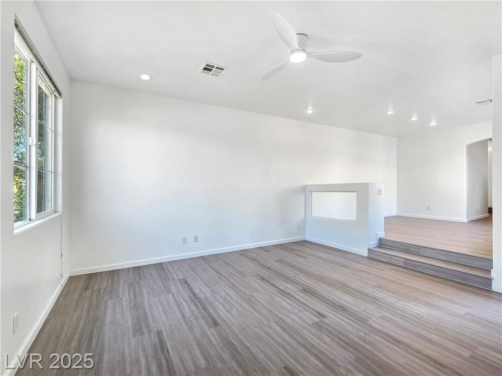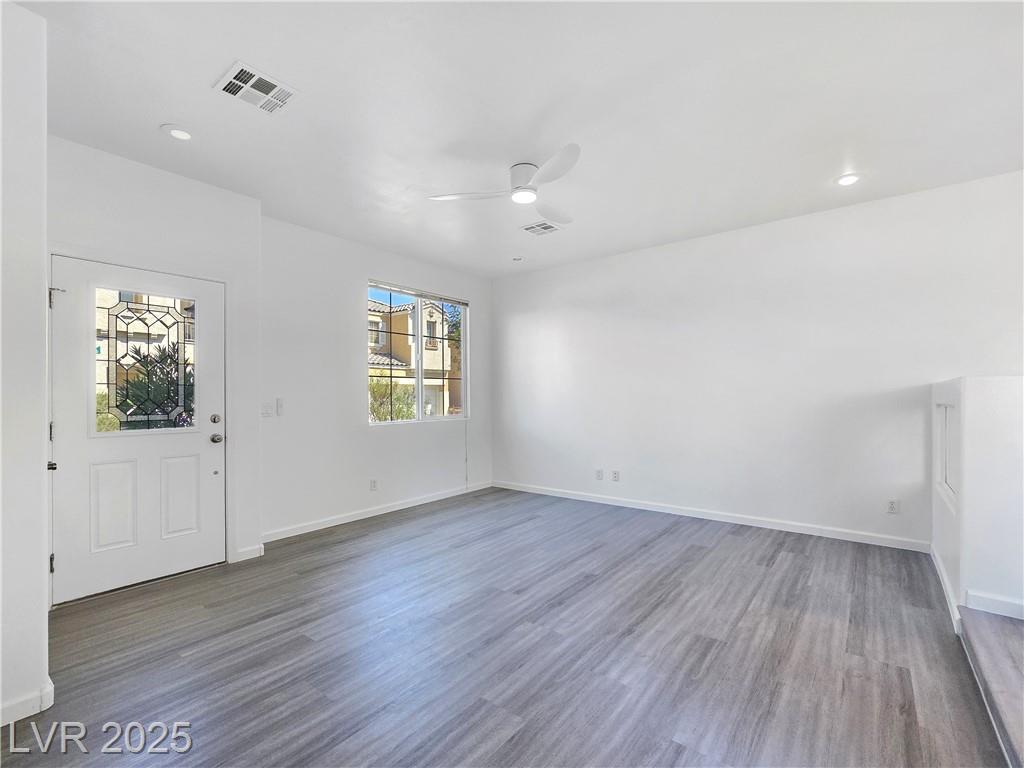 Charming property located in SW Las Vegas. Completely remodeled! The home sits on a  large corner lot directly across the pool and playground! Open and airy floor plan with lots of natural lighting. Chef kitchen with granite counters, custom cabinets and new stainless appliances. The primary retreat has a walk out balcony and primary bathroom has double sinks, separate tub and shower. The location is ideal, with quick and easy access to shopping, dining, entertainment, freeways, the Strip, and airport.