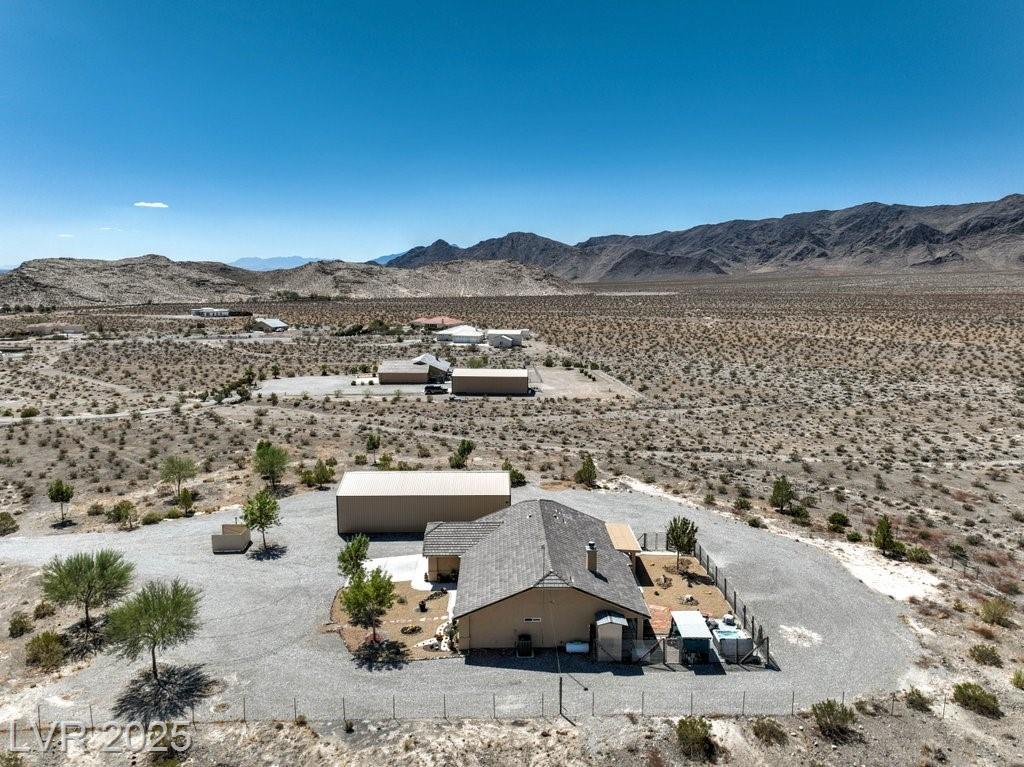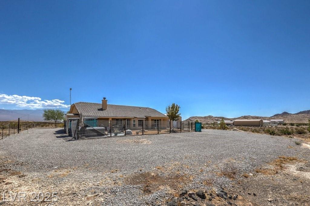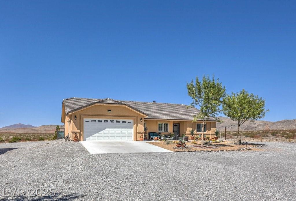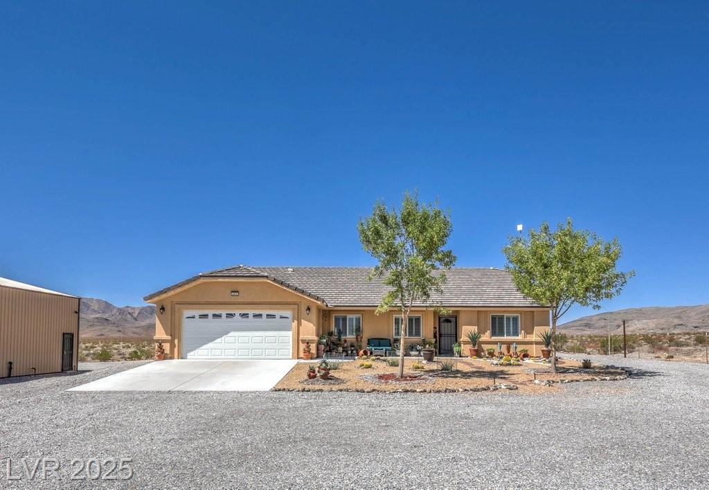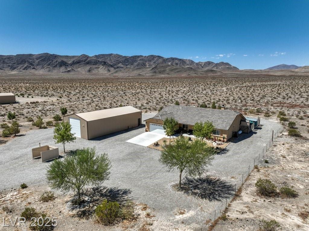 Welcome to this stunning 3 bedroom, 2 bathroom home on just under 5 acres in Pahrump, zoned for horses and surrounded by beautiful mountain views and BLM land. With 1,905 sq. ft. of living space, this property offers a bright open layout featuring granite countertops, stainless steel appliances, and a covered patio. Relax and unwind in the jacuzzi while taking in the desert sunsets. The home also includes Rolladen shutters on all rear windows for added comfort and security. The large drive-through workshop/RV garage is complete with a pellet stove/heater, water hookup with sink, and plenty of room for projects or storage. Propane and a generator are located at the well house, ensuring year-round reliability. With a 2-car garage, ample outdoor space, and horse zoning, this home blends privacy, functionality, and country living at its best.