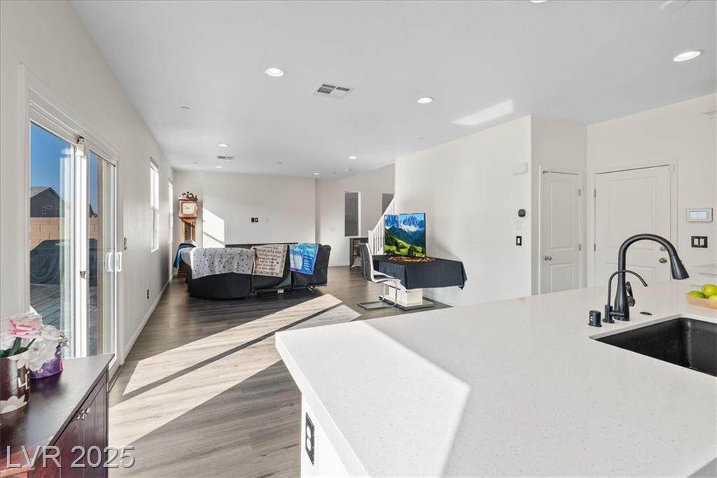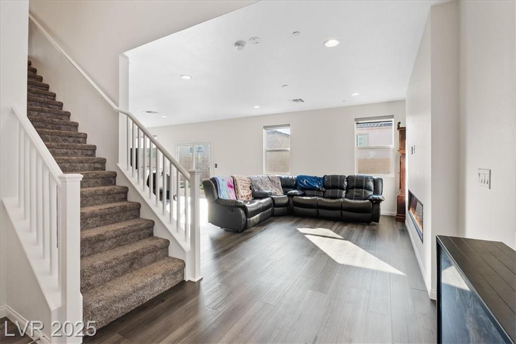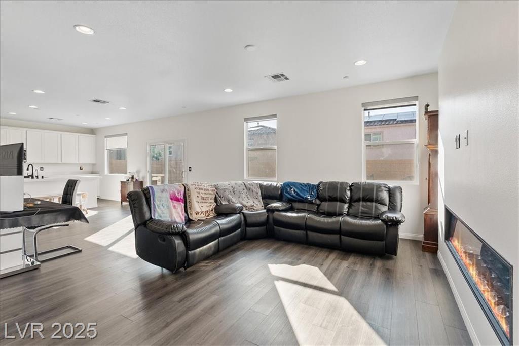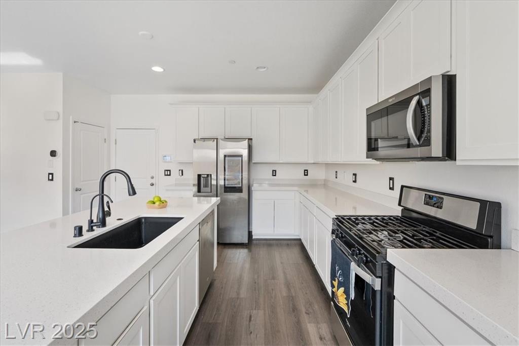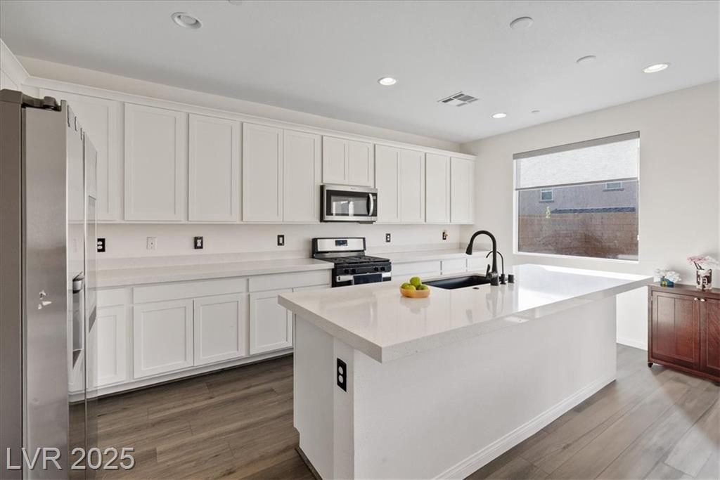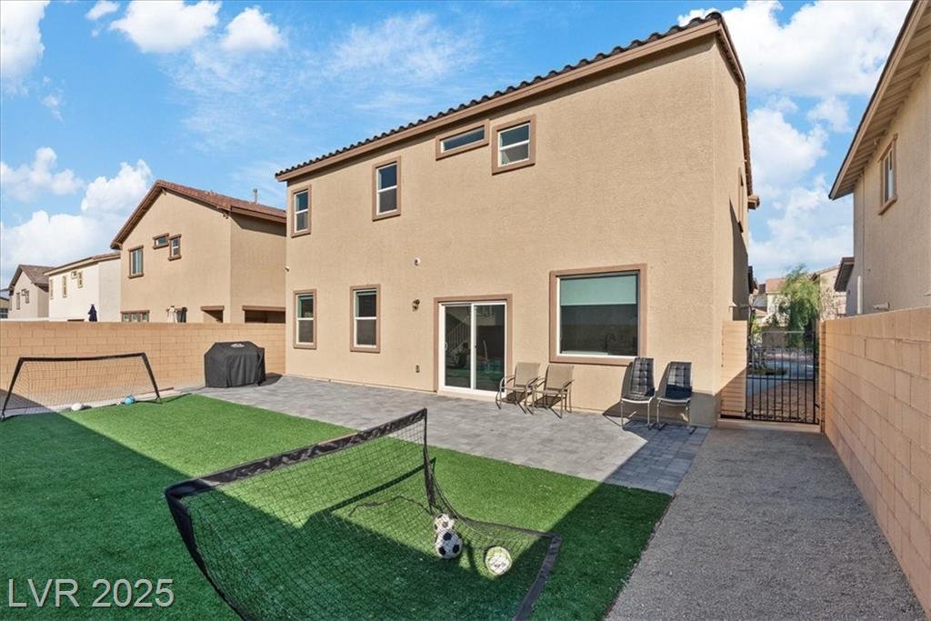 Welcome to this stunning 4 bedroom, 3 bathroom home in Henderson with an oversized 2-car garage. The beautiful kitchen features quartz countertops, stainless steel appliances, a spacious island with sink, and a large window for natural light. The open floor plan offers a dining space and cozy living room with fireplace, complemented by luxury plank vinyl flooring throughout the first floor. A convenient downstairs bedroom adds flexibility. Upstairs, the large primary suite boasts an ensuite bathroom with walk-in closet, along with a versatile loft and laundry room with shelving. The backyard is perfect for entertaining with pavers and low-maintenance turf. Located near Cadence Central Park, this home combines comfort and convenience in a highly desirable community.