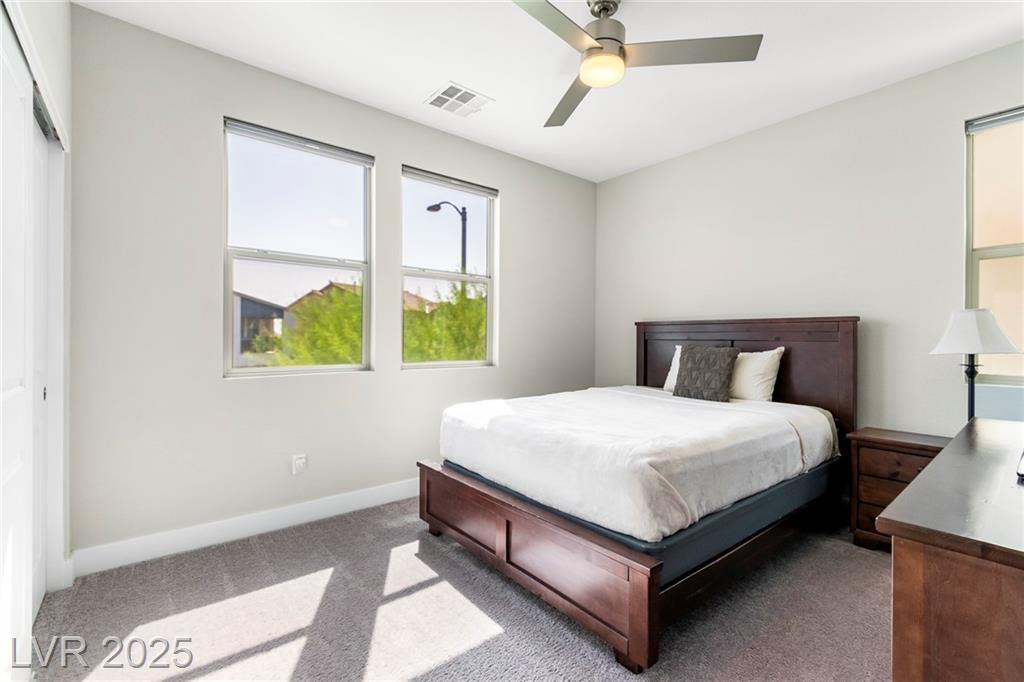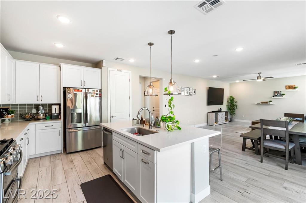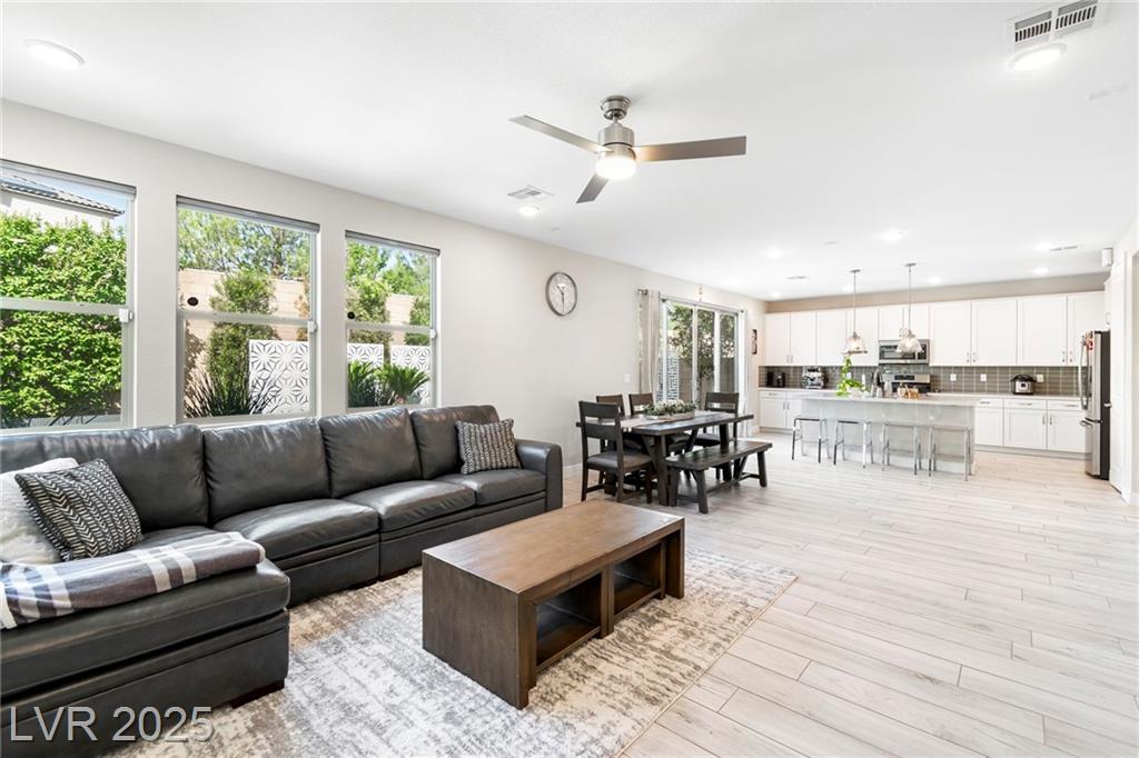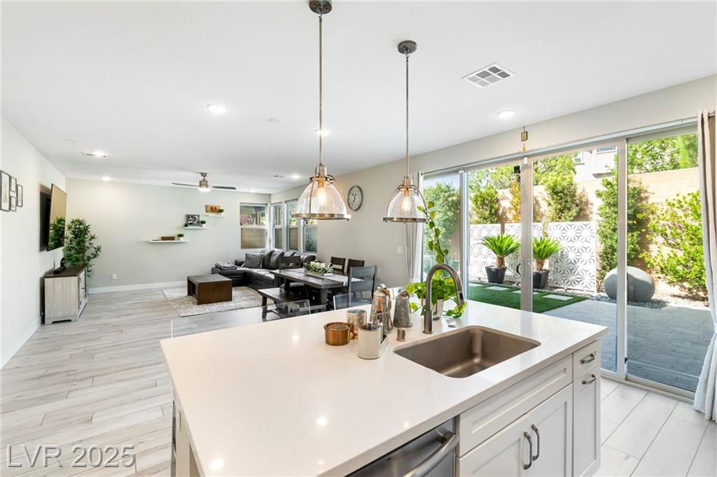 Welcome to this beautifully upgraded home in the heart of Skye Canyon, where simplicity meets sophistication. Thoughtfully designed with modern finishes throughout. This home offers comfort, style, and functionality in every corner. The chef’s kitchen features a sleek quartz island, upgraded cabinetry, and stainless steel appliances, seamlessly flowing into the open-concept dining and living area. A flexible downstairs den/office provides the ideal space for remote work or a cozy retreat. Upstairs, is a spacious primary suite with a spa-inspired bathroom, along with two generously sized secondary bedrooms offering ample space. Step outside to your private oasis—an artfully landscaped backyard designed for tranquility and relaxation. Highly sought-after Skye Canyon community, residents enjoy access to resort-style amenities including pools, parks, fitness centers, sports courts, and more. This home truly has it all—modern upgrades, functional spaces, and a lifestyle you’ll love.