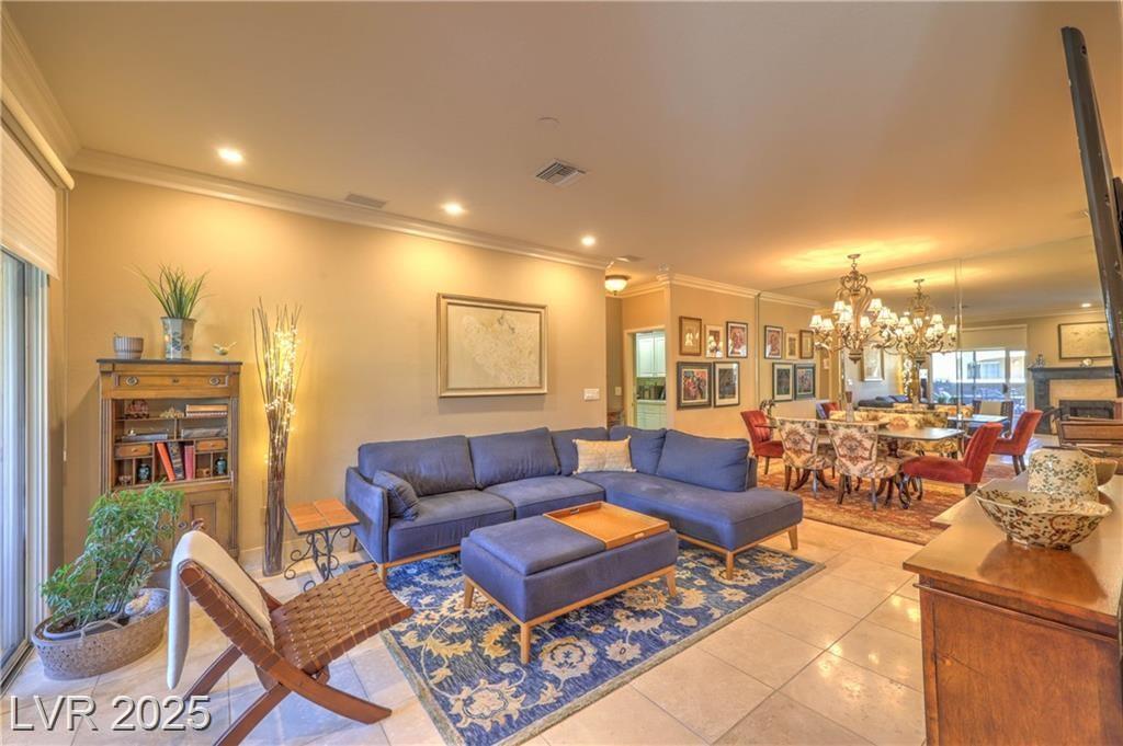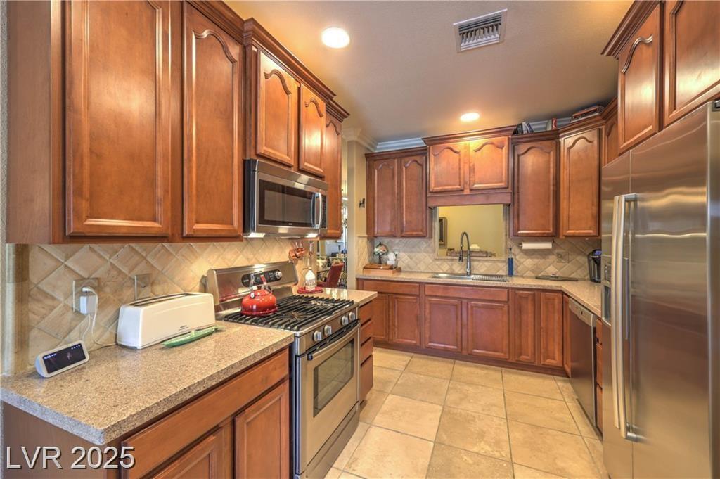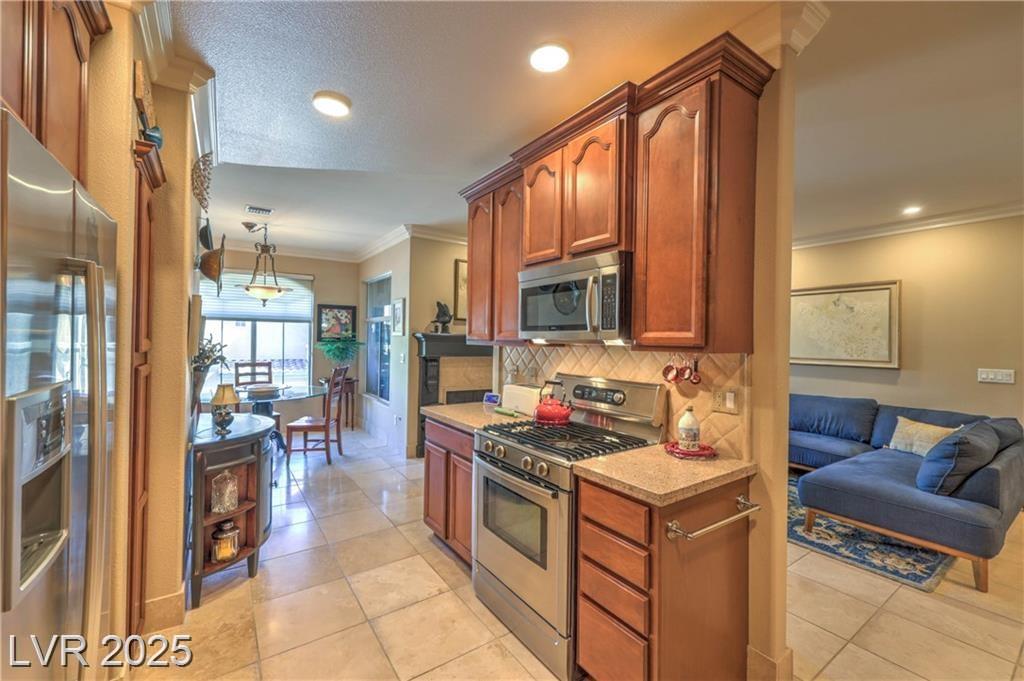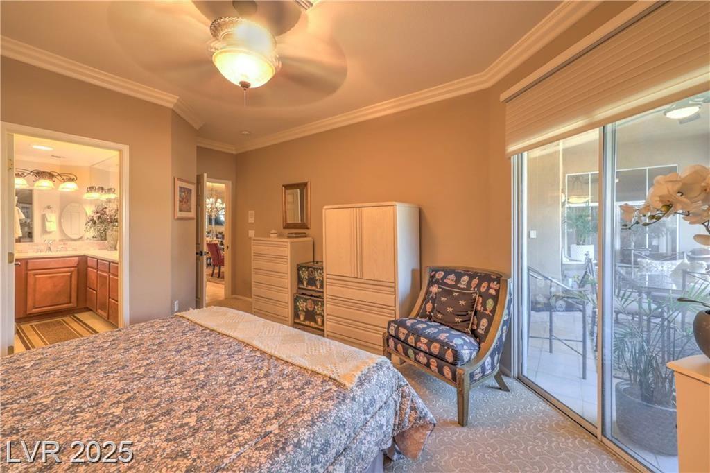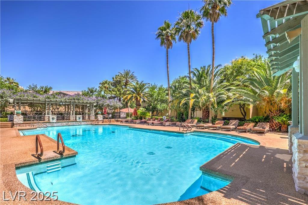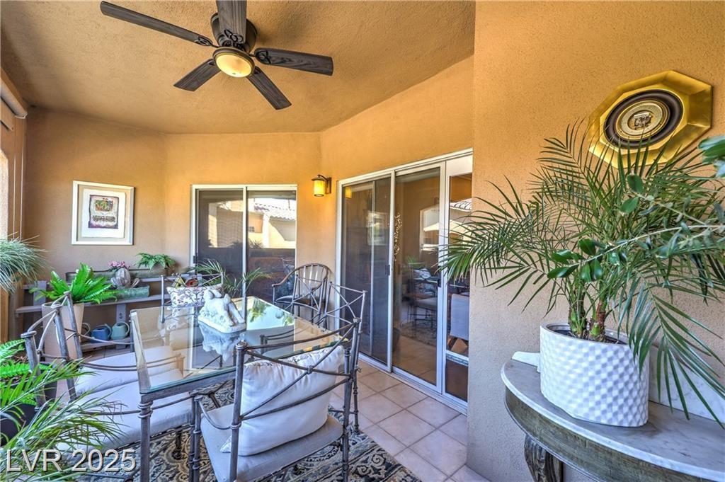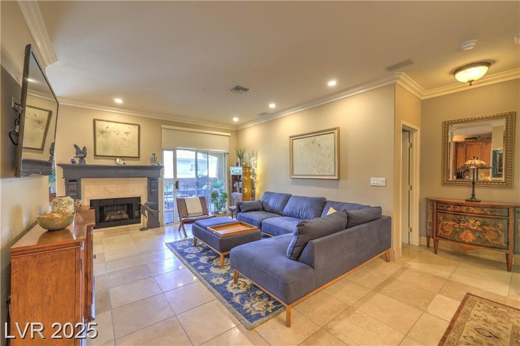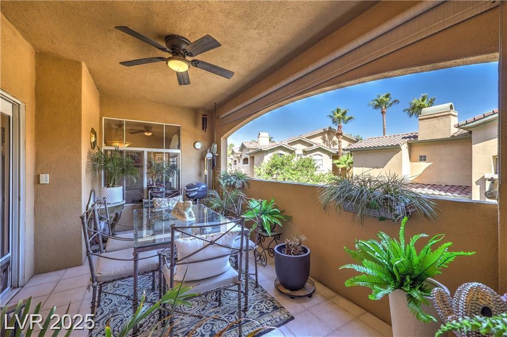 Rare opportunity in the guard gated Summerlin North Red Hills community! This is the largest floorplan which offers an oversized 2 car garage. Highly upgraded & well cared for home features 18" x 18" travertine flooring, crown molding throughout, upgraded window coverings + ceiling fans. Beautifully upgraded granite counters in the kitchen and bathrooms. Kitchen features upgraded backsplash, SS appliances + soft closing drawers w/ pullouts for added functionality. Huge laundry room- plenty of storage + a sink. Step into the primary bedroom... It offers comfort, a walk-in closet + access to the covered balcony. You can easily convert one of the other 2 bedrooms into your studio, hobby room or office. Added value- HOA includes most utilities!! 10X 6 storage room in garage. Located steps to the pool / fitness center. Red Hills is minutes to Tivoli Village, top rated schools, Summerlin Parkway and Bruce Trent Park w/ scenic nature trails great for walking & biking. Must see!