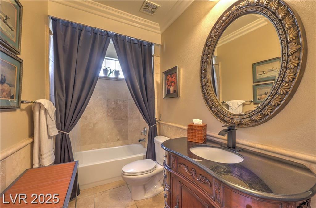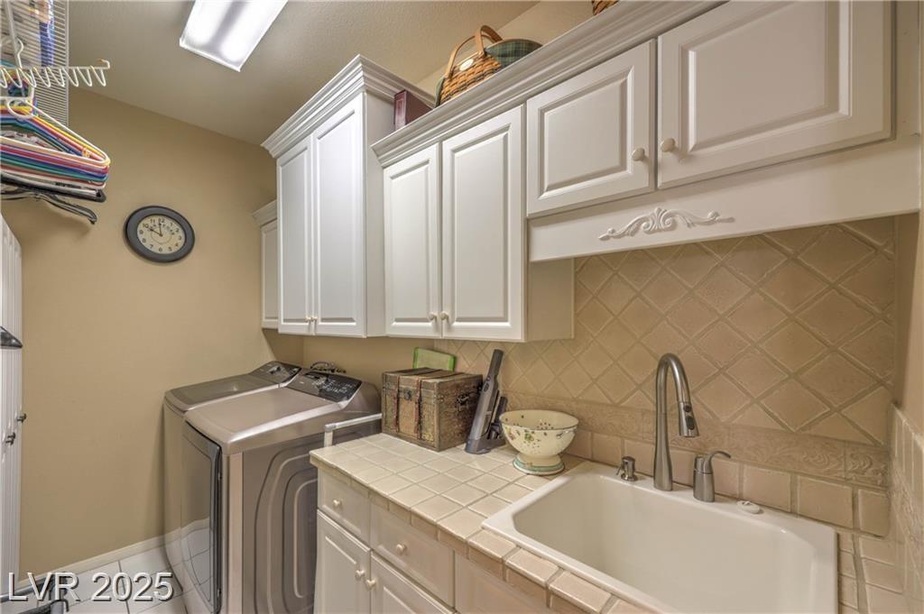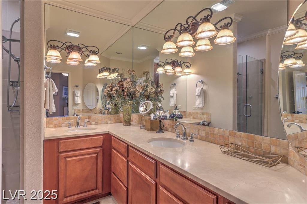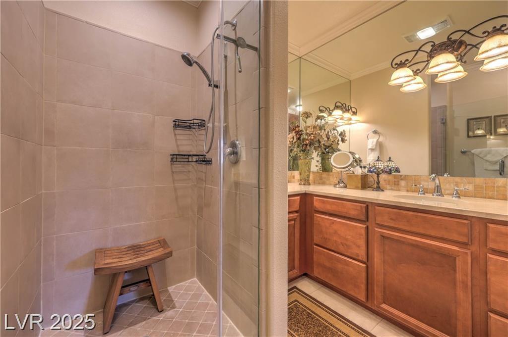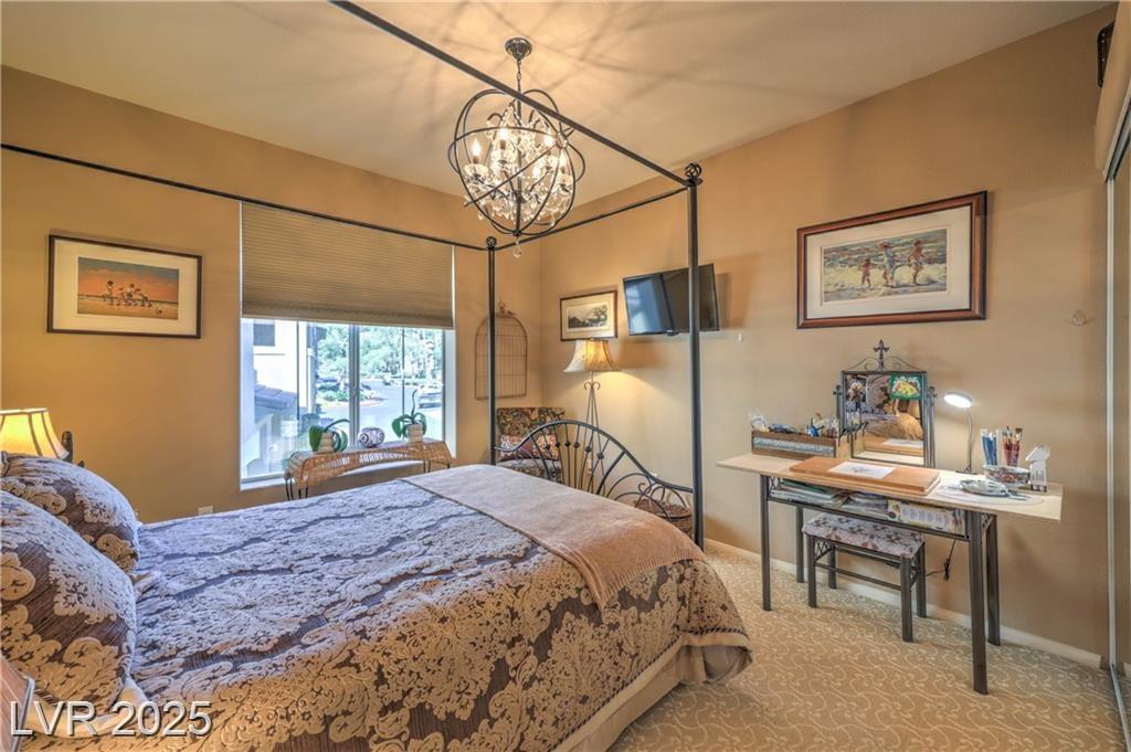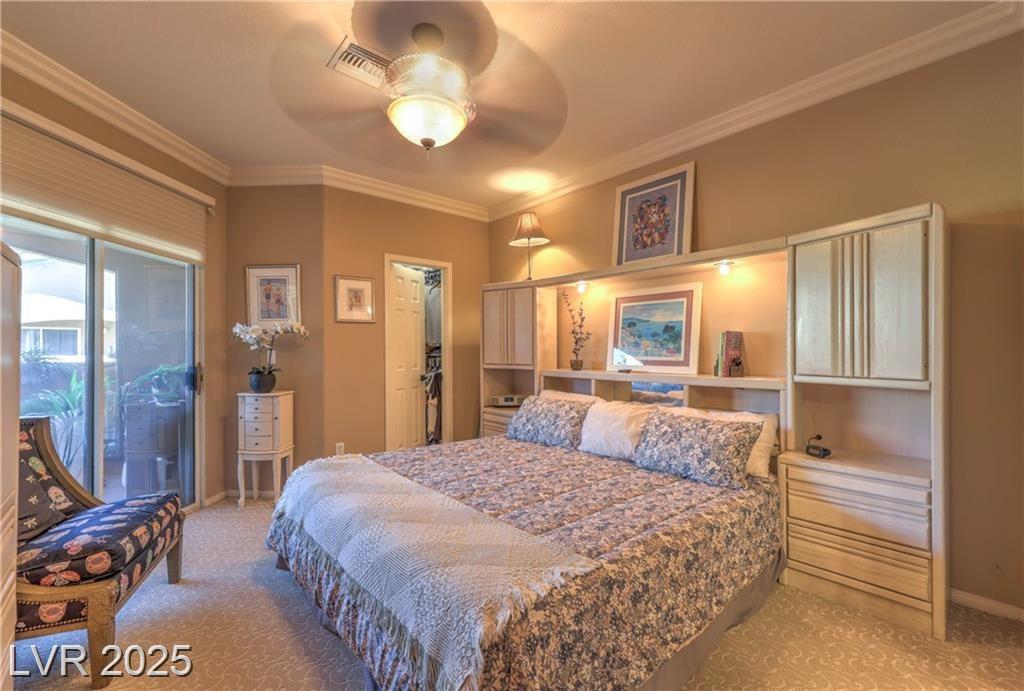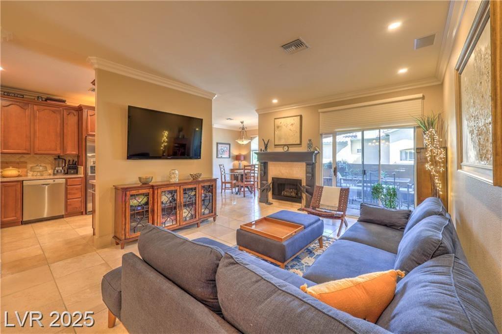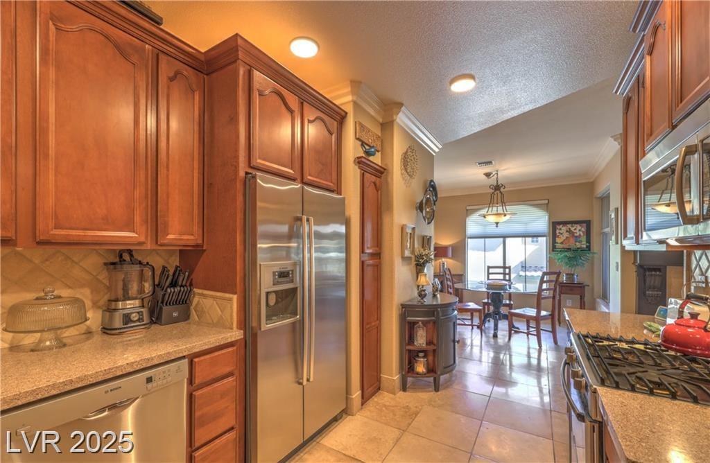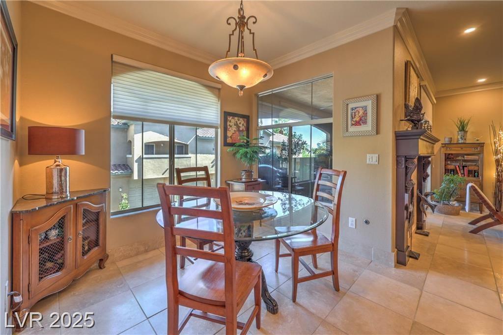 Rare opportunity in the guard gated Summerlin North Red Hills community! This is the largest floorplan which offers an oversized 2 car garage. Highly upgraded & well cared for home features 18" x 18" travertine flooring, crown molding throughout, upgraded window coverings + ceiling fans. Beautifully upgraded granite counters in the kitchen and bathrooms. Kitchen features upgraded backsplash, SS appliances + soft closing drawers w/ pullouts for added functionality. Huge laundry room- plenty of storage + a sink. Step into the primary bedroom... It offers comfort, a walk-in closet + access to the covered balcony. You can easily convert one of the other 2 bedrooms into your studio, hobby room or office. Added value- HOA includes most utilities!! 10X 6 storage room in garage. Located steps to the pool / fitness center. Red Hills is minutes to Tivoli Village, top rated schools, Summerlin Parkway and Bruce Trent Park w/ scenic nature trails great for walking & biking. Must see!