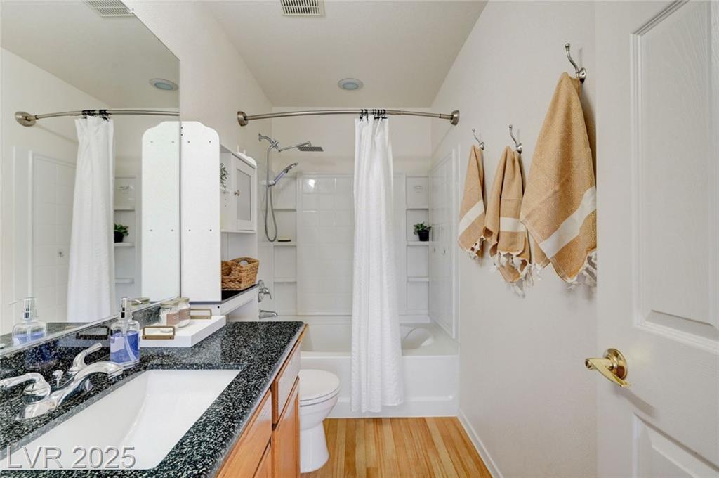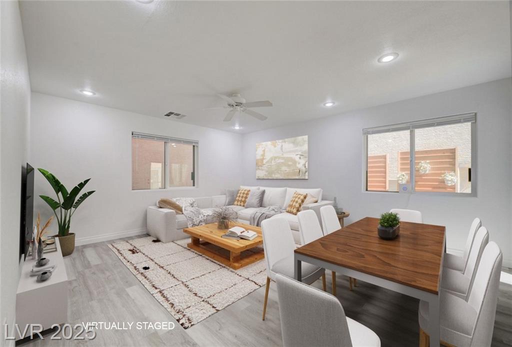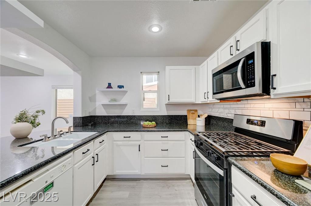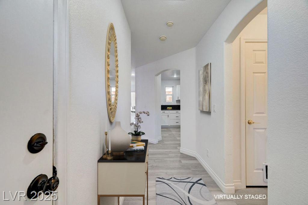 Begin your homeownership dream in this 3 Bedroom + Two Car Garage Home. Prime Southwest 89148 (IKEA, Costco, Durango Casino). The welcoming family room is the heart of the home, where lasting memories are made while cooking in a Modern, Updated Kitchen with newer cabinets, Sleek Granite Countertops, Stainless Steel Appliances, & Breakfast Peninsula. Graceful Arches and Luxury Plank flooring adorn the main floor with Brand New Carpet Upstairs. The Primary Bedroom upstairs has an En-Suite garden tub bathroom, Walk-In Closet w/ French doors to the balcony for fresh outdoor views. Low-Maintenance & drought-resistant cozy intimate backyard patio. Energy-efficient Central AC Averages $178 power bills. Live in a charming neighborhood tucked away from Warm Springs with a low $90 HOA, including Two Pools, Two Pet/Play Parks, 24 Hour Roving Safety/Security Patrol. Top Schools, Scenic Parks, Mountains, Dining, Designer Gyms, Groceries. Enjoy the lifestyle without the work in this lovely home.