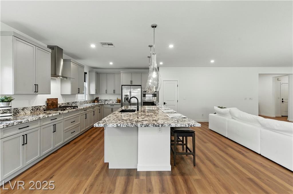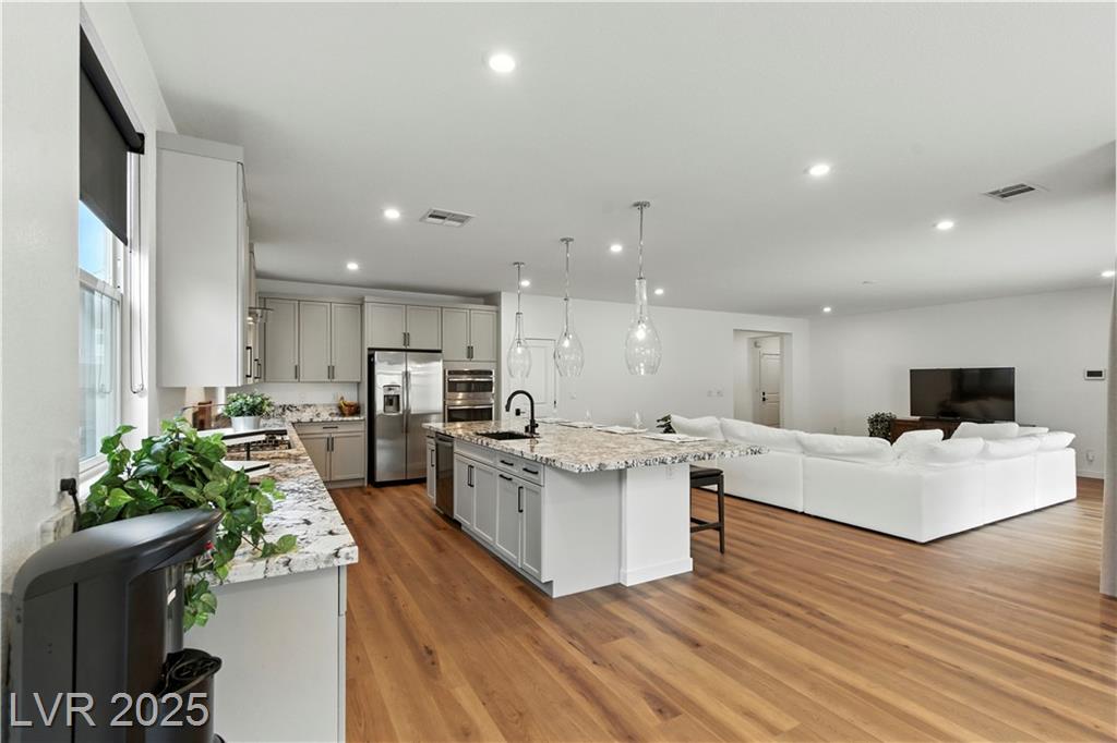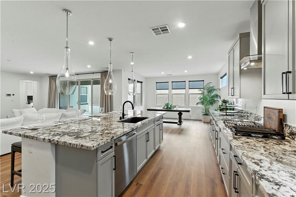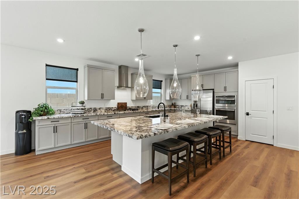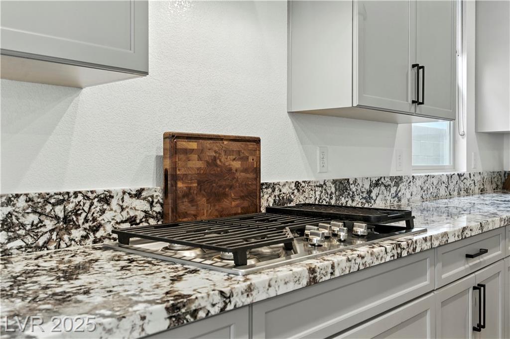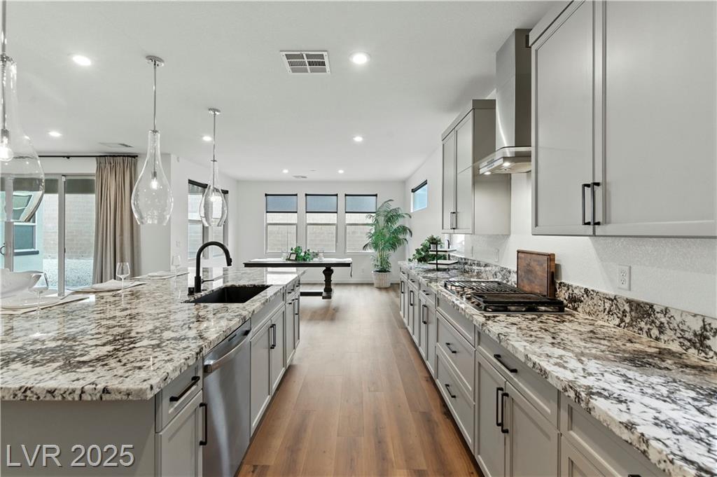 Welcome to this stunning 4-bed (1 is Den w/ Doors) 2.5-bath single-story home designed for modern living. Your future residence features an open-concept layout with a spacious great room that seamlessly connects to the gourmet kitchen. Here you’ll find stainless steel appliances, a gas cooktop with a sleek stainless-steel glass wall-mounted range hood, built-in oven, expansive island, and modern cabinetry—perfect for both everyday meals and entertaining. The luxurious primary suite offers a spa-like bathroom & generous walk-in closet, while the secondary bedrooms provide comfort & flexibility. Outside to you'll enjoy a large covered patio with recessed lighting, overlooking a low-maintenance backyard. Home has been upgraded w/ Smart Home Package at Panel. Located just 5 minutes from the 215 freeway & Aliante Casino/Hotel, this home also offers close proximity to parks, shopping, dining, & top-rated schools. Style, comfort, & convenience come together in this beautifully designed home!