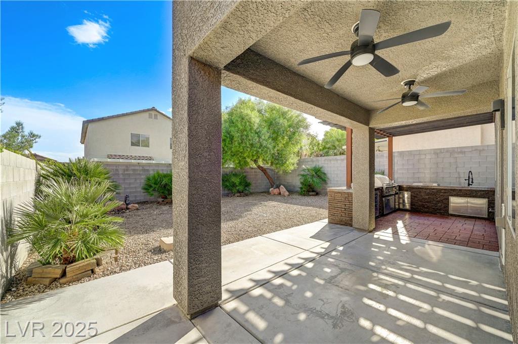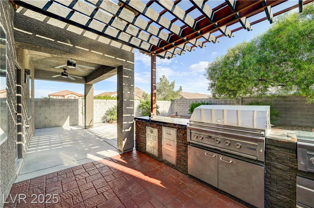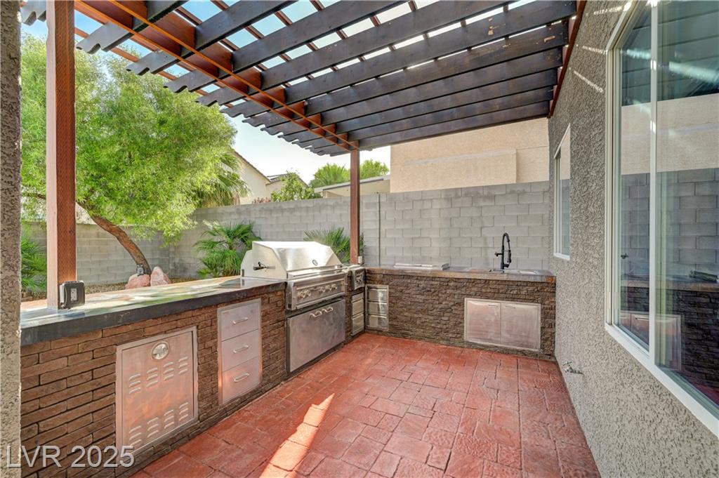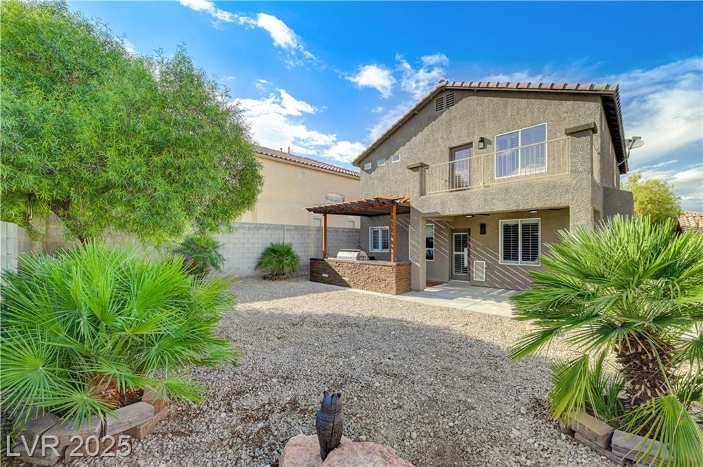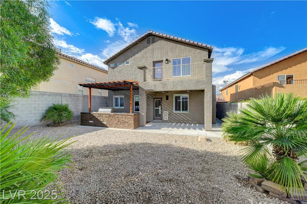 WELCOME to your move-in ready 4 bedroom 3 bathroom home with several high-end BRAND NEW features and upgrades! Host unforgettable gatherings in the backyard with a Lynx outdoor kitchen featuring natural gas, garbage disposal, and custom epoxy concrete counters that have never been used— while guests are under the covered patio with 2 ceiling fans. The open floorplan flows into a modern kitchen with BRAND NEW stainless steel appliances, Dandy wine & beverage coolers too. Upstairs the spacious primary suite offers a private balcony with stunning Strip views and a spa-style bathroom with a digital Kohler shower with steam, massage, and built-in speakers. Additional 3 bedrooms and a loft upstairs with a BRAND NEW bathroom featuring an anti-fog LED mirror and multi-white lighting. Enjoy peace of mind with smart home tech: security cameras, digital locks, sensors & included Netgear router + modem. This home blends everyday comfort with entertainer’s luxury! Turn this house into your home.