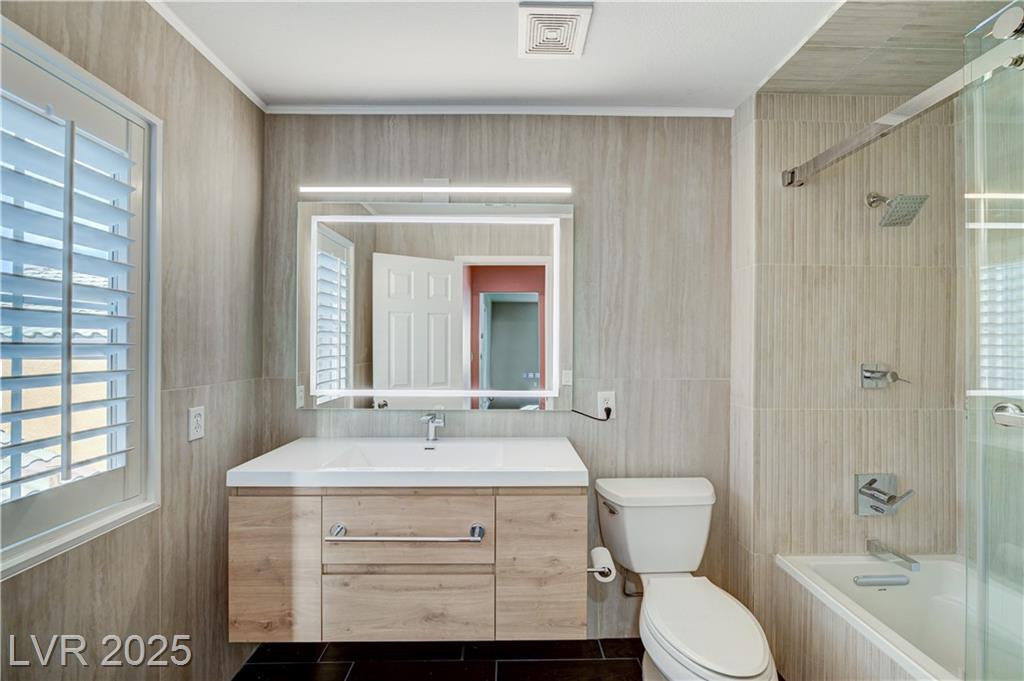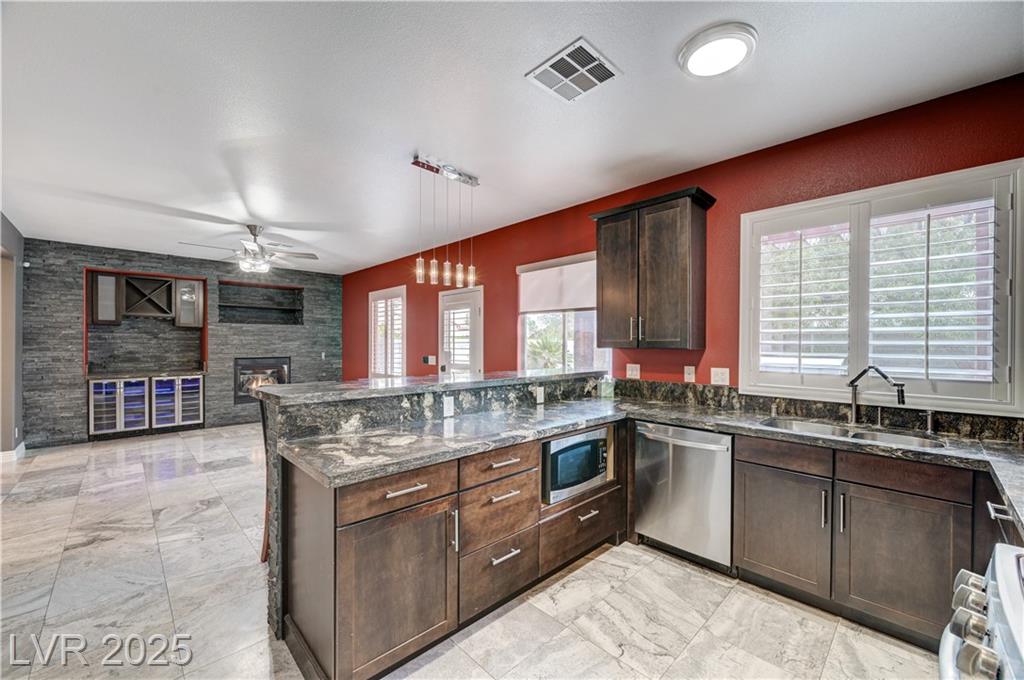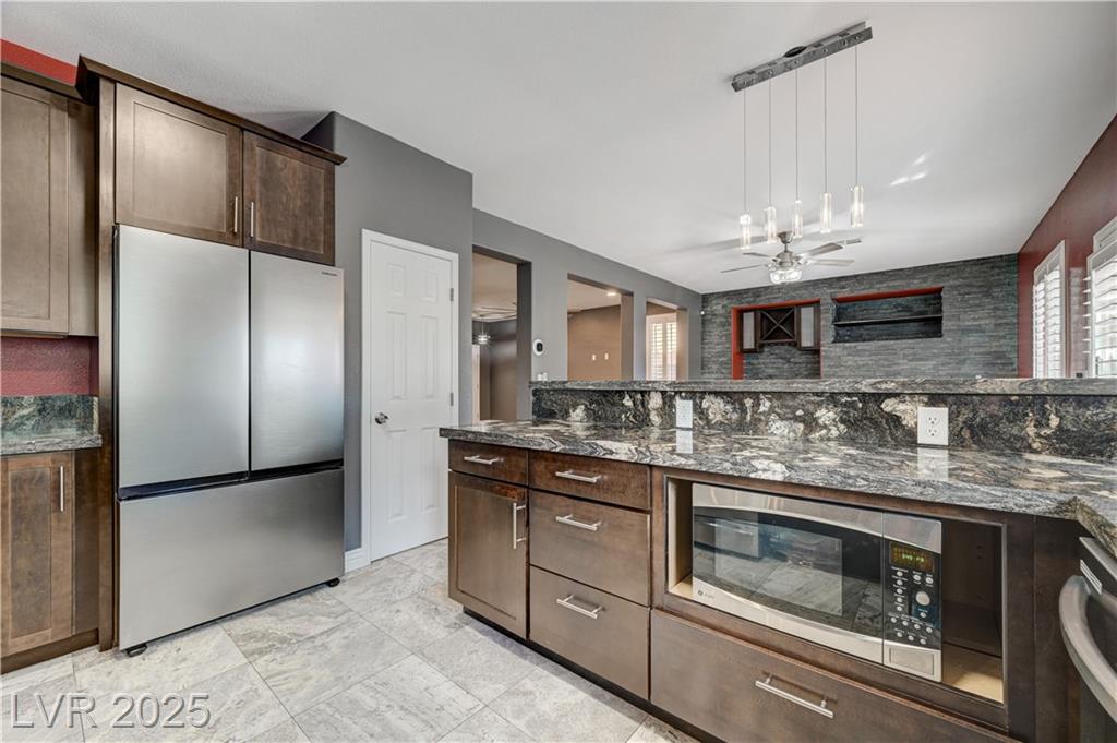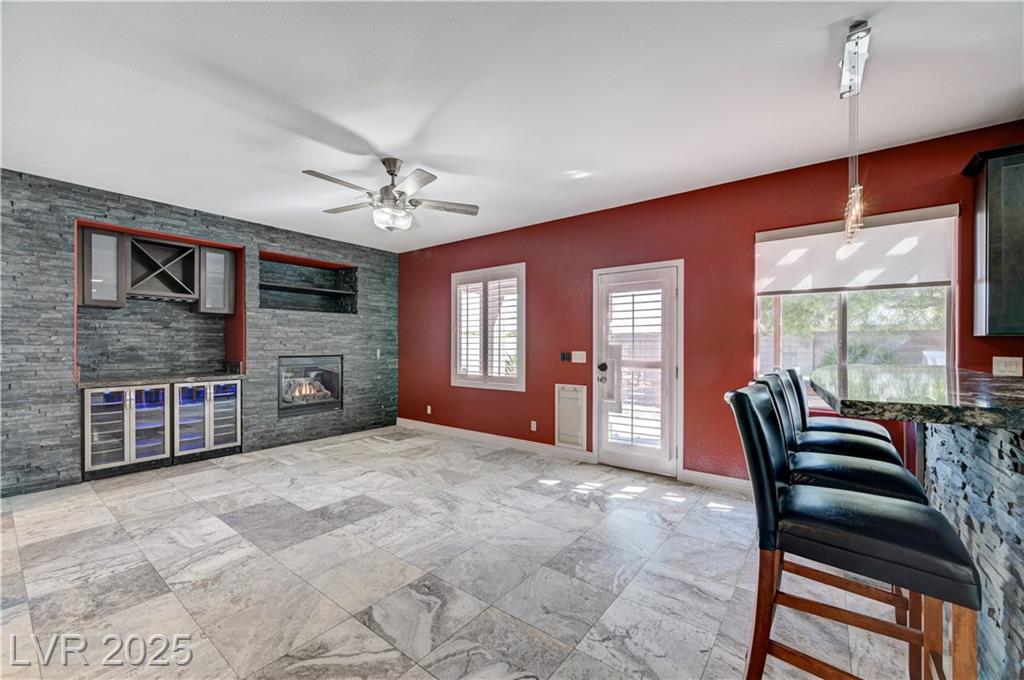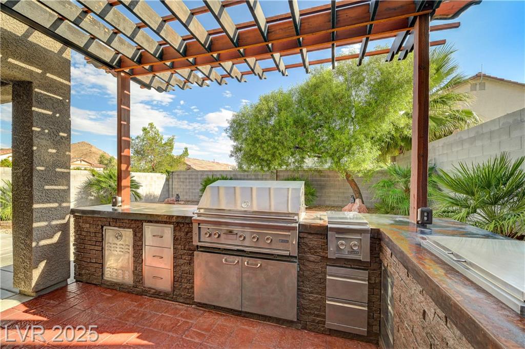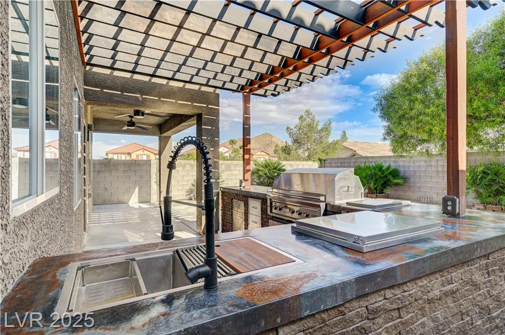 WELCOME to your move-in ready 4 bedroom 3 bathroom home with several high-end BRAND NEW features and upgrades! Host unforgettable gatherings in the backyard with a Lynx outdoor kitchen featuring natural gas, garbage disposal, and custom epoxy concrete counters that have never been used— while guests are under the covered patio with 2 ceiling fans. The open floorplan flows into a modern kitchen with BRAND NEW stainless steel appliances, Dandy wine & beverage coolers too. Upstairs the spacious primary suite offers a private balcony with stunning Strip views and a spa-style bathroom with a digital Kohler shower with steam, massage, and built-in speakers. Additional 3 bedrooms and a loft upstairs with a BRAND NEW bathroom featuring an anti-fog LED mirror and multi-white lighting. Enjoy peace of mind with smart home tech: security cameras, digital locks, sensors & included Netgear router + modem. This home blends everyday comfort with entertainer’s luxury! Turn this house into your home.