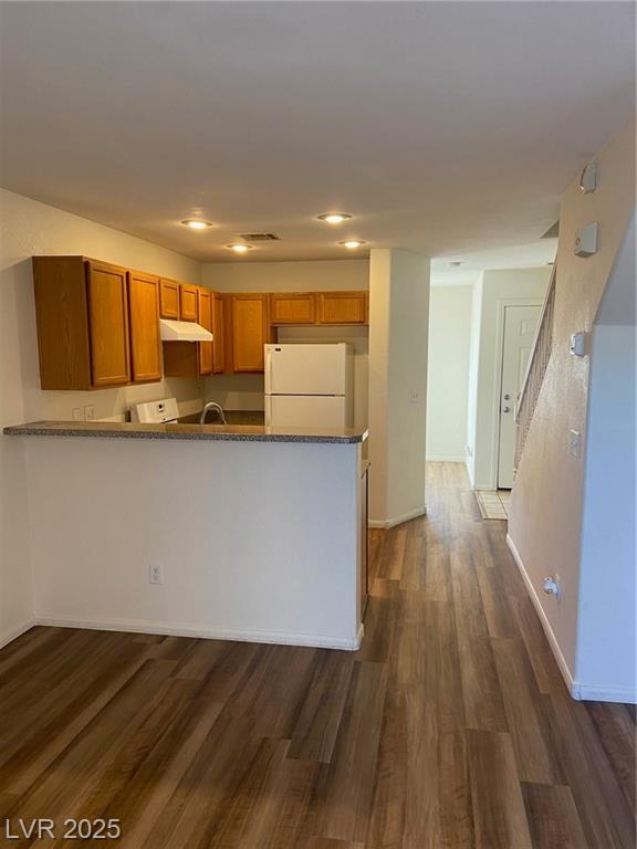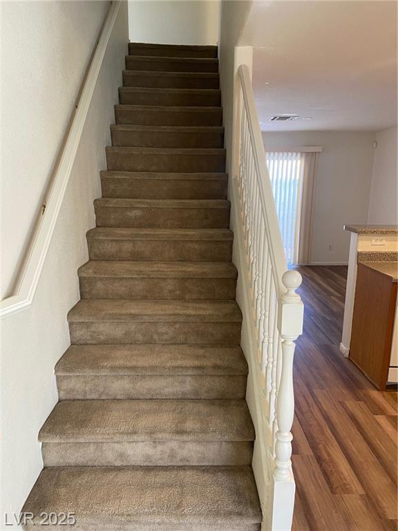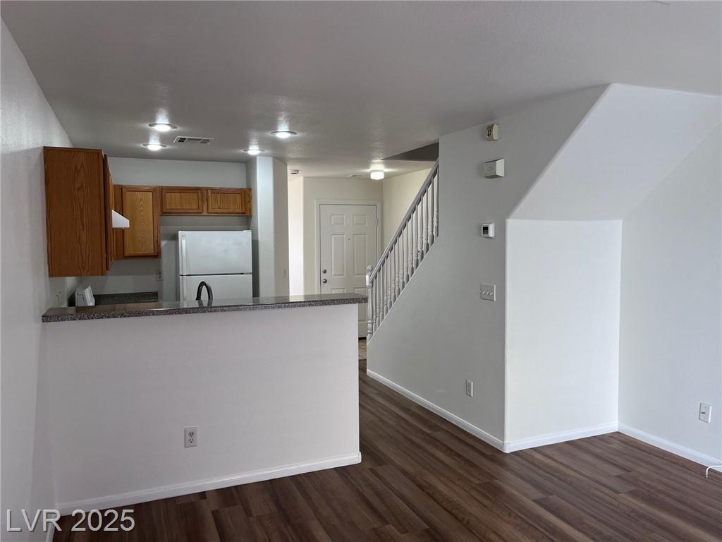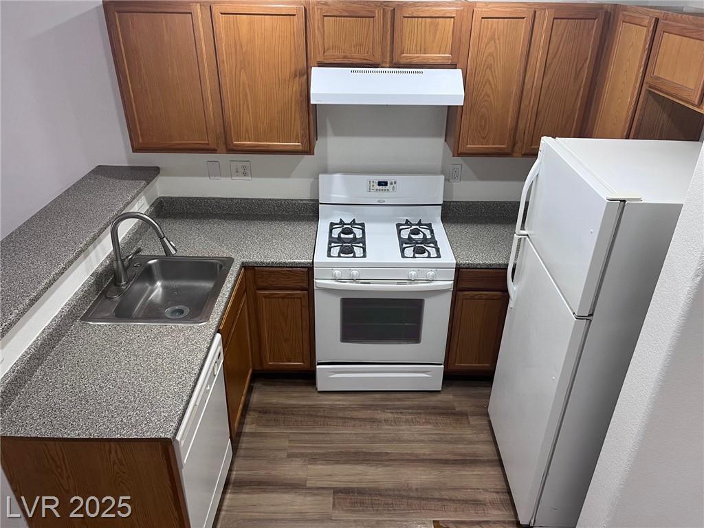 Nicely renovated and move-in ready, this charming 2-bedroom, 2.5-bath home is located in a gated community in North Las Vegas. The open-concept floor plan features fresh paint and stylish luxury plank flooring throughout, with new carpet on the stairs. The bright kitchen includes a breakfast bar and comes fully equipped with all appliances, including a full-size washer and dryer. Each bedroom offers its own private full bathroom, and a convenient half-bath is located downstairs for guests. The primary bedroom also features private balcony access—perfect for relaxing outdoors. A one-car garage with a full driveway adds extra convenience and has been freshly painted. Home includes private fenced in backyard. ** Renovation complete - Home is now Available! **