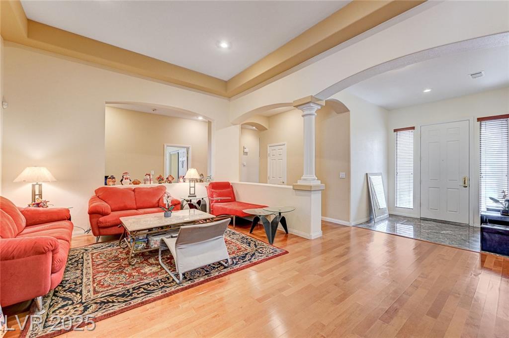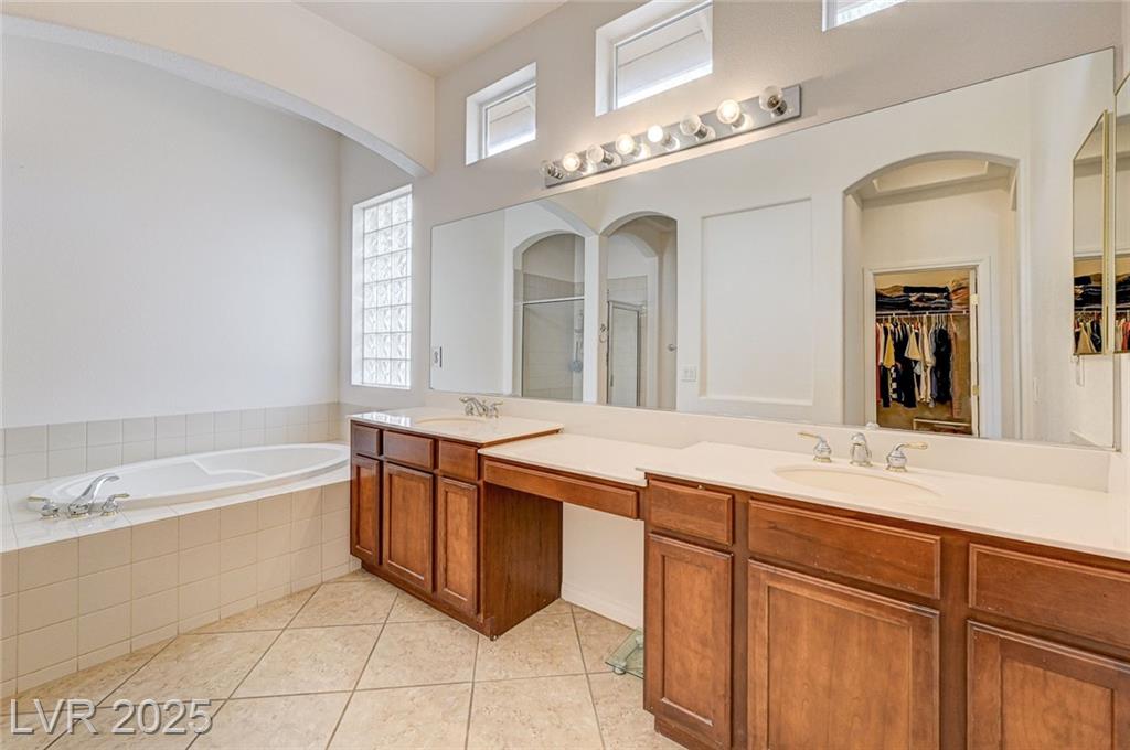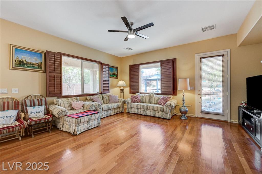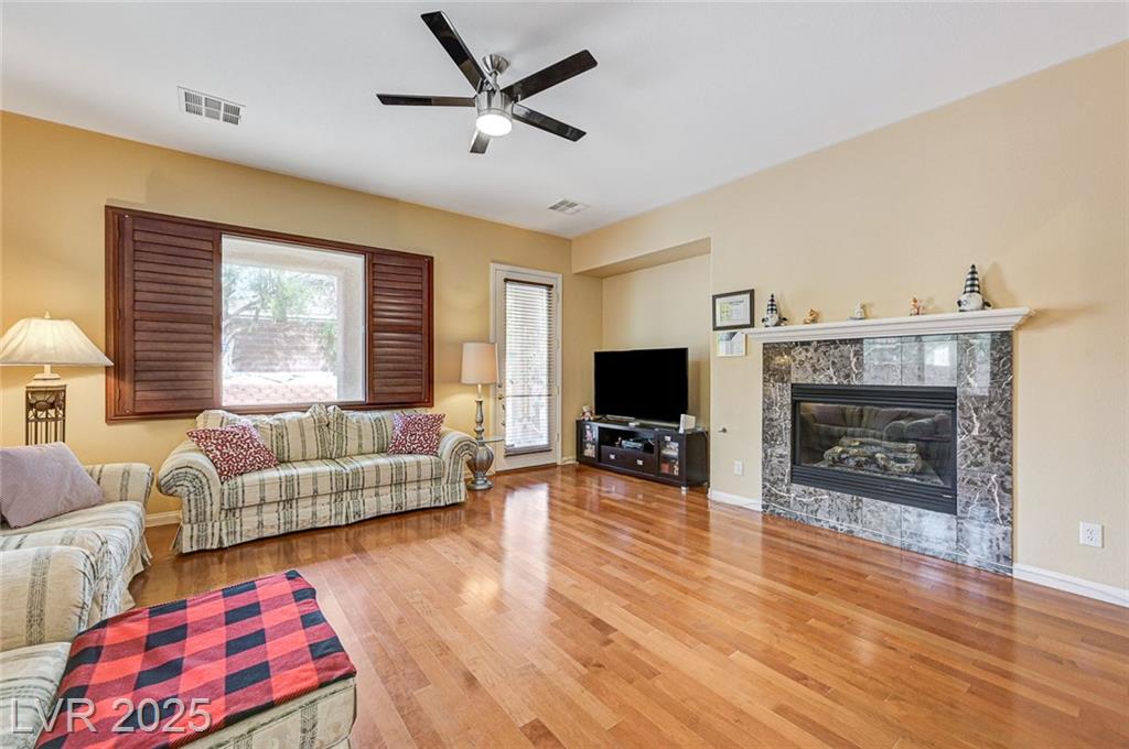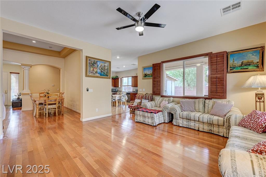 This charming Diamond Peak single-story home is located in the gated Yellowstone community in Mountain’s Edge master plan. Total 10,890 square foot lot, the expansive backyard offers endless possibilities. The house features a split 3-car garage, 4 bedrooms, and 3.5 bathrooms, with spacious 10-foot ceilings throughout. Hardwood flooring, shutters, maple cabinet, covered patio, etc…Community offers a wealth of amenities, including a clubhouse, fitness center, community pool and spa, basketball court, and park. This is truly a must-see property! Step outside to your own private oasis — a meticulously landscaped backyard perfect for entertaining, relaxing, or enjoying breathtaking sunsets over the nearby mountains. Located in the highly sought-after Mountain’s Edge master-planned community, residents enjoy access to parks, walking trails, and a variety of outdoor activities, all while being just a short drive from the vibrant heart of the city.