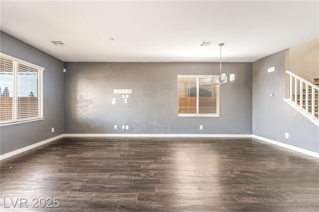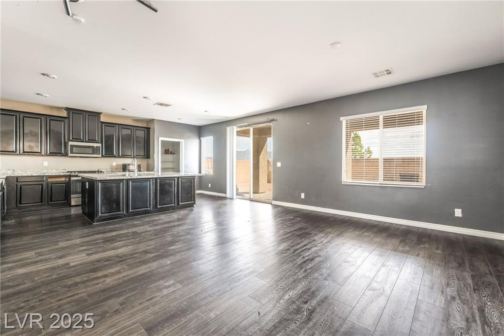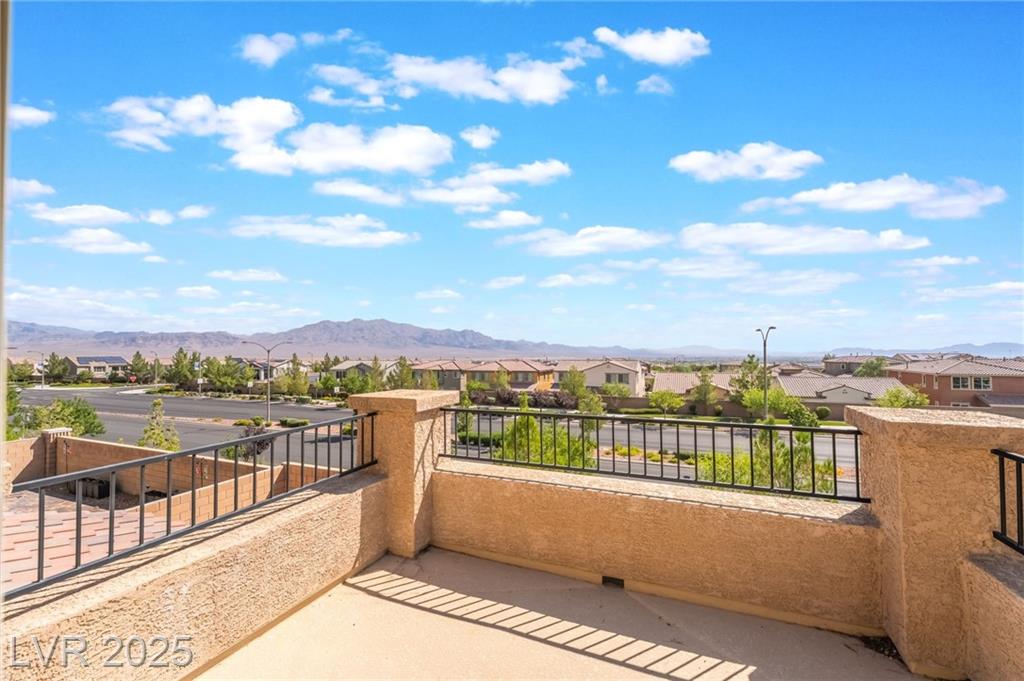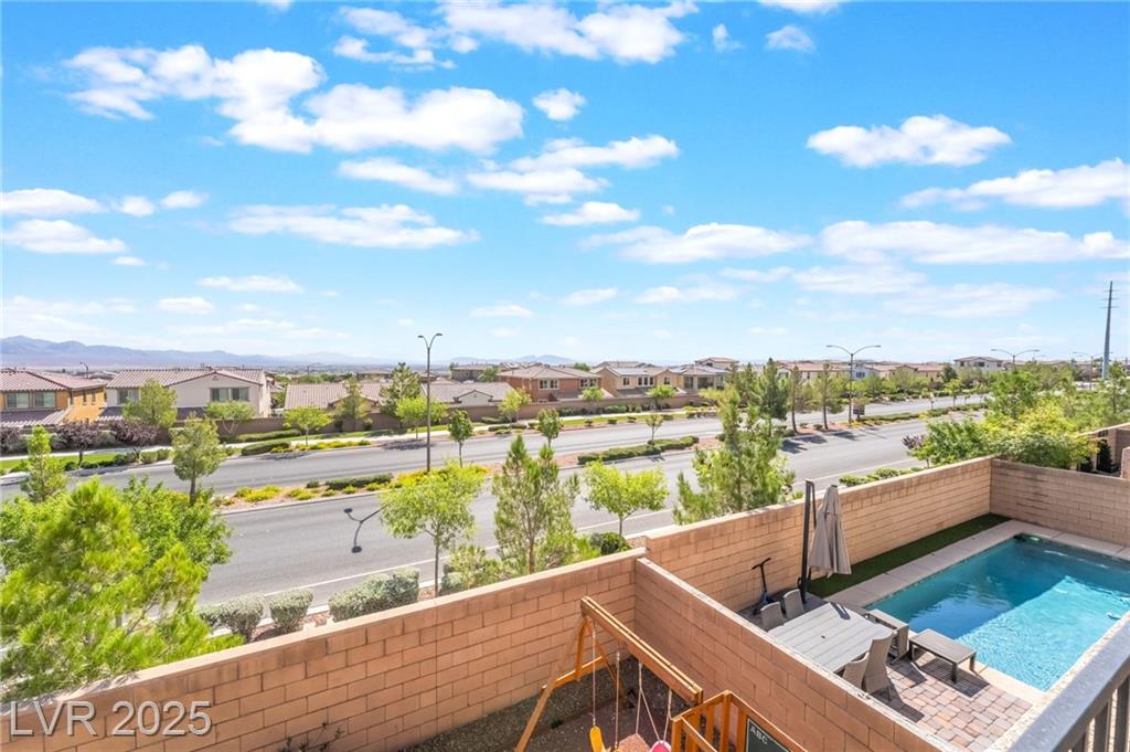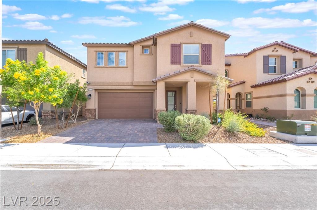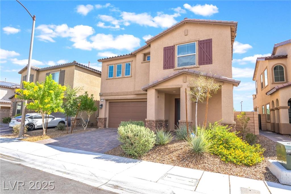 Spacious 2-story home located in Skye Canyon. Open floor plan downstairs with dark hardwood flooring. Kitchen boasts island w/ breakfast bar with granite countertops, plenty of cabinetry, large pantry, and dining area. Kitchen overlooks large living room with sliding glass doors to finished backyard. Make your way upstairs to a roomy loft just off the stairs. Primary bedroom includes balcony overlooking backyard, walk-in closet and separate shower & tub. Secondary bathroom with dual sinks and tub/shower combo.
