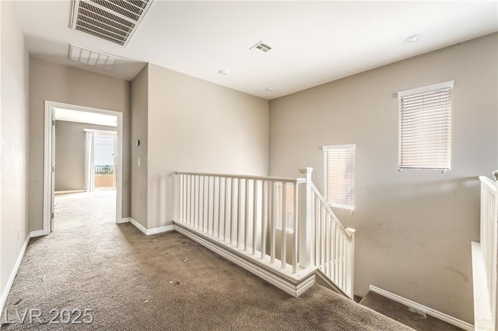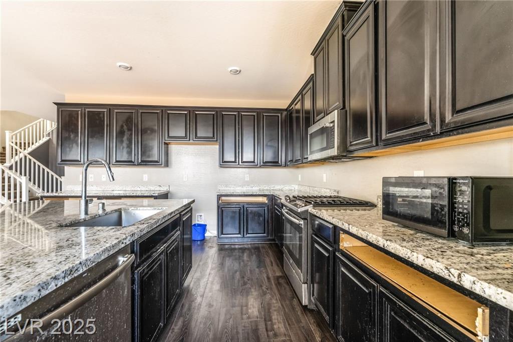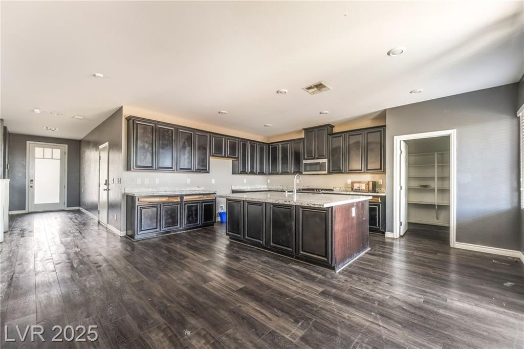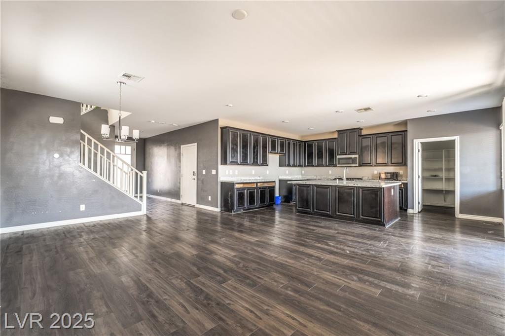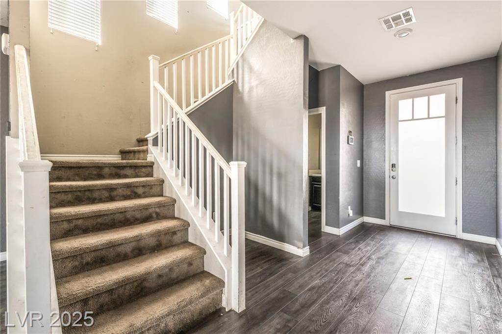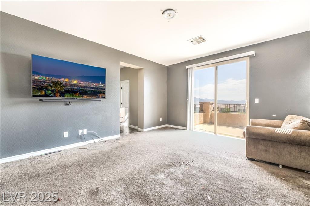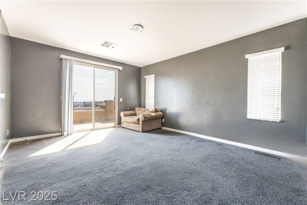Spacious 2-story home located in Skye Canyon. Open floor plan downstairs with dark hardwood flooring. Kitchen boasts island w/ breakfast bar with granite countertops, plenty of cabinetry, large pantry, and dining area. Kitchen overlooks large living room with sliding glass doors to finished backyard. Make your way upstairs to a roomy loft just off the stairs. Primary bedroom includes balcony overlooking backyard, walk-in closet and separate shower & tub. Secondary bathroom with dual sinks and tub/shower combo.