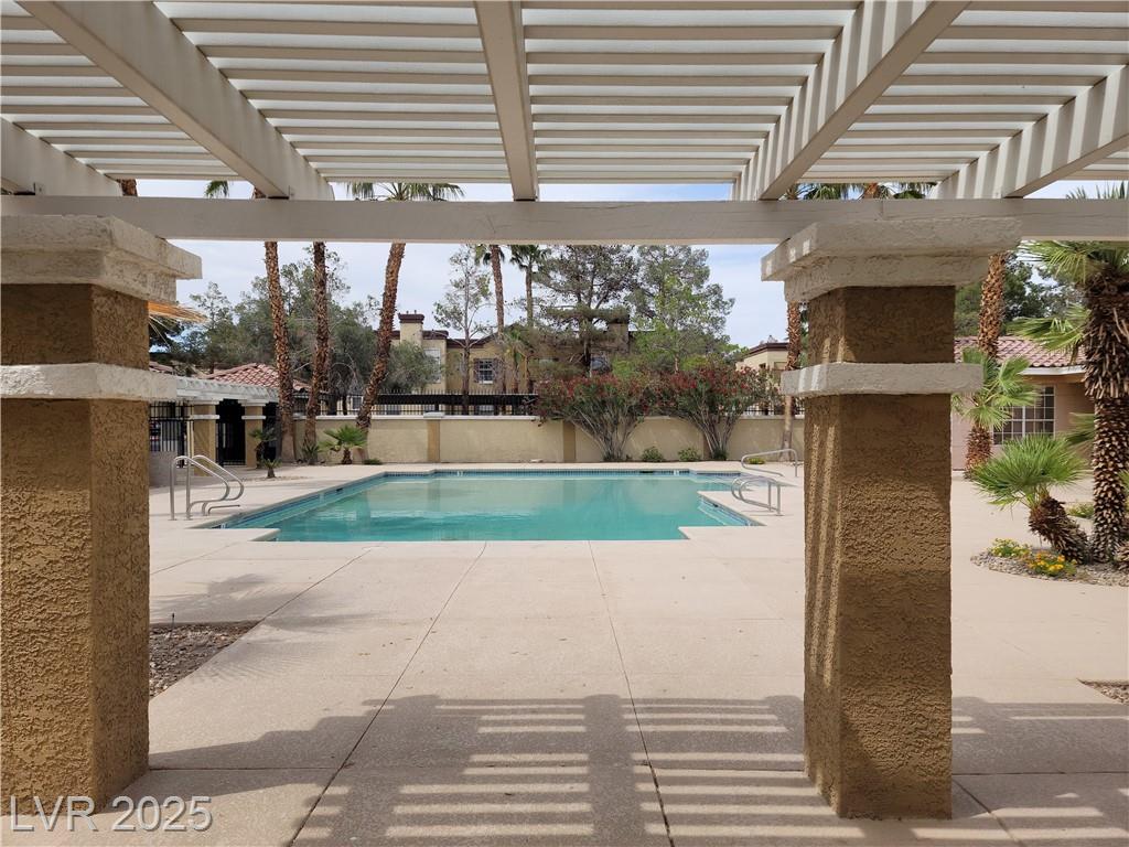 Opportunity is knocking with this excellent ground-floor condo in Northwest Las Vegas, featuring an open and functional floor plan. This two-bedroom, two-bath layout includes a spacious living/dining area and a fully equipped kitchen. The dining area features a ceiling fan and a door that leads to a spacious patio, creating a pleasant outdoor retreat. The primary bedroom features a spacious closet and a sliding door that opens to the terrace. The primary bathroom features a shower/tub combo, a vanity area with one sink, and indoor plumbing. The second bedroom is well-sized and conveniently located near the guest bath, which features a tub/shower combination, a full-size sink, and a toilet. Across the hall is the laundry area equipped with a full-size washer and dryer. Additional living highlights include assigned covered parking, access to the pool, playground, and mature landscaping throughout the community. The home is ideally positioned for access to shopping, freeways, & bus lines.