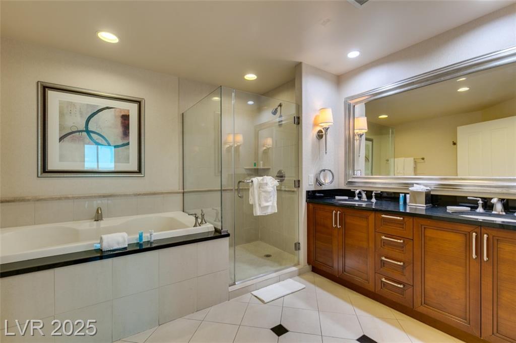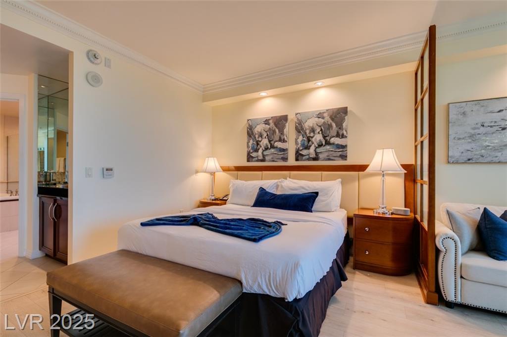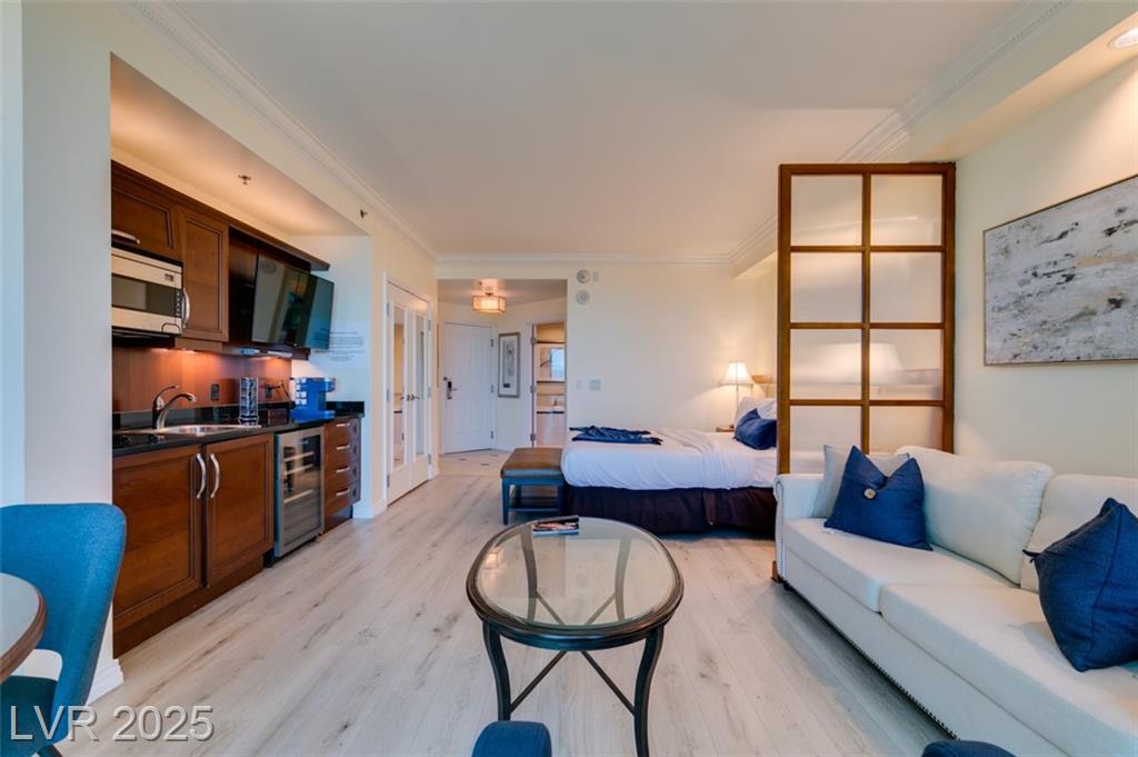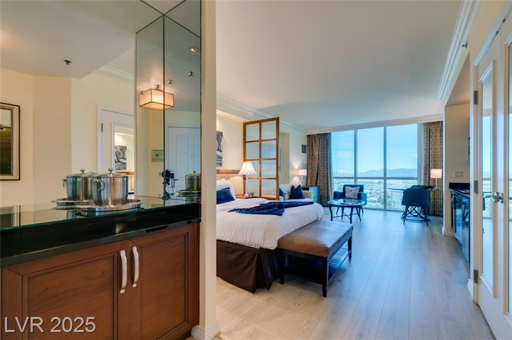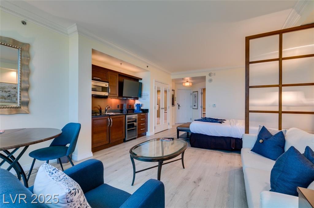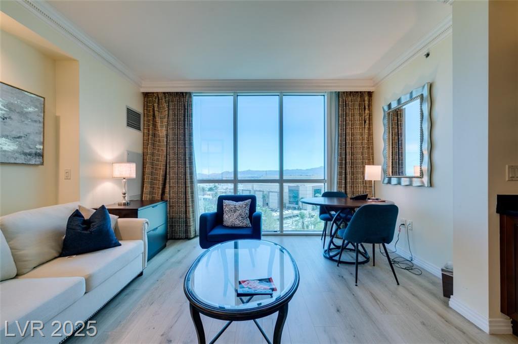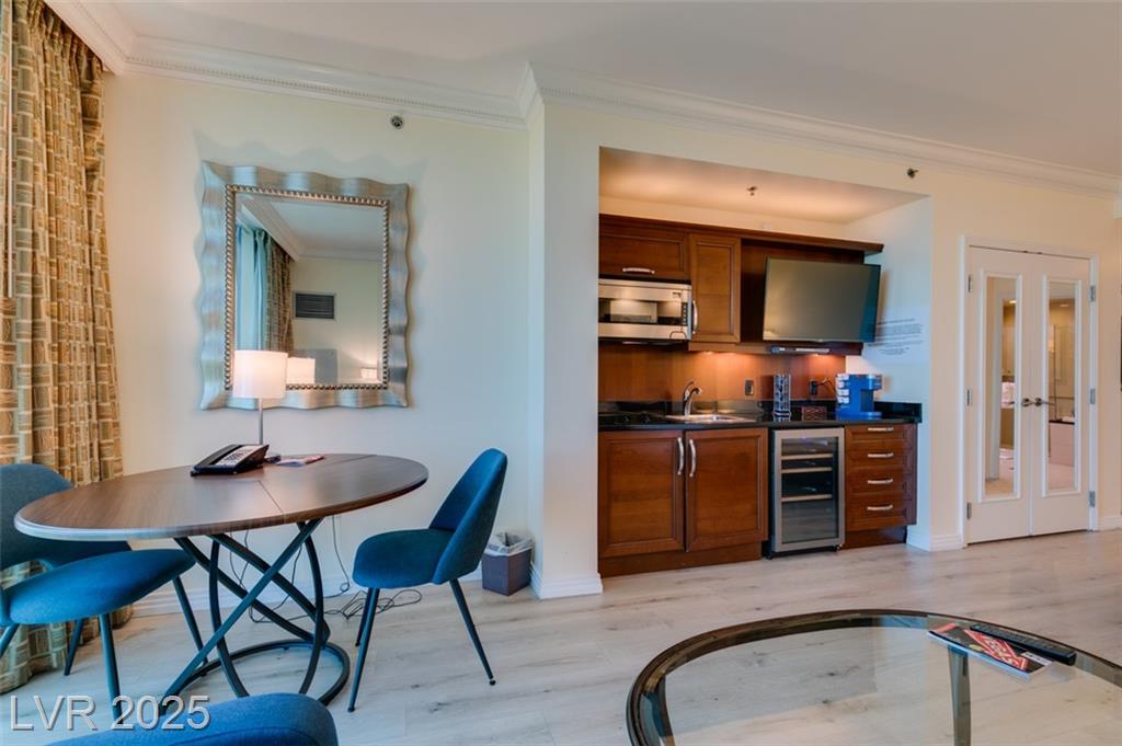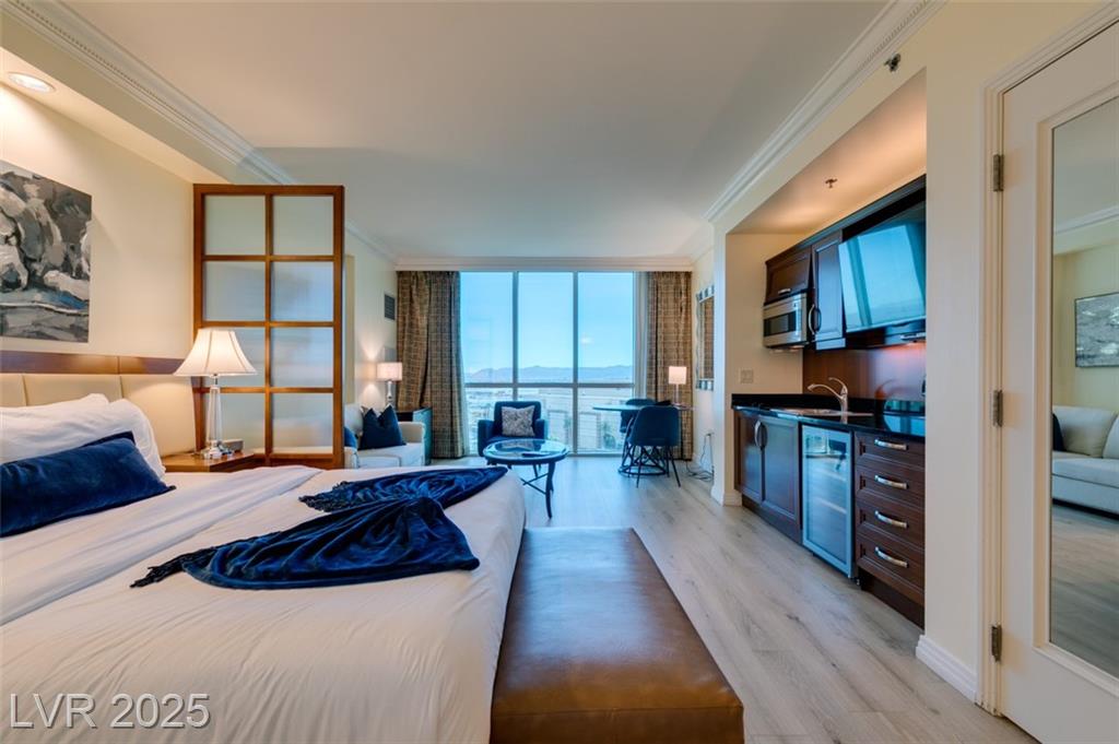 This panoramic mountain-facing suite offers stunning views of Topgolf and MGM’s newly redesigned Palm Tree Beach Club! Unit has recently been updated with fresh paint throughout, along with LVP flooring installed! Fully furnished and turnkey, it features a kitchenette with granite countertops, stainless steel appliances, two-burner cooktop, microwave, refrigerator, and sink, plus a built-in entertainment center, closet with safe, and extra bedding. The oversized bathroom includes double sinks, Jacuzzi tub, and walk-in shower, creating a spa-like retreat. Comfortably sleeps four with a king bed and pullout sleeper sofa. Owners and guests enjoy three private heated pools & spas with cabanas, fitness center, lounge, bar, concierge, valet, Starbucks, and laundry facilities. Connected to MGM Grand, Lazy River, fine dining, casino, and Grand Spa. Rental options include the onsite program, Airbnb, or third-party management, making this an ideal investment or vacation getaway.