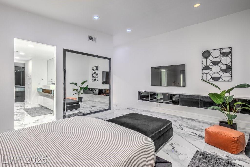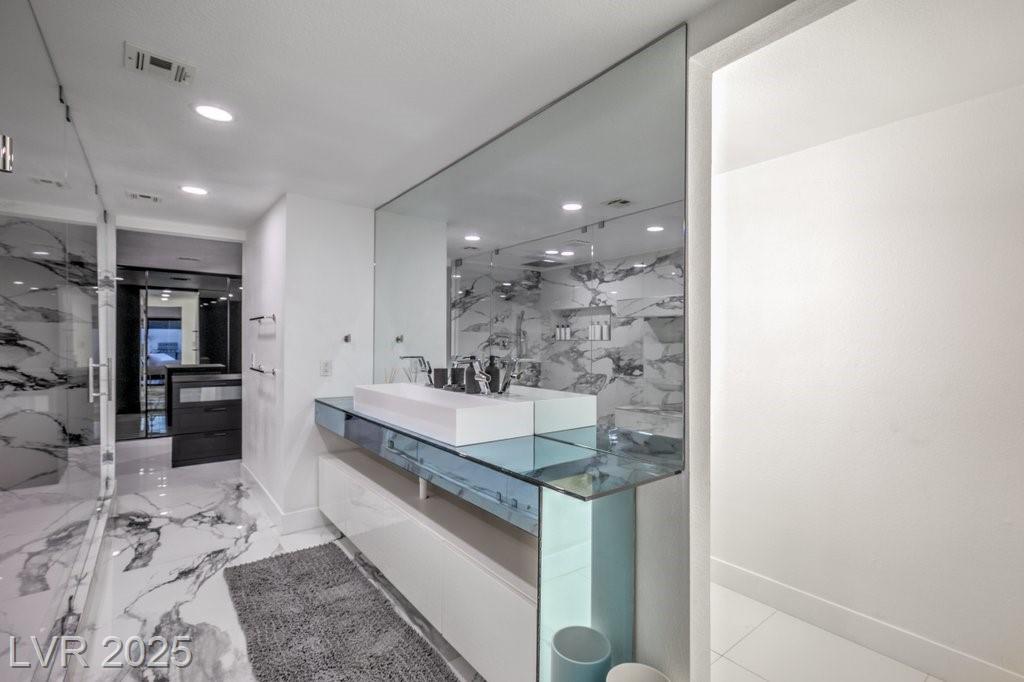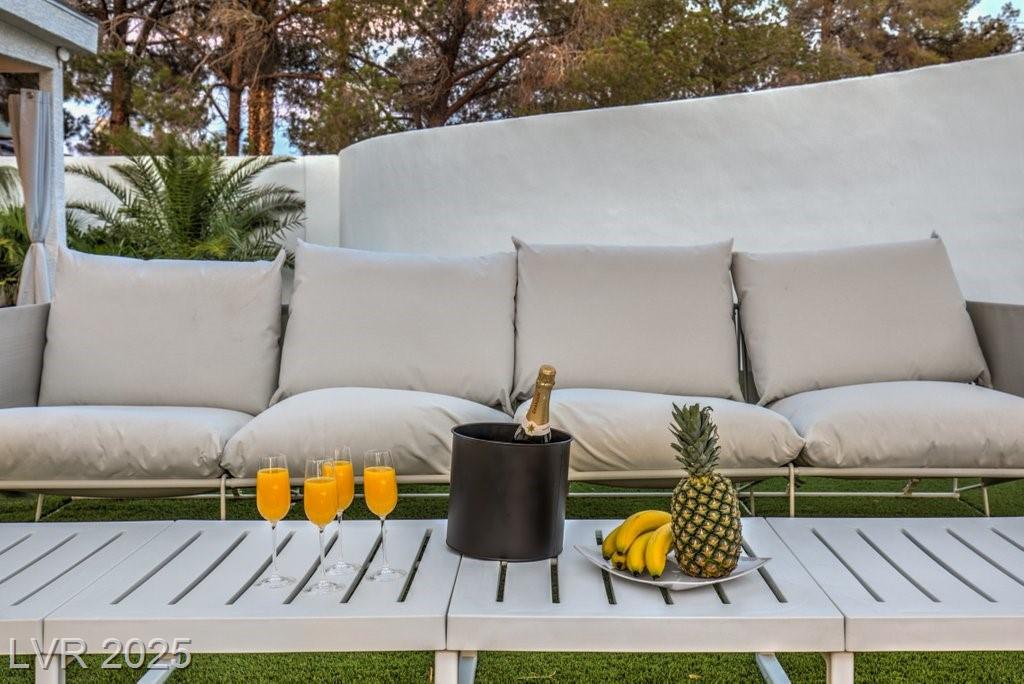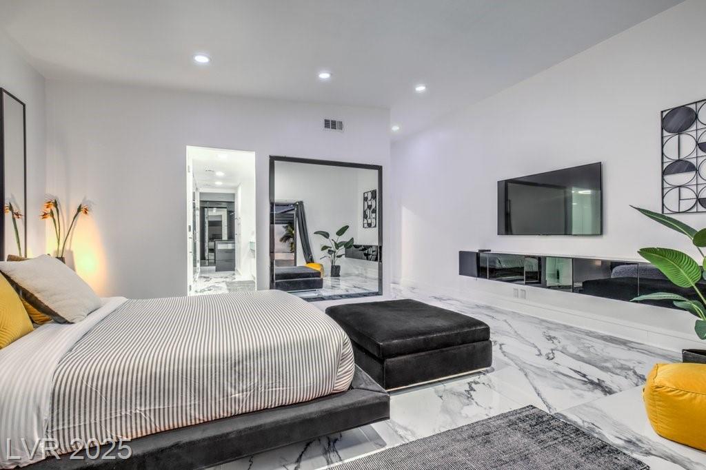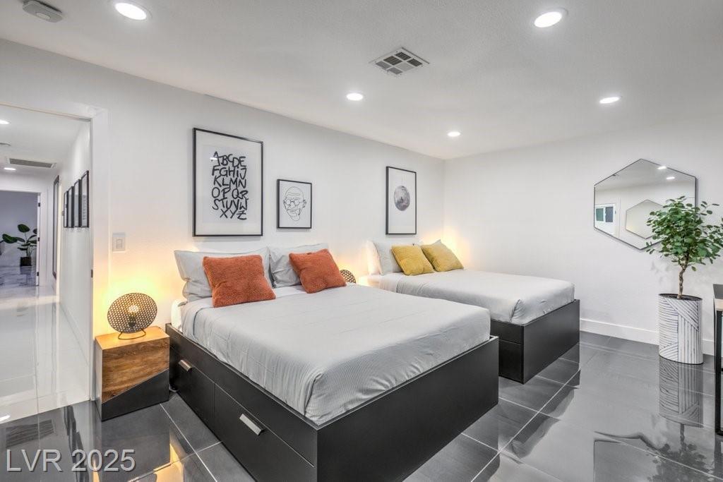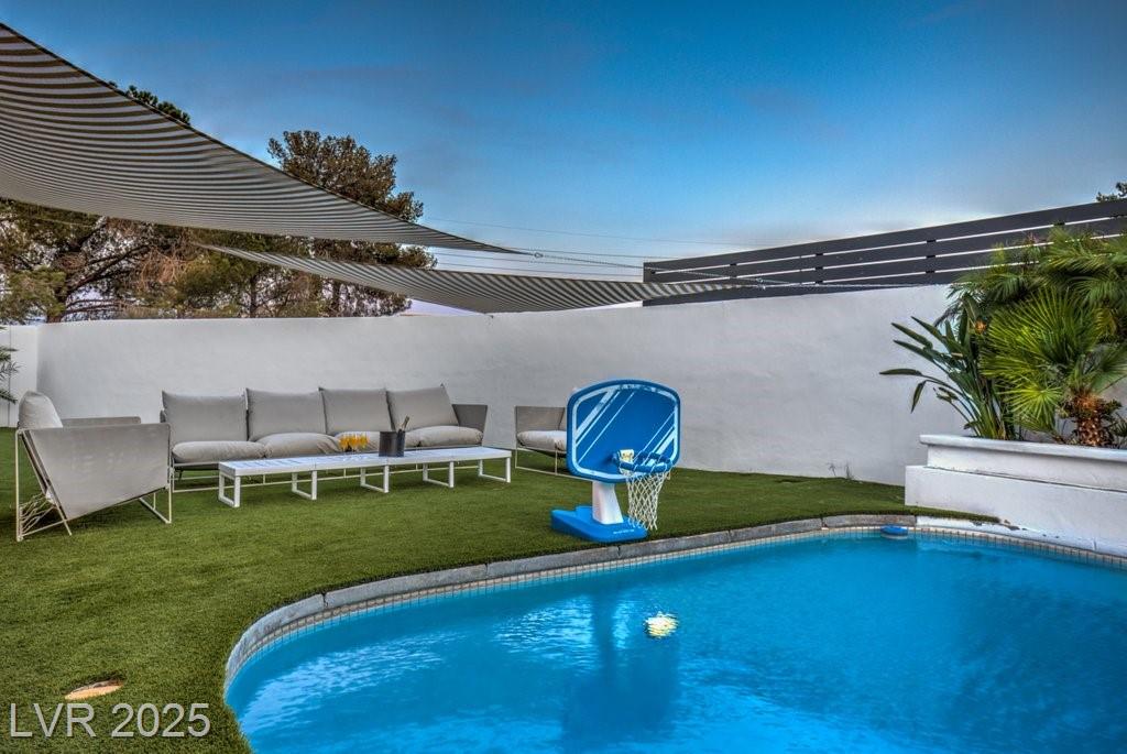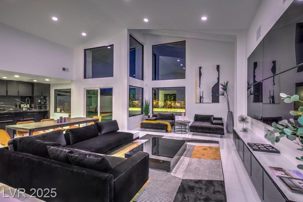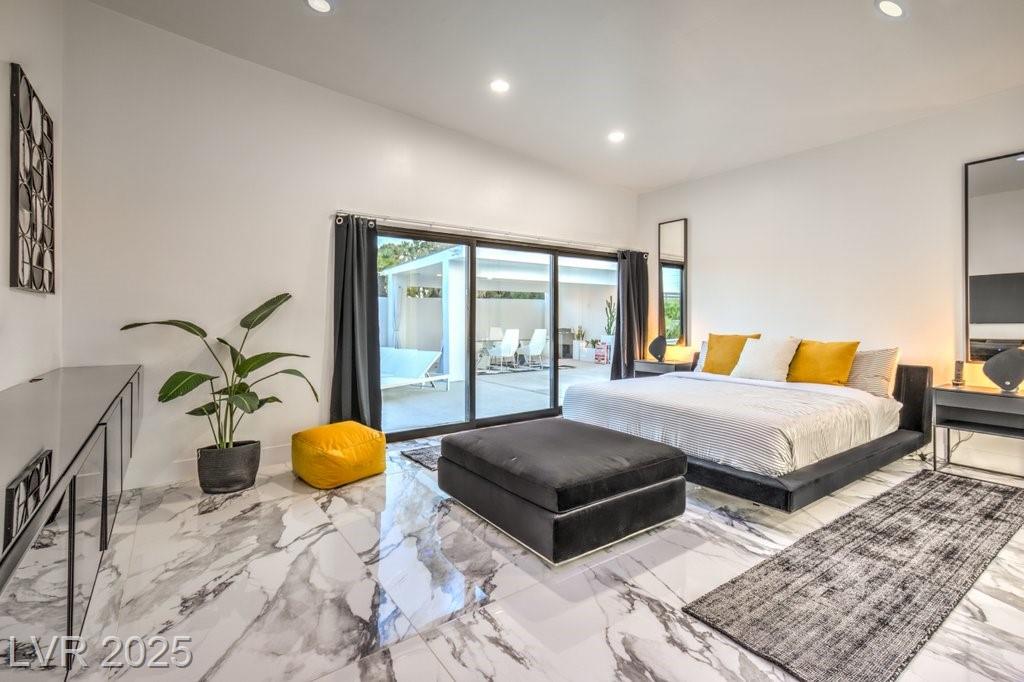 Set on a rare half-acre lot with no HOA, this ultra-modern single-story estate has been completely reimagined with impeccable design and high-end finishes. Offering 5 bedrooms and 4.5 bathrooms, the home is as functional as it is stunning. There are two primary suites—one tucked away behind the kitchen for ultimate privacy, and the main suite designed as a spa-like retreat with a 100 SF marble shower, lighted vanity lounge, and a custom walk-in closet. Soaring 12-foot ceilings with app-controlled LED lighting, a smart NEST system, and keyless entry elevate convenience throughout. Outdoors, enjoy a resort-style backyard with a heated pool and spa, a full-length linear fireplace, covered patio, and a private cabana with outdoor shower and ¾ bath. The property also includes a 4-car garage, RV parking with easy access, and ample space for toys or a workshop. Located minutes from the Strip, Allegiant Stadium, and the airport, this is modern Las Vegas living at its finest.