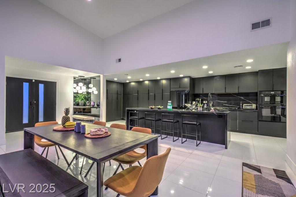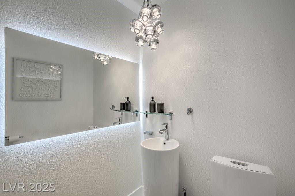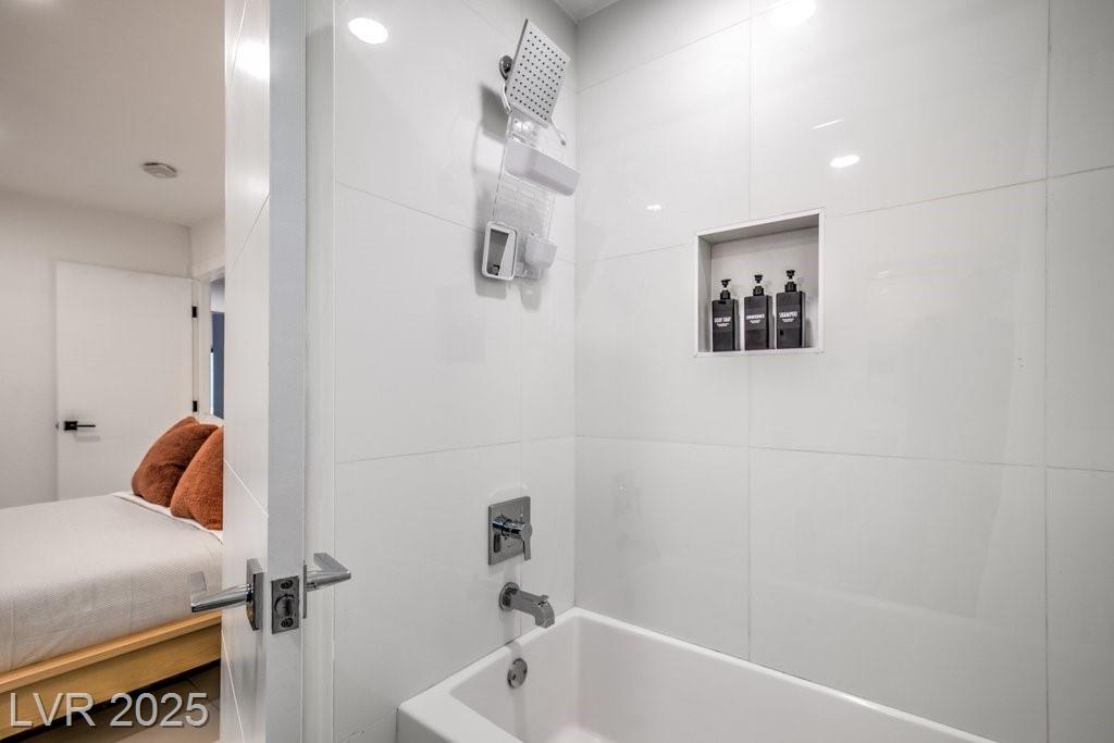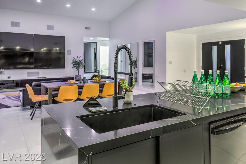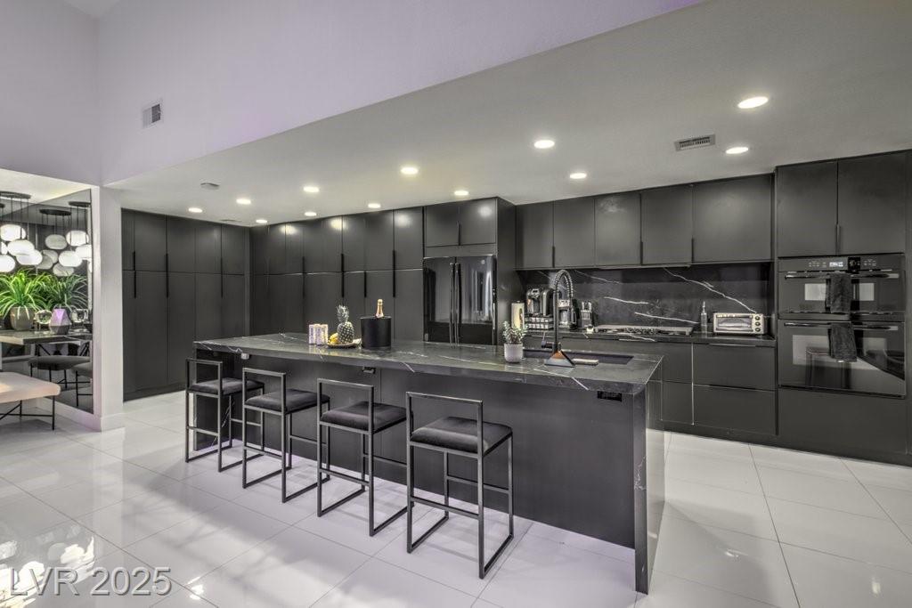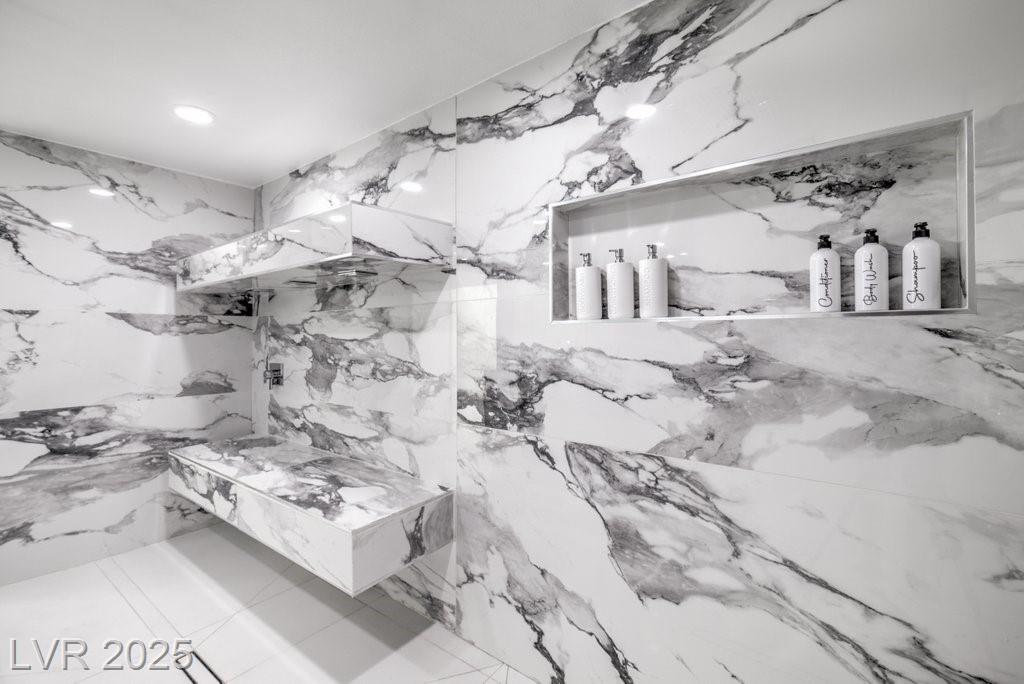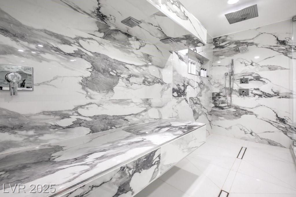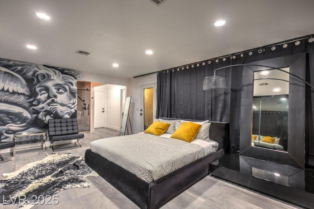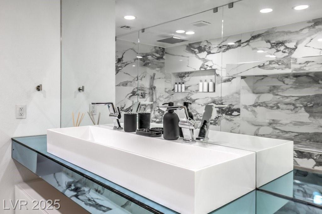Set on a rare half-acre lot with no HOA, this ultra-modern single-story estate has been completely reimagined with impeccable design and high-end finishes. Offering 5 bedrooms and 4.5 bathrooms, the home is as functional as it is stunning. There are two primary suites—one tucked away behind the kitchen for ultimate privacy, and the main suite designed as a spa-like retreat with a 100 SF marble shower, lighted vanity lounge, and a custom walk-in closet. Soaring 12-foot ceilings with app-controlled LED lighting, a smart NEST system, and keyless entry elevate convenience throughout. Outdoors, enjoy a resort-style backyard with a heated pool and spa, a full-length linear fireplace, covered patio, and a private cabana with outdoor shower and ¾ bath. The property also includes a 4-car garage, RV parking with easy access, and ample space for toys or a workshop. Located minutes from the Strip, Allegiant Stadium, and the airport, this is modern Las Vegas living at its finest.
