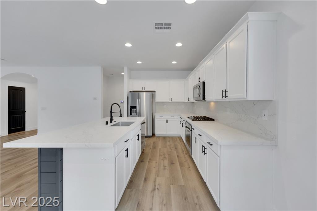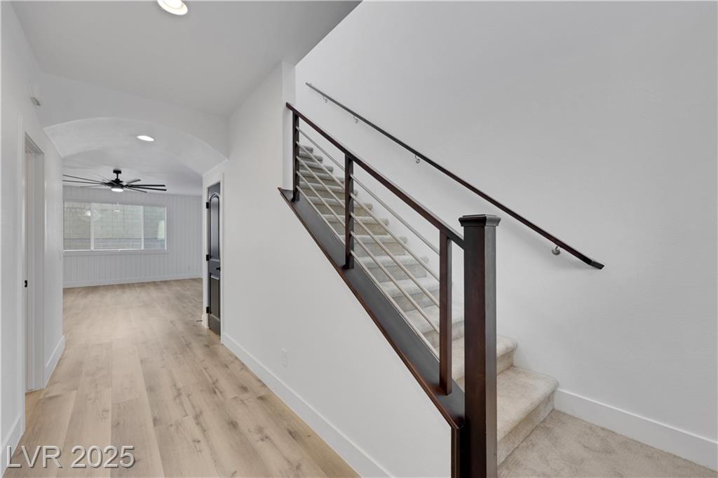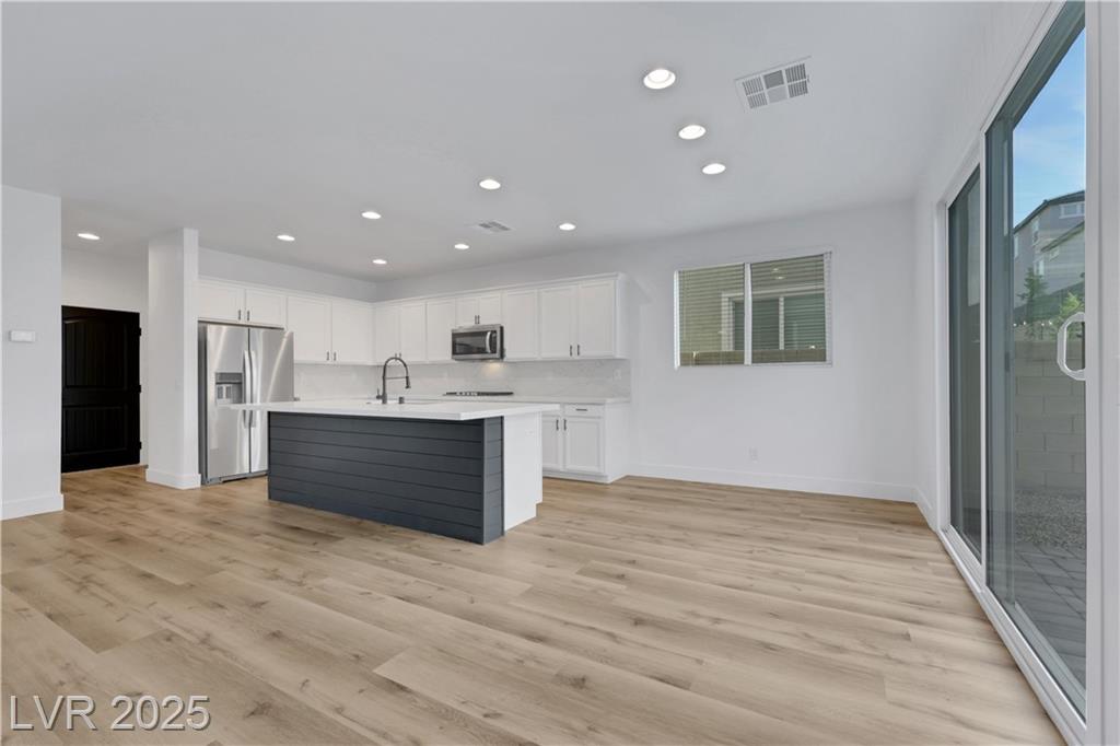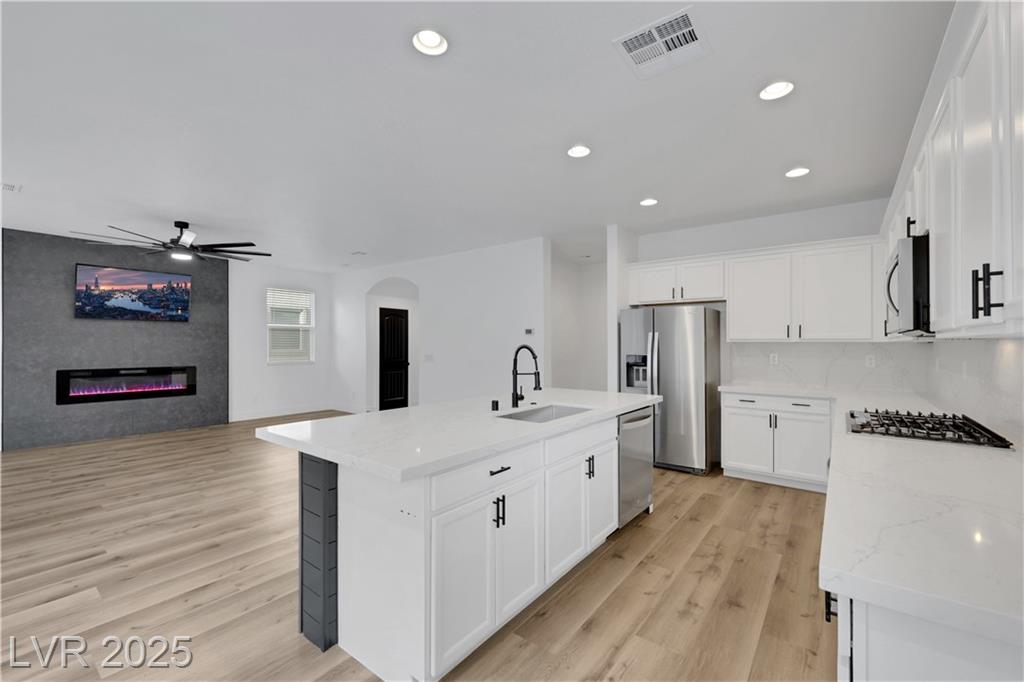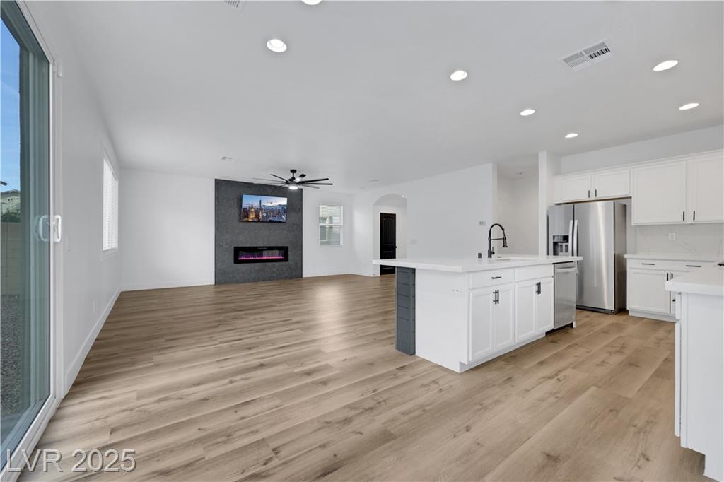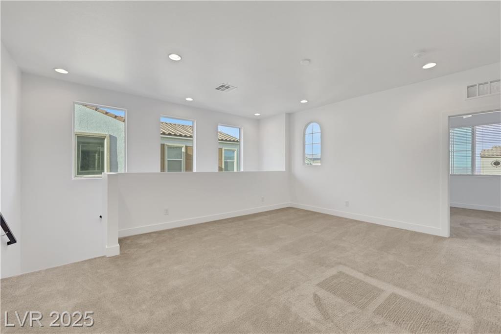 Gorgeous 2128 sq ft 2-story, 3-bed 2.5-bath home in NW's beautiful Skye Canyon. The home is highly upgraded with a new custom pop-out electric fireplace. TV Included, a shiplap accent wall, shiplap on the kitchen island, a new kitchen quartz countertops with full quartz backsplash, and a new upgraded vanity downstairs. Additionally, there is new vinyl plank flooring downstairs. The backyard features rock landscaping and synthetic grass.