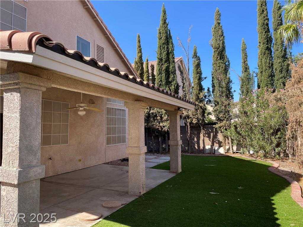 GEM in the desert! Well maintained 4 bedrooms house with matured landscaping & full size covered patio. Huge living room with high ceiling. Bed & bath downstairs. Primary bedroom has double closet & jet tub. Spacious loft on the 2nd floor. Shutter or cellular shade throughout. Located in the cul-de-sac of a quiet neighborhood. Easy access the freeway, minutes drive to the strip. This is the one you won't be disappointed!