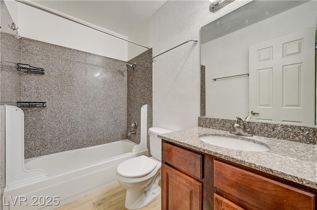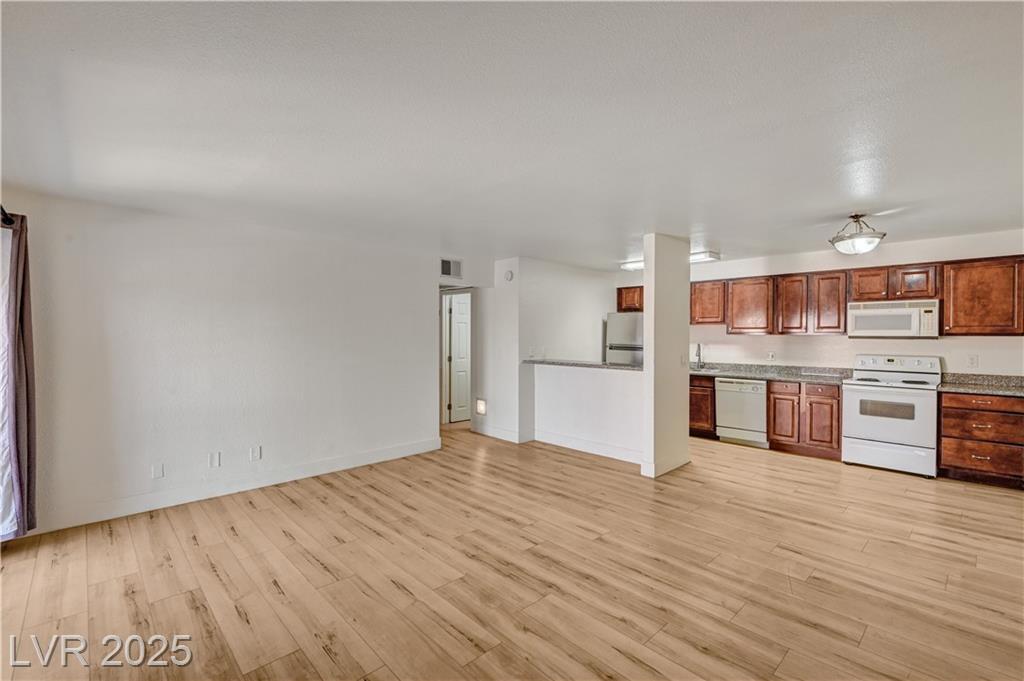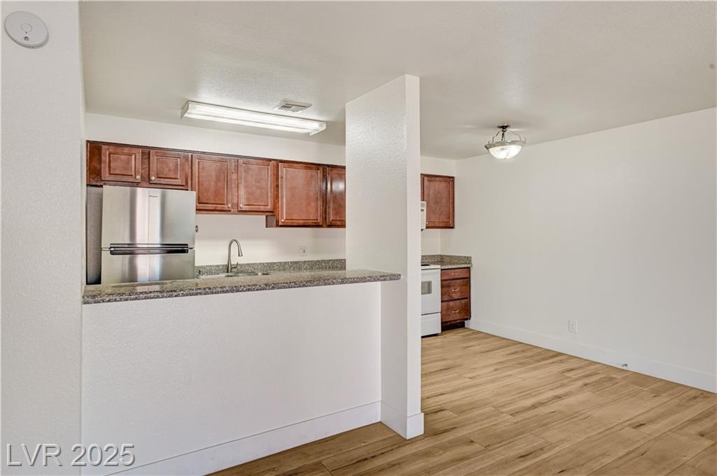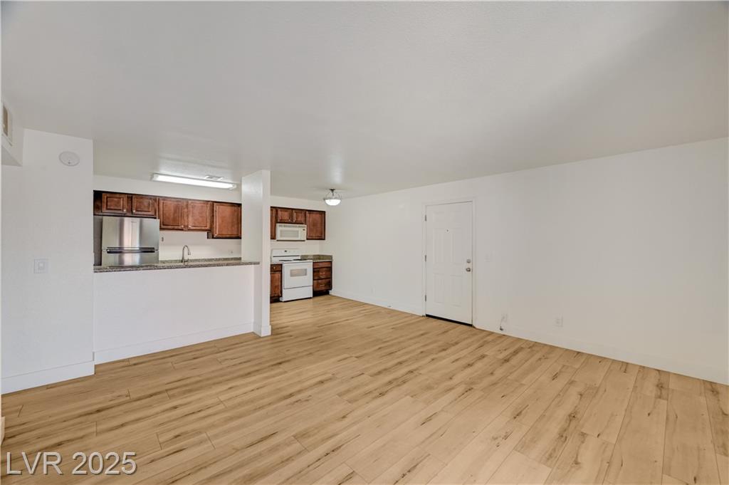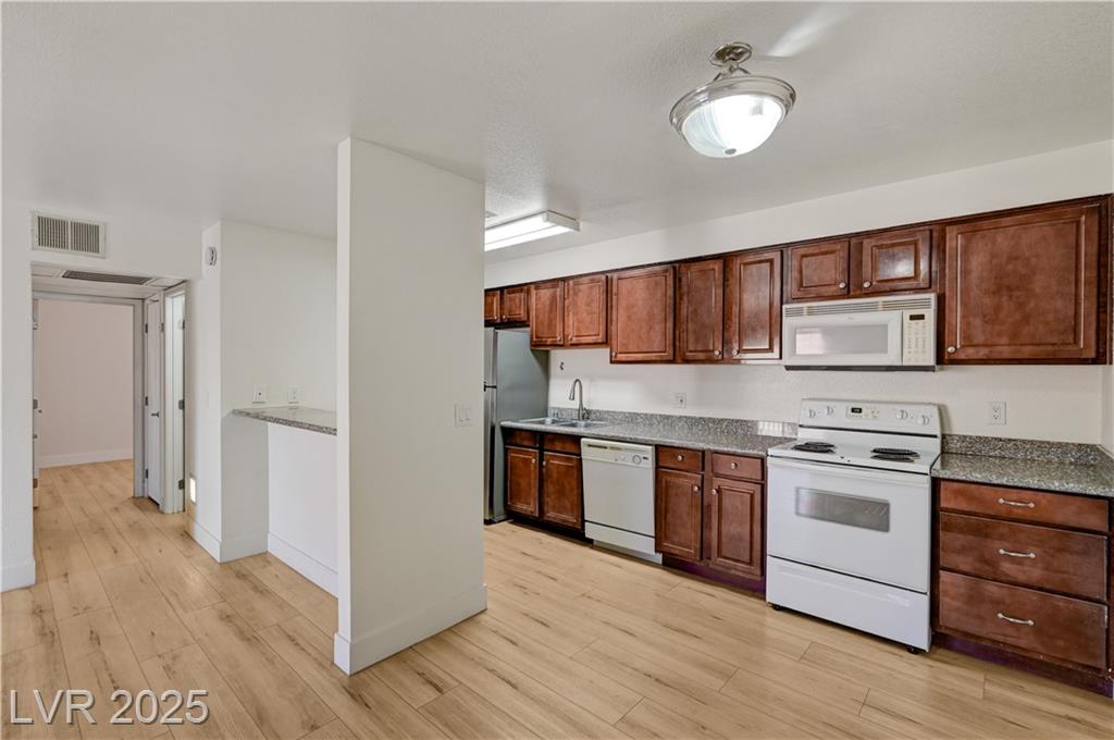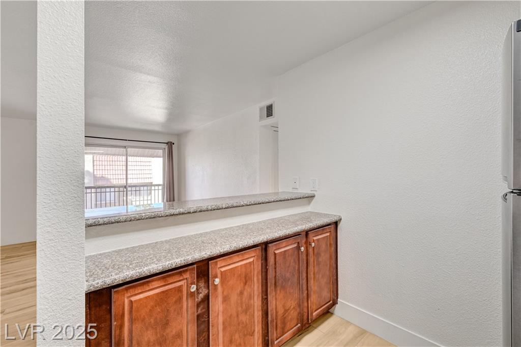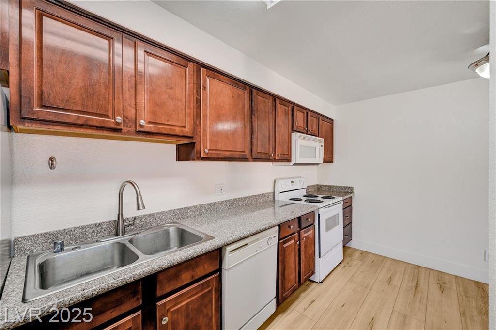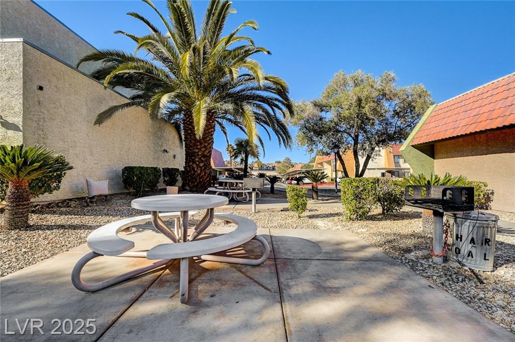 Resort Style Living in the Heart of Las Vegas! Discover this beautiful home, filled with natural light and featuring a north-facing balcony perfect for enjoying peaceful mornings or vibrant evenings. The kitchen boasts elegant granite countertops, a spacious breakfast bar, and abundant counter space, complemented by a stainless steel refrigerator purchased just last year. Light and neutral-toned luxury vinyl flooring throughout the home; carpet-free. Freshly painted within the past year, this home is move-in ready. Nestled within a guard-gated community, residents enjoy an array of amenities, including 6 pools, indoor and outdoor spas, saunas, cabanas, 5 tennis courts, 3 fitness centers, and 3 clubhouses. Additional conveniences include an indoor mailroom, outdoor barbecue areas, a playground, assigned covered parking, ample guest parking, and 24-hour security. Ideally located just minutes from the Strip, airport, major freeways, shopping, and dining.