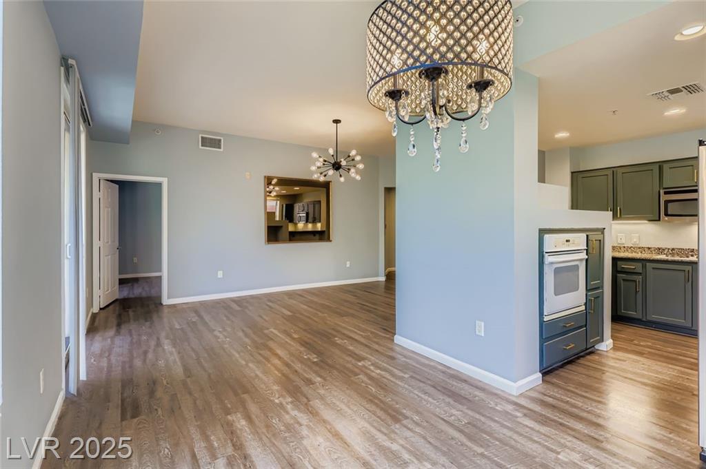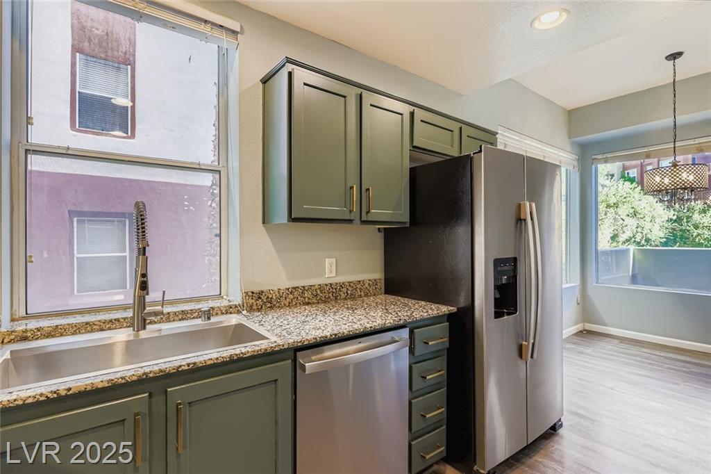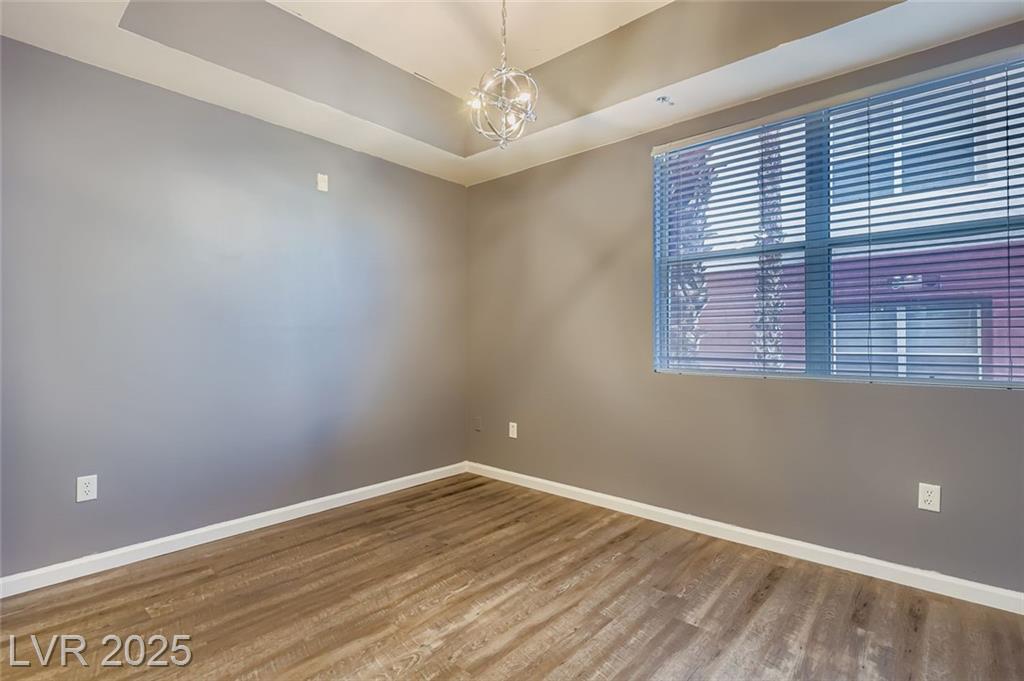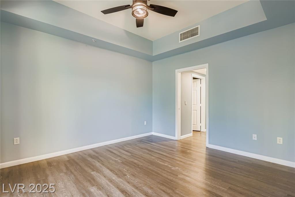 Just minutes from Allegiant Stadium, the Las Vegas Strip, and the future Brightline high-speed rail station, discover the exclusive guard-gated community of Park Avenue Condos. This elevated first-floor corner unit offers rare tree-lined views from an oversized balcony, extending to the dining area for a truly open and inviting feel. Inside, the home has been thoughtfully updated with fresh paint, luxury vinyl flooring, stainless steel deep sink, tankless water heater, water softener, built-in shelving, elegant chandeliers, and a ceiling fan in the spacious primary suite. Residents of Park Avenue enjoy a resort-style lifestyle with top-tier amenities, including two pools and hot tubs, a two-story fitness center, steam room, sauna, tennis and pickleball courts, and roving security. Convenience meets comfort with your own dedicated underground parking space. Come experience all that Park Avenue has to offer! Seller is related to a licensed NV Realtor.