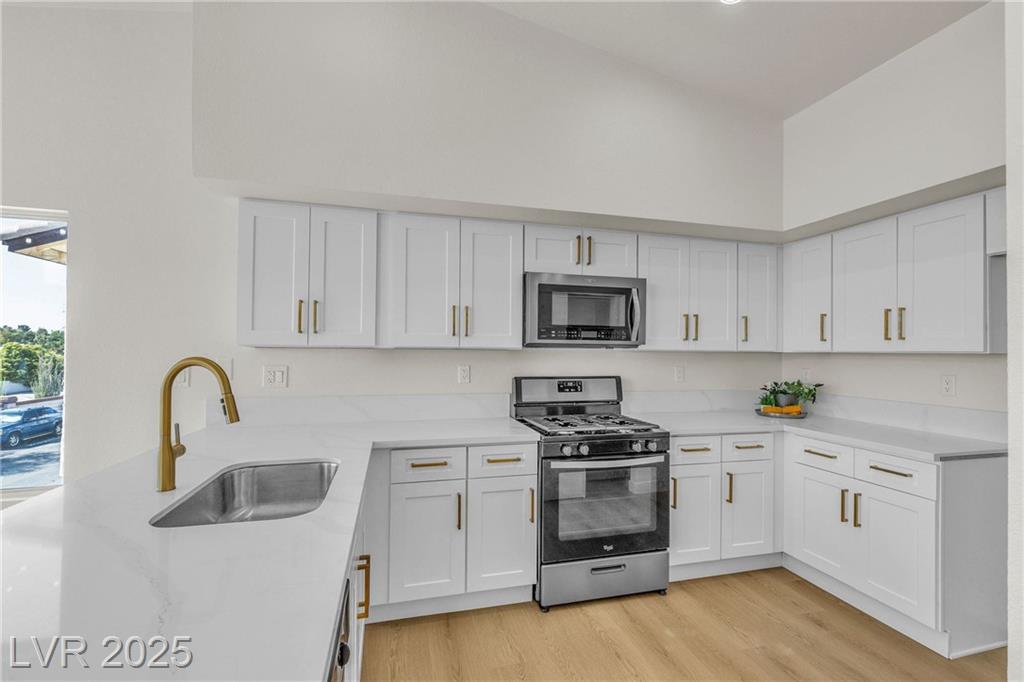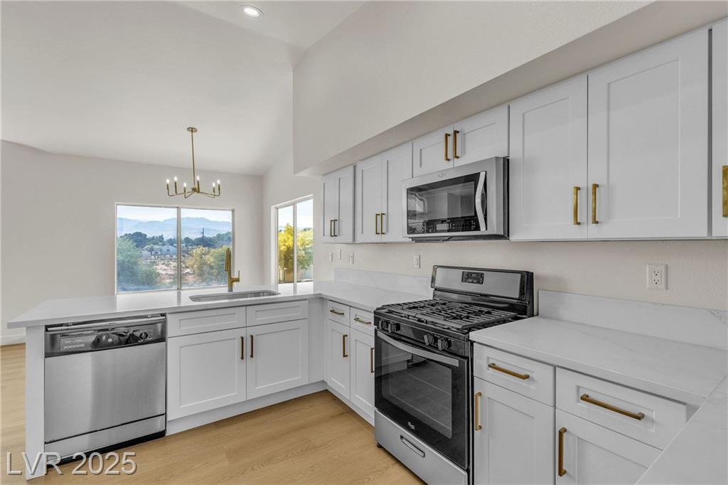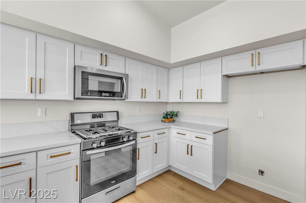 Step into style and comfort with this beautifully updated townhome, ideally located in a secure, guard-gated community. Enjoy the convenience of a private 1-car garage and abundant guest parking. Inside, the open-concept layout features modern laminate flooring, an eye-catching fireplace, and large windows that flood the space with natural light. The completely renovated kitchen is a chef’s dream, showcasing sleek quartz countertops, crisp white cabinetry, stainless steel appliances, ample storage, and a spacious pantry. Both bedrooms are generously sized and feature contemporary black ceiling fans. The primary suite boasts dual closets and a spa-inspired ensuite bathroom with a walk-in shower. This move-in-ready home is a must-see! Community amenities include 24-hour security and a large pool.