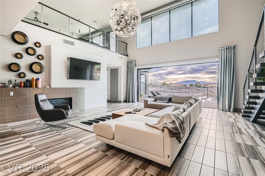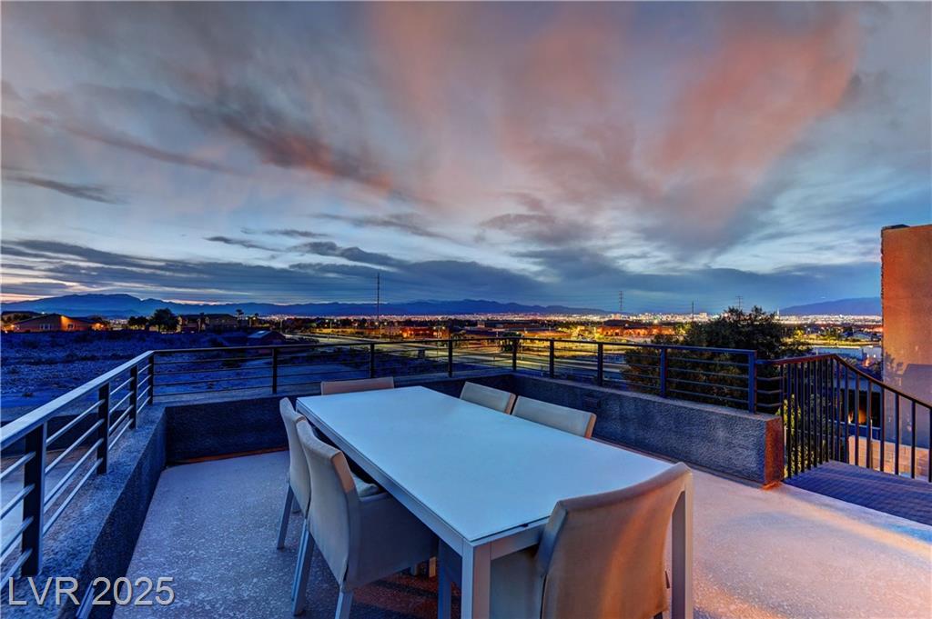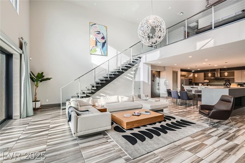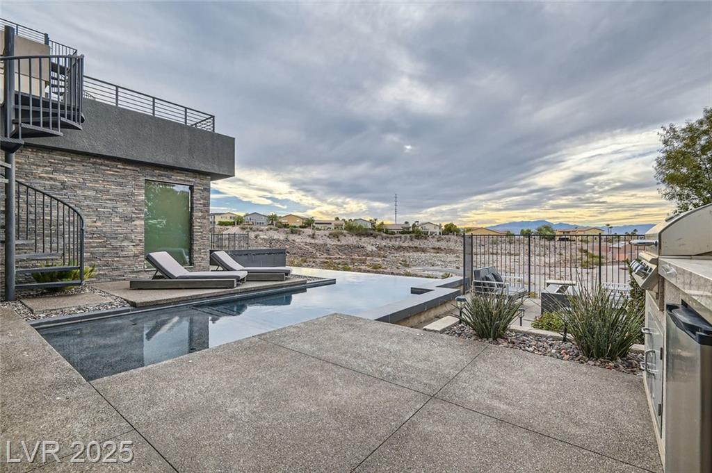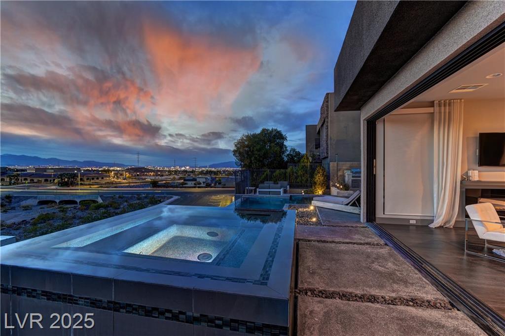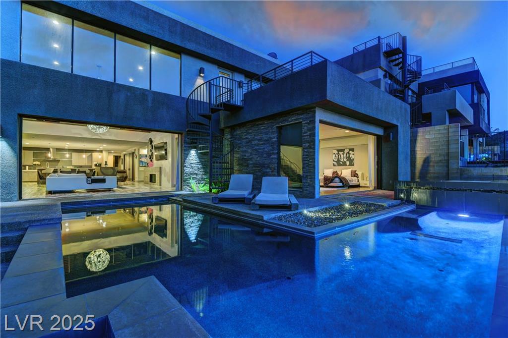 Experience luxury living in this fully furnished Blue Heron masterpiece in the gated Sky Terrace community, offering breathtaking Strip views and seamless indoor-outdoor living. A floating staircase leads to a loft with a built-in wet bar, while the gourmet kitchen boasts an L-shaped counter, central island, sleek cabinetry, and high-end Kitchenaid appliances, including a built-in espresso machine. The main floor primary suite opens to the infinity-edge pool and zero gravity spa, the bath featuring dual vanities, an oversized shower, and a custom walk-in closet. Enjoy a built-in BBQ, fire pit, pool table, and stunning infinity-edge pool and zero gravity spa outside. For ultimate security, the home features 24/7 monitored cameras, shatterproof window film, and electric shades. Live elevated in this exclusive Las Vegas retreat. Ideal location with easy access to Harry Reed International Airport, the Las Vegas strip, and excellent shopping and dining. *No Pets Allowed*