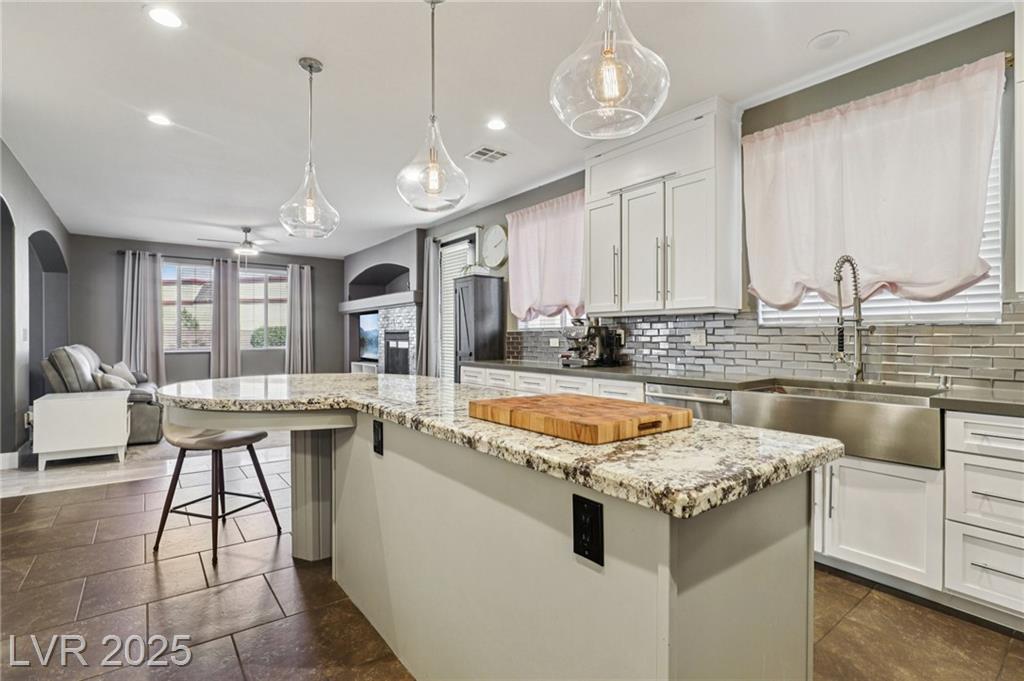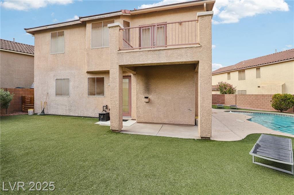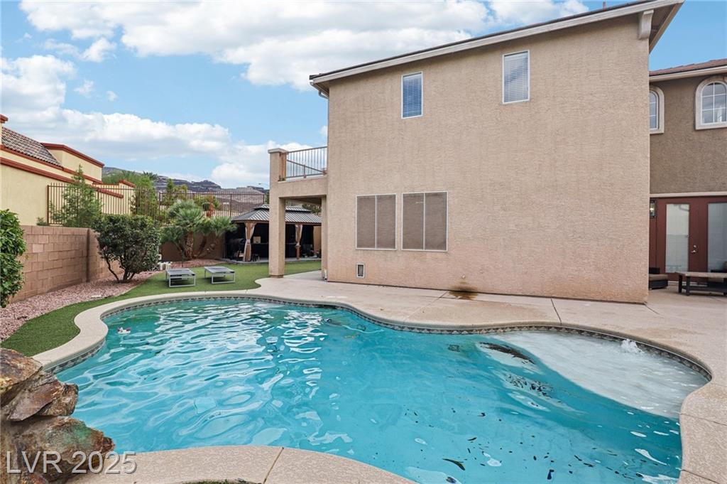 This beautifully designed 2-story home offers 3 spacious bedrooms and 3 elegant bathrooms, making it perfect for families or those who love to entertain. The large, open-concept kitchen boasts a sleek, oversized island that serves as both a functional workspace and a focal point for gatherings. The upgraded countertops, cabinetry, and high-end appliances make this kitchen a chef's dream. The Primary suite is a private retreat, featuring a luxurious en-suite bathroom with modern fixtures, a spacious walk-in shower, and a soaking tub with a mountain view. The additional bedrooms are equally spacious, offering plenty of closet space and natural light. The backyard is designed for both leisure and entertainment, with a solar-heated pool that allows you to enjoy swimming year-round. The home is finished with upgraded flooring throughout. The updated kitchen and bathrooms are designed with the finest materials, ensuring both style and durability.