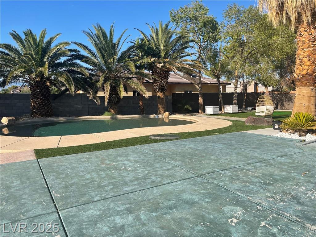 Step into elegance with this beautiful custom-built two-story home, perfectly situated on a half-acre lot in the south west of Las Vegas. This residence offers 7 bedrooms, 4.5 baths, and a 3-car garage, combining comfort and luxury. A circular driveway, front fountain, and lush turf lawn with mature trees welcome you in. Inside, soaring vaulted ceilings, high windows, and an open balcony overlooking the family room create a sense of light and space. The bay-window breakfast nook offers peaceful views of the backyard. Outdoors, enjoy your private retreat featuring a sparkling in-ground pool, beautifully landscaped grounds, creating a resort-style backyard perfect for entertaining or relaxing.