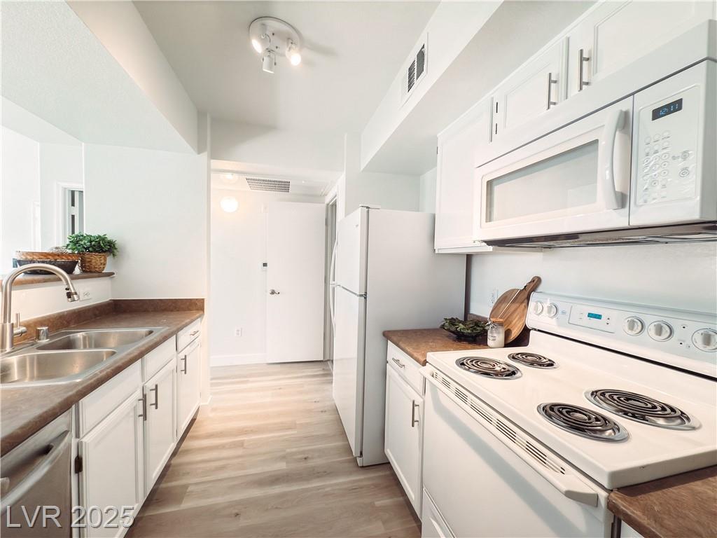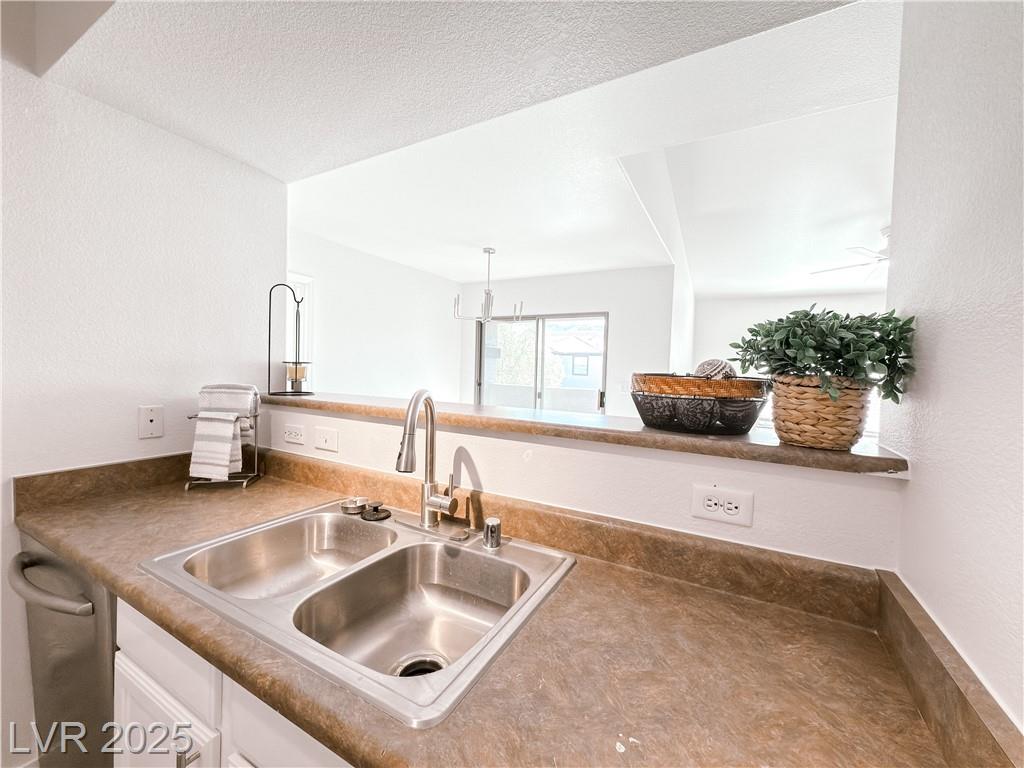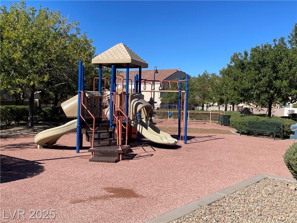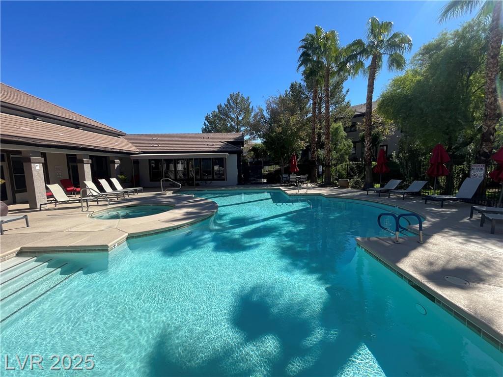 Bright and inviting, this condo has been updated with fresh paint, new LVP flooring, and modern lighting, providing an ideal canvas for your personal style. Vaulted ceiling in living rm & dining area enhance the spacious atmosphere, making it perfect for entertaining while you whip up delicious treats. Begin your day at the breakfast bar or on the balcony. Primary ensuite with 2 closets, garden soaking tub, a linen closet, ample counter space. The junior primary bdrm also includes a walk-in closet and attached bathroom with its own linen storage and a tub/shower combo. Your designated parking and additional guest parking are close by. Community amenities include a BBQ area, clubhouse, pool and spa, and a pet area. Just outside the gates, you'll find a grassy play area, a playground with slides and swings, and a picnic area. Henderson is consistently recognized as one of the best cities in America with excellent shopping and dining just minutes away. ALSO FOR SALE @ $269,000