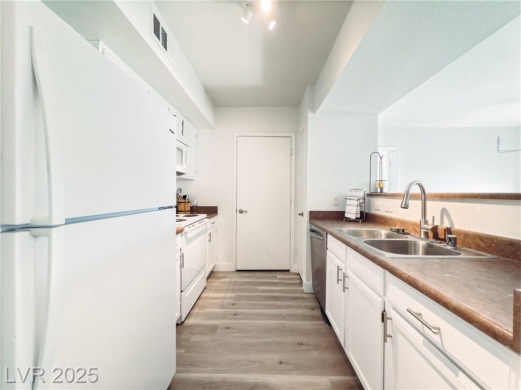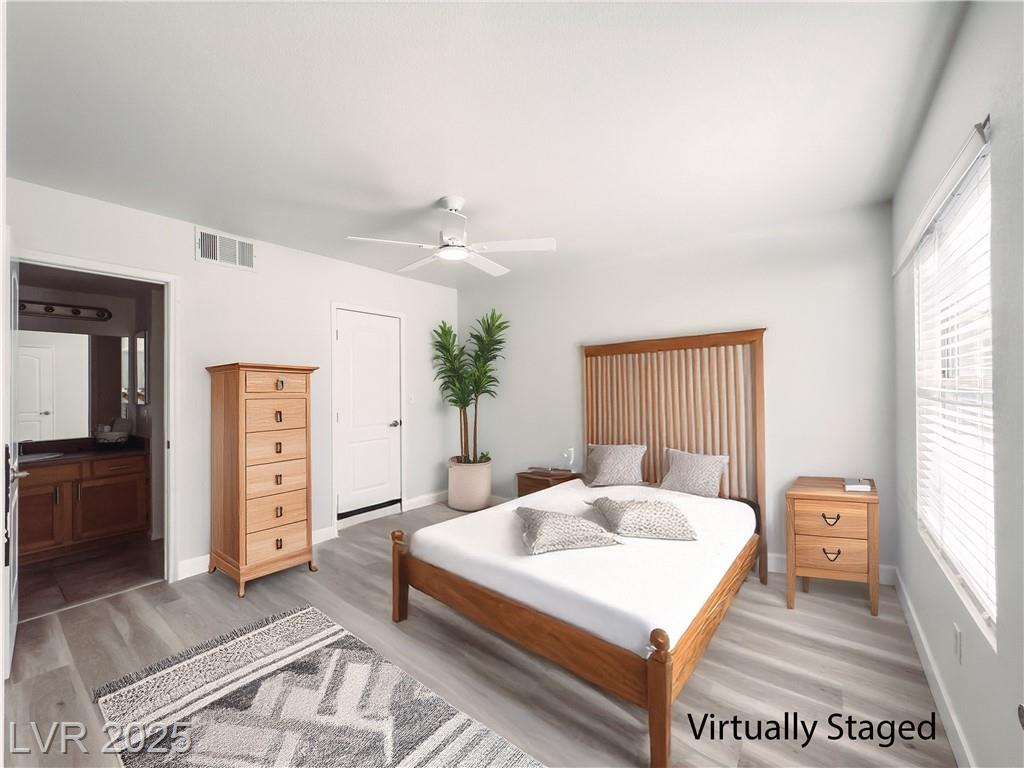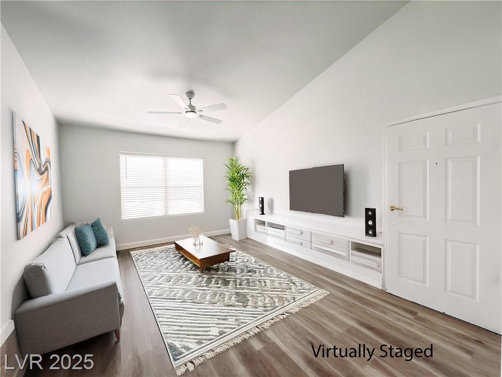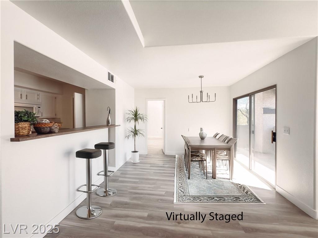 Bright and inviting, this condo has been updated with fresh paint, new LVP flooring, and modern lighting, providing an ideal canvas for your personal style. Vaulted ceiling in living rm & dining area enhance the spacious atmosphere, making it perfect for entertaining while you whip up delicious treats. Begin your day at the breakfast bar or on the balcony. Primary ensuite with 2 closets, garden soaking tub, a linen closet, ample counter space. The junior primary bdrm also includes a walk-in closet and attached bathroom with its own linen storage and a tub/shower combo. Your designated parking and additional guest parking are close by. Community amenities include a BBQ area, clubhouse, pool and spa, and a pet area. Just outside the gates, you'll find a grassy play area, a playground with slides and swings, and a picnic area. Henderson is consistently recognized as one of the best cities in America with excellent shopping and dining just minutes away. ALSO FOR SALE @ $269,000