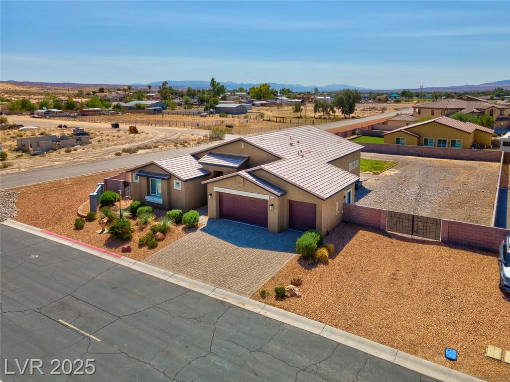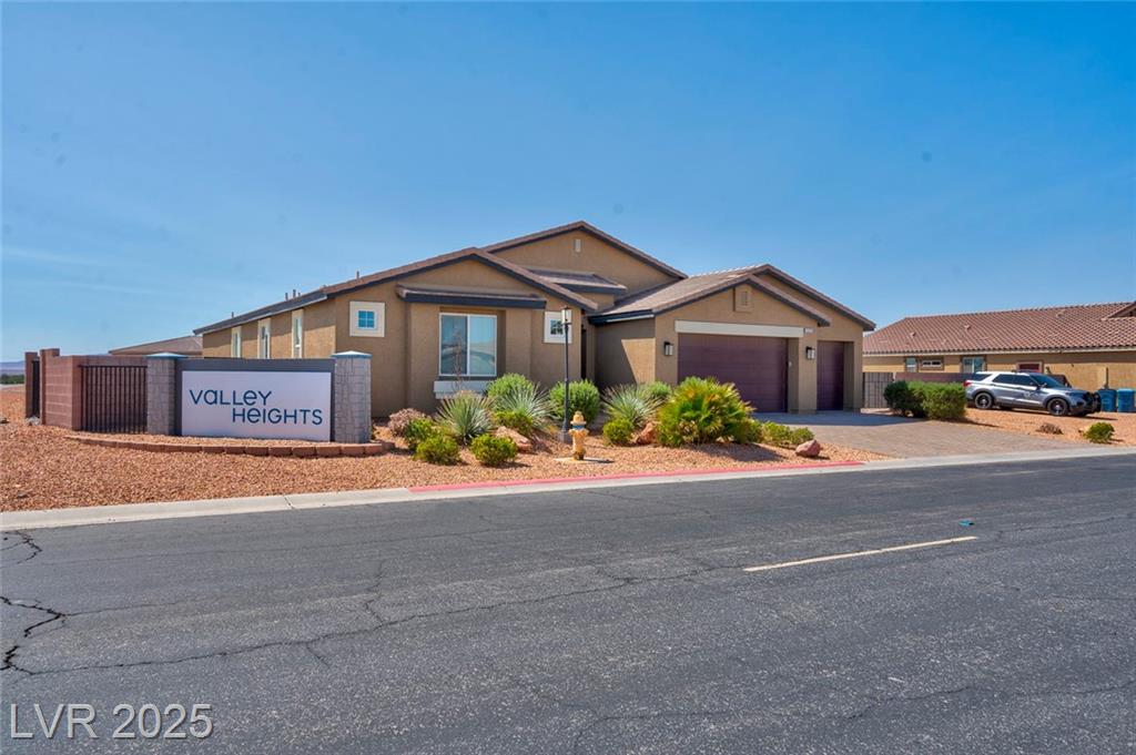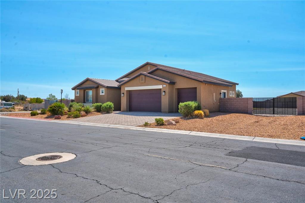 Just 50 minutes from Las Vegas, this beautifully designed single-story Logandale home offers space, style, and mountain views. The open-concept floor plan is filled with natural light, featuring a great room and chef’s kitchen with granite countertops, stainless steel appliances, walk-in pantry, rich cabinetry, and oversized island with seating. The private owner’s suite boasts dual walk-in closets, double vanities, soaking tub, and separate shower. Tile flooring in main living areas and neutral finishes throughout create a move-in ready feel. Outdoors, enjoy a 3-car paver driveway and walkway, expansive rear paver patio with three-panel sliding door access, plus RV parking. The finished 3-car garage includes epoxy floors, storage racks, and a water softener. Set on a large lot in a tranquil neighborhood with easy access to schools, shopping, and recreation.