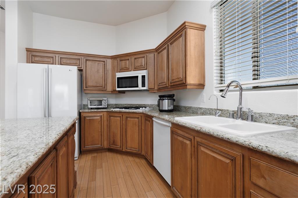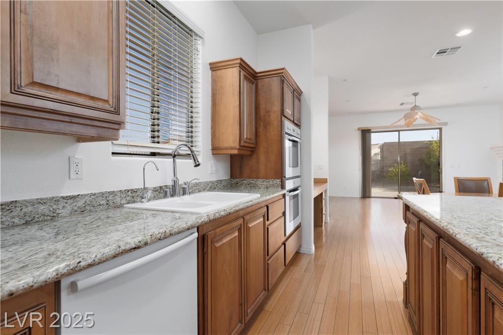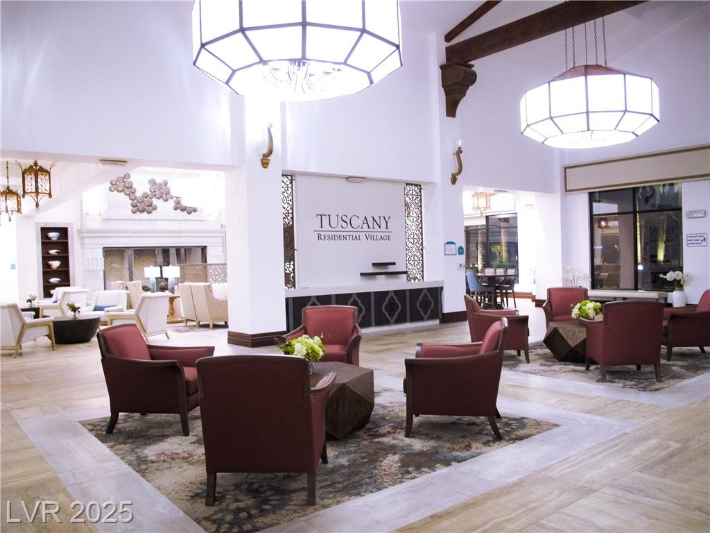 Resort style living in this fabulous new listing in guard gated Tuscany Village and Golf community. Enjoy exquisite mountain views and a 35,000 square-foot recreation center with full-size gym, pool, lap pool, spa, tennis/pickle ball, basketball, billiards room, playground, dog park and more. This desirable one story has hardwood floors throughout and open concept with kitchen with Bosch appliances, large granite island, beautiful mocha color cabinets, wall of cabinets for pantry.Appliances stay . Great room/living/dining area with gas fireplace and slider to premium pool sized landscaped lot with no neighbors homes overlooking yours. Primary bedroom with spa like bathroom suite, large granite shower, separate soak tub, double sinks, walk-in closet, additional slider to rear yard. Two additional bedrooms possible second primary with bathroom entrance, double French doors to front bedroom adds to curb appeal also courtyard look entrance at front. Original owner walking distance to club