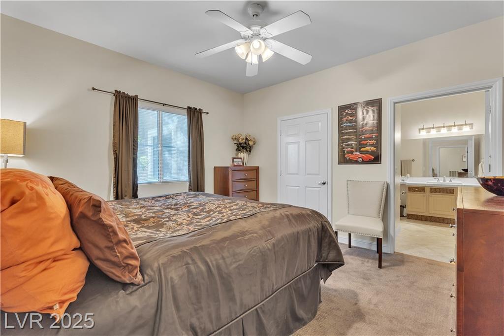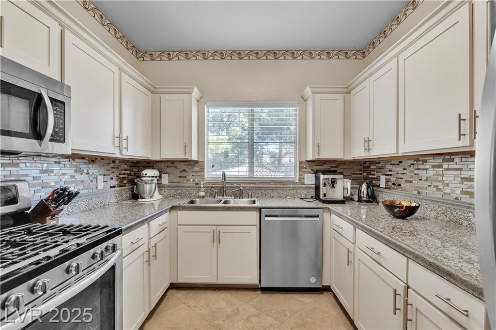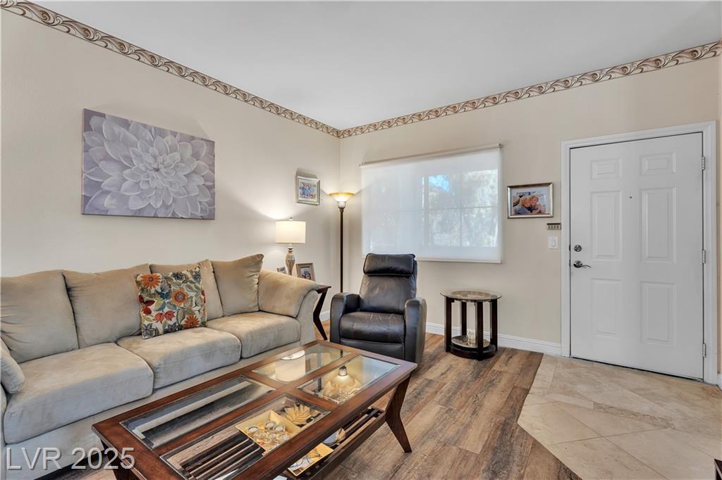 Welcome to this beautifully maintained 3-bed, 2-bath upper-level corner unit in the sought-after Spanish Palms community! This is a rare, fully furnished, move-in-ready home—sold with all furniture, appliances, and essentials included. Enjoy a spacious layout with wood-look vinyl flooring, granite countertops, stainless steel appliances, and a cozy gas fireplace. Both bathrooms are updated with modern finishes. The primary suite features an en-suite bath and ample closet space. Two additional bedrooms offer flexibility for guests or office use. Includes in-unit laundry, private balcony, and attached 2-car garage. Resort-style amenities: pool, spa, gym, clubhouse, dog park, and BBQ areas in a secure, guard-gated setting. Minutes from the 215 Beltway, shopping, dining, and the Strip.