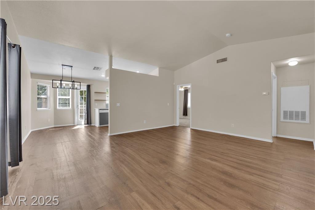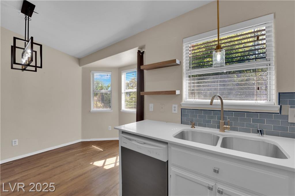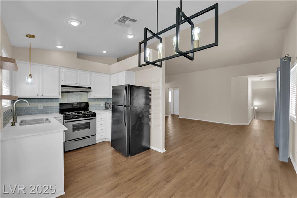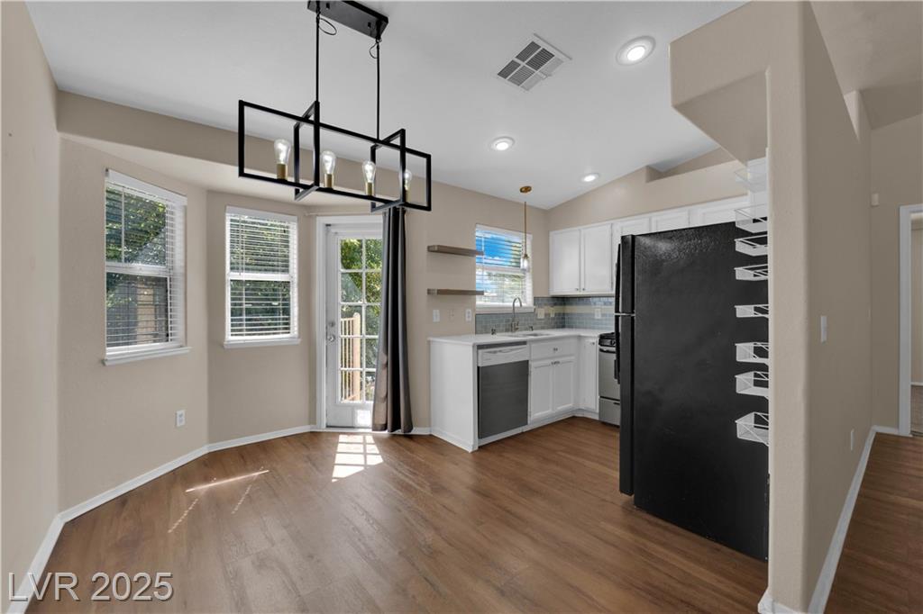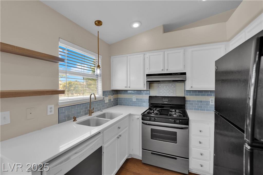 A rare Las Vegas find! This 3 bed, 2 bath condo lives like a house with an open floor plan, vaulted ceilings, and plenty of natural light. NEW HVAC and Water Heater installed. The kitchen shines with white cabinets, custom backsplash, modern lighting, and stainless-steel appliances. The spacious living and dining areas flow perfectly for entertaining or relaxing. The primary suite features a large closet and updated bath, while two additional bedrooms offer flexibility for guests or a home office. Step outside to your private backyard with mature landscaping and a spiral staircase—an uncommon perk for condo living! Add in a 1-car garage plus driveway parking and you’ve got both convenience and comfort. The community features a sparkling pool and is located near shopping, dining, and freeway access. This one has it all—style, function, and location!