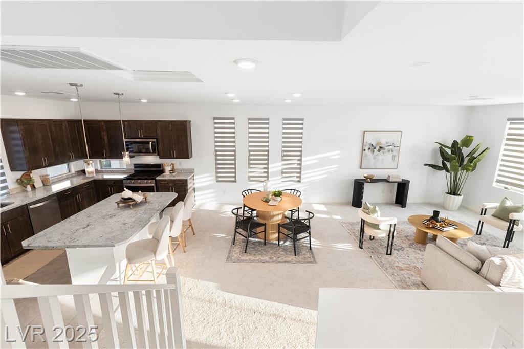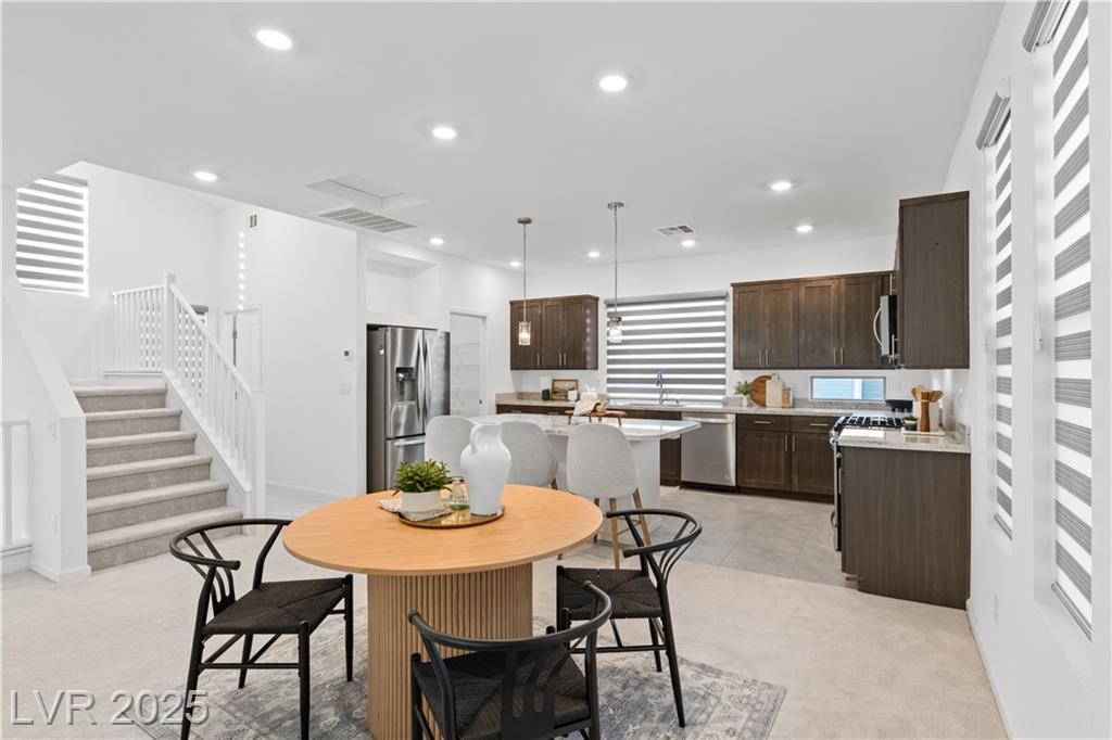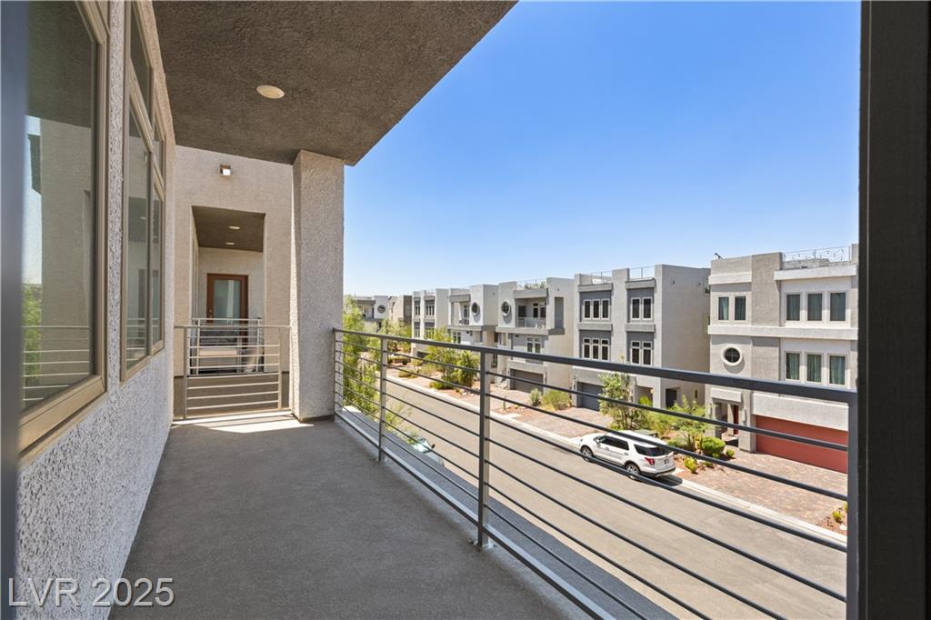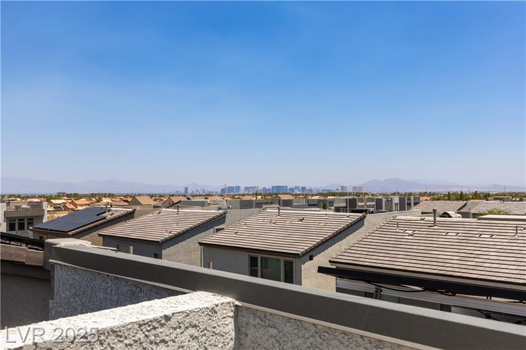 Located in the gated community of Whisper Trail! This modern 3-story home offers Owned FREE and CLEAR solar panels and a spacious rooftop deck with breathtaking Mountain and Las Vegas Strip views. Southwest Las Vegas - close access to the I-215, the new Durango Casino, and plenty of options for dining and entertainment! With 3 bedrooms and a versatile first-floor den/recreation area that can serve as a 4th bedroom, this home features 2.5 bathrooms, spacious backyard, a private balcony, and an open-concept layout designed for both entertaining and everyday living. The kitchen is equipped with custom countertops, a walk-in pantry, stainless steel appliances, sleek cabinetry, recessed lighting, and a large island with seating. Located less than 10 minutes from Exploration Peak Park, outdoor recreation is just around the corner. This energy-efficient home blends style, comfort, and convenience in one of Southwest Las Vegas' most desirable gated communities.